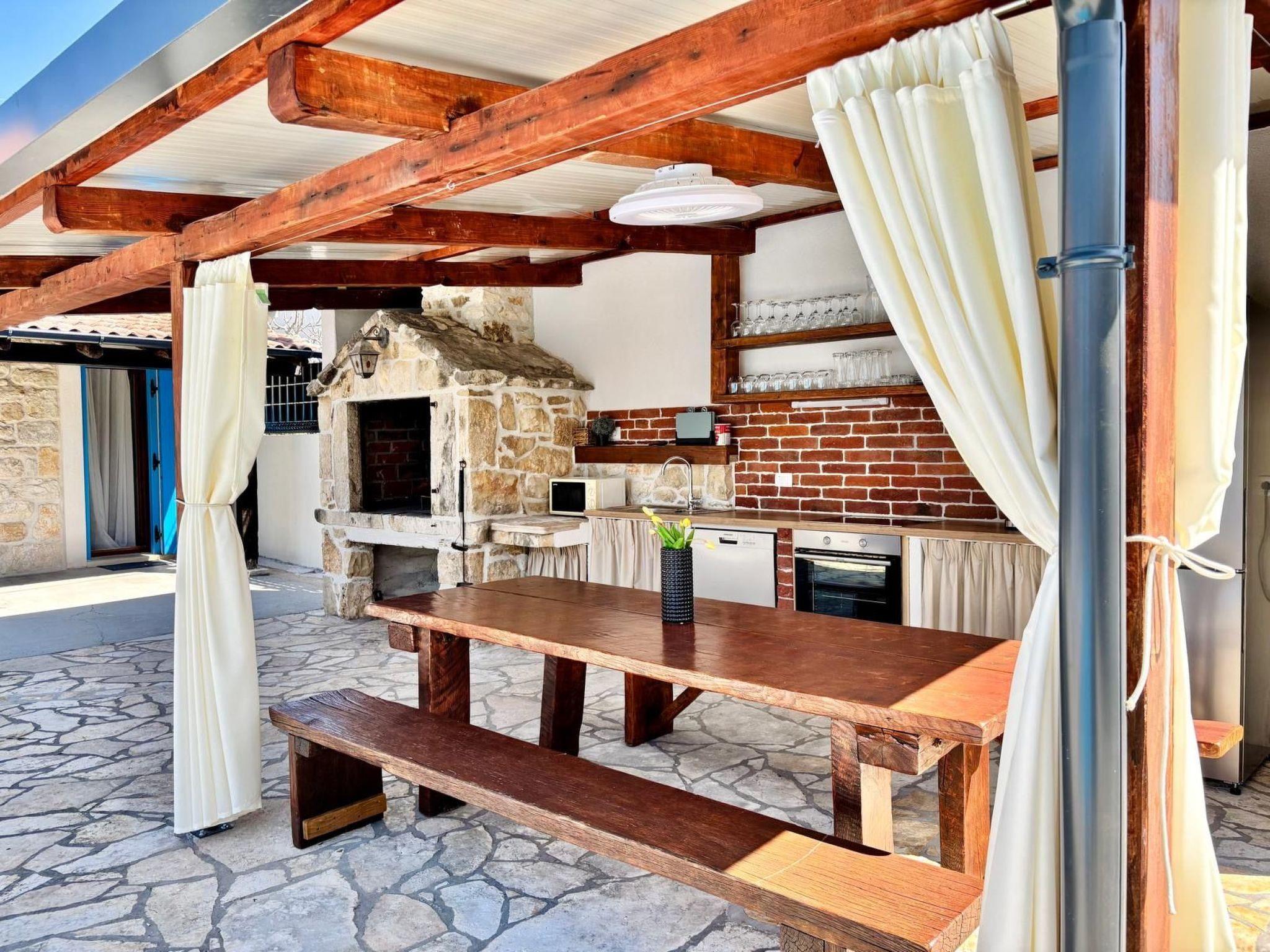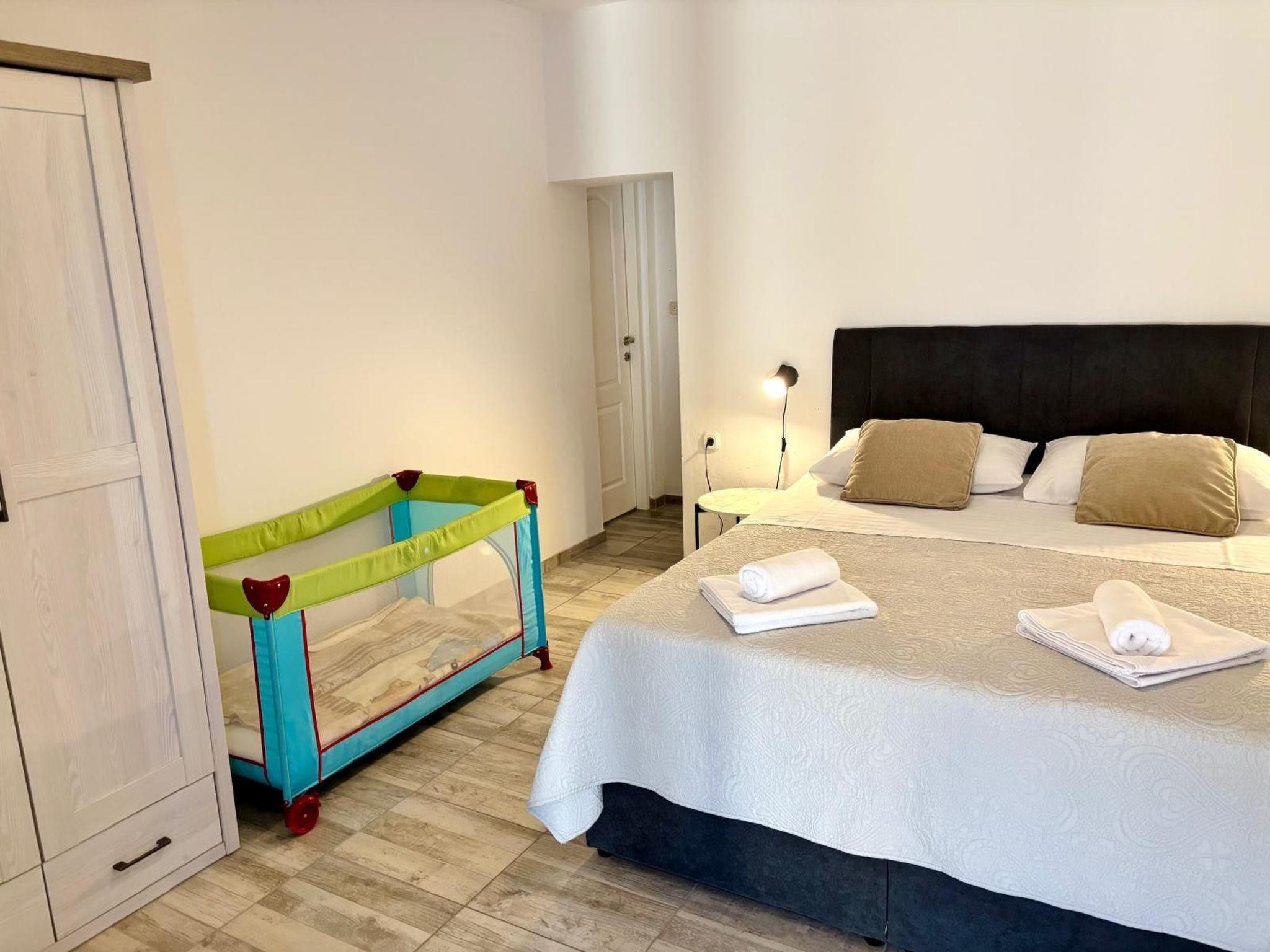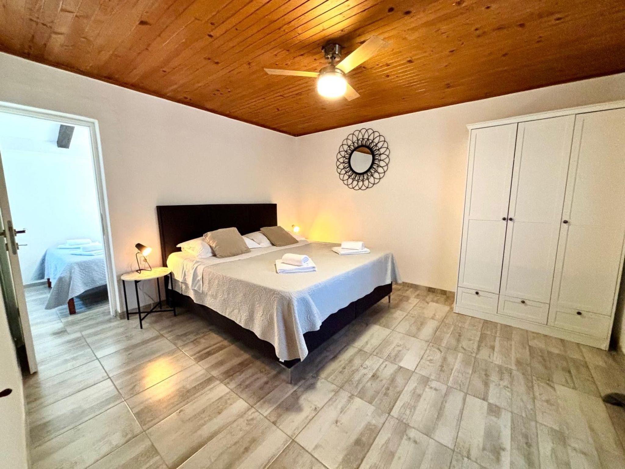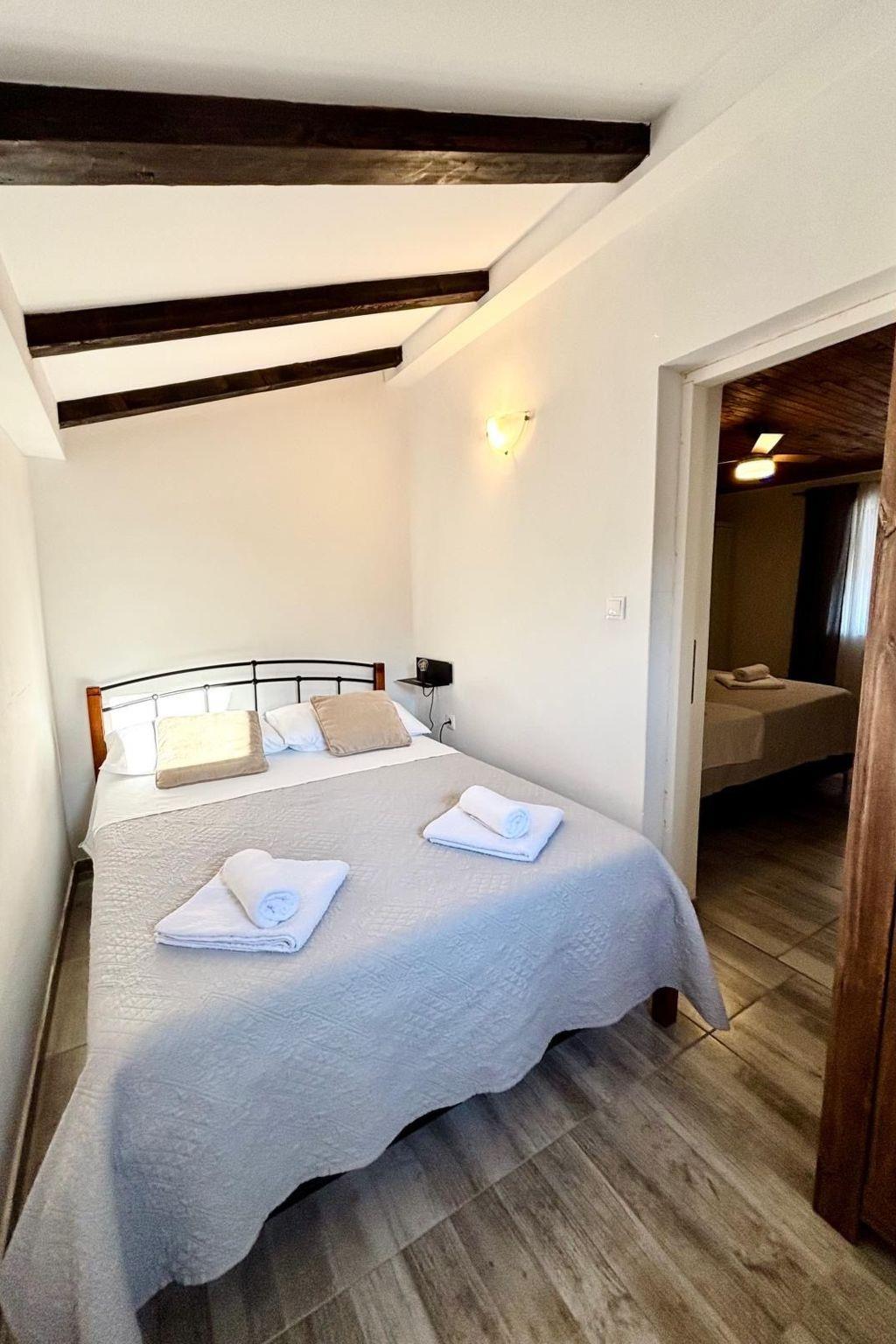 The traditional natural stone house from the year 1970 was fully renovated just recently in 2015 and provides all the necessary modern standards for a comfortable stay. The living space of 100m² comprises a small living/ dining room,fully-equipped kitchen, two large bedrooms and in each large have one small ( so 4 beedroms) and two bathroom. The living room provides a comfortable sofa, a wall-mounted flatscreen TV and a wooden dining table with four ( outside have more chairs) chairs. The modern, white built-in kitchen next to it is equipped with a dishwasher, a four-zone gas stove with an elegant cooker hood, an oven, a fridge with a freezer compartment, a microwave, a kettle and a coffee machine.The bathroom has a shower cubicle, a washbasin with a wall mirror and even a washing machine. Plenty of bed linen and towels are provided and the reliable wireless Internet connection can be used free of charge.