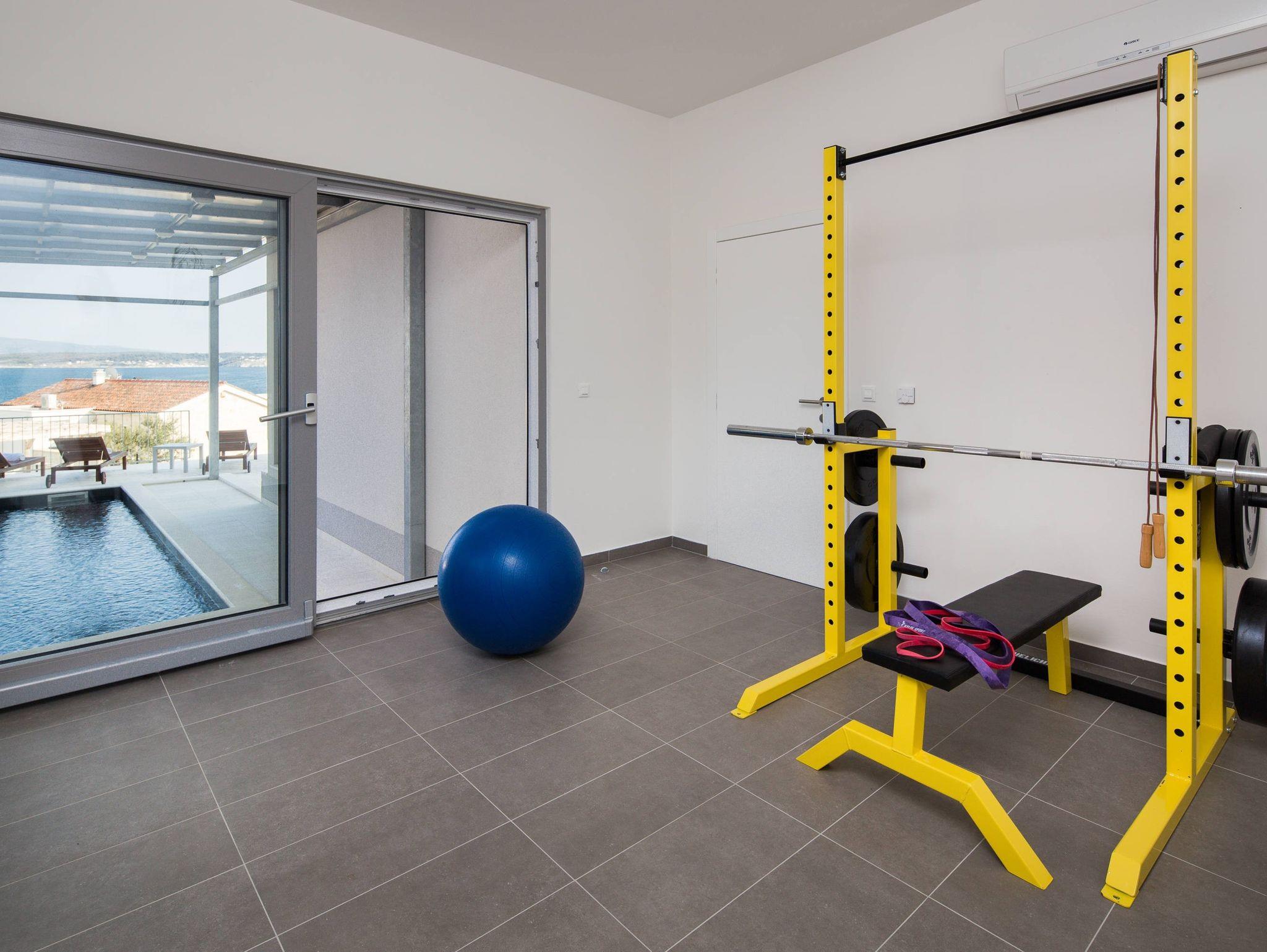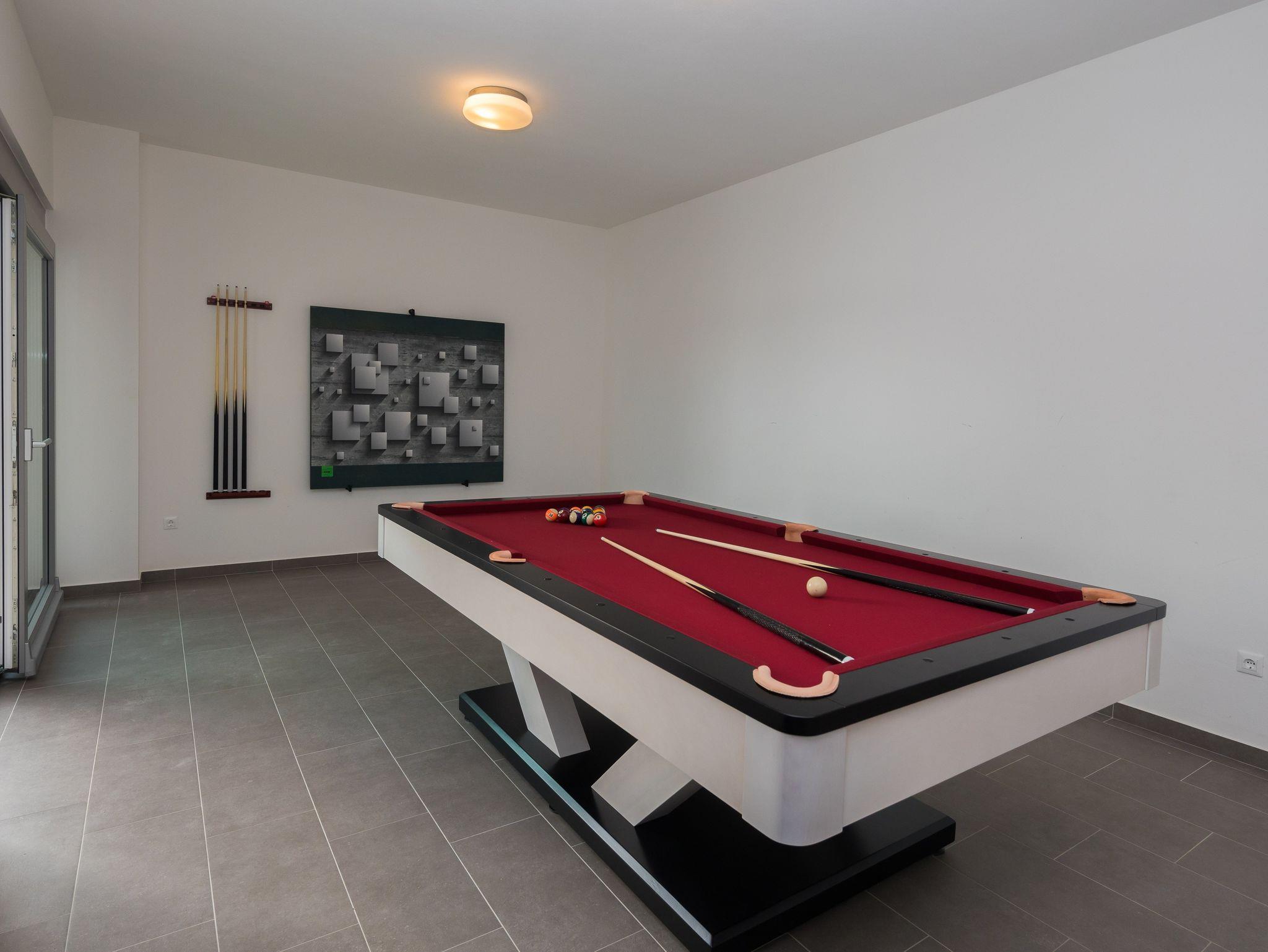 Hof (1070m2, Kinderbereich, Sitzbereich), Parkplatz (Anzahl der Parkplätze: 5, Entfernung vom Objekt: im Hof), Pool: privat, Dimensionen: 7m x 3m x 1.5m, Wassertyp: Süßwasser, Heizung: Ja, Grill: gemeinsam, WiFi Internet, Föhn, Bügeleisen, Bügelbrett, Sonnenschirm, Liegestühle, Kinderbett