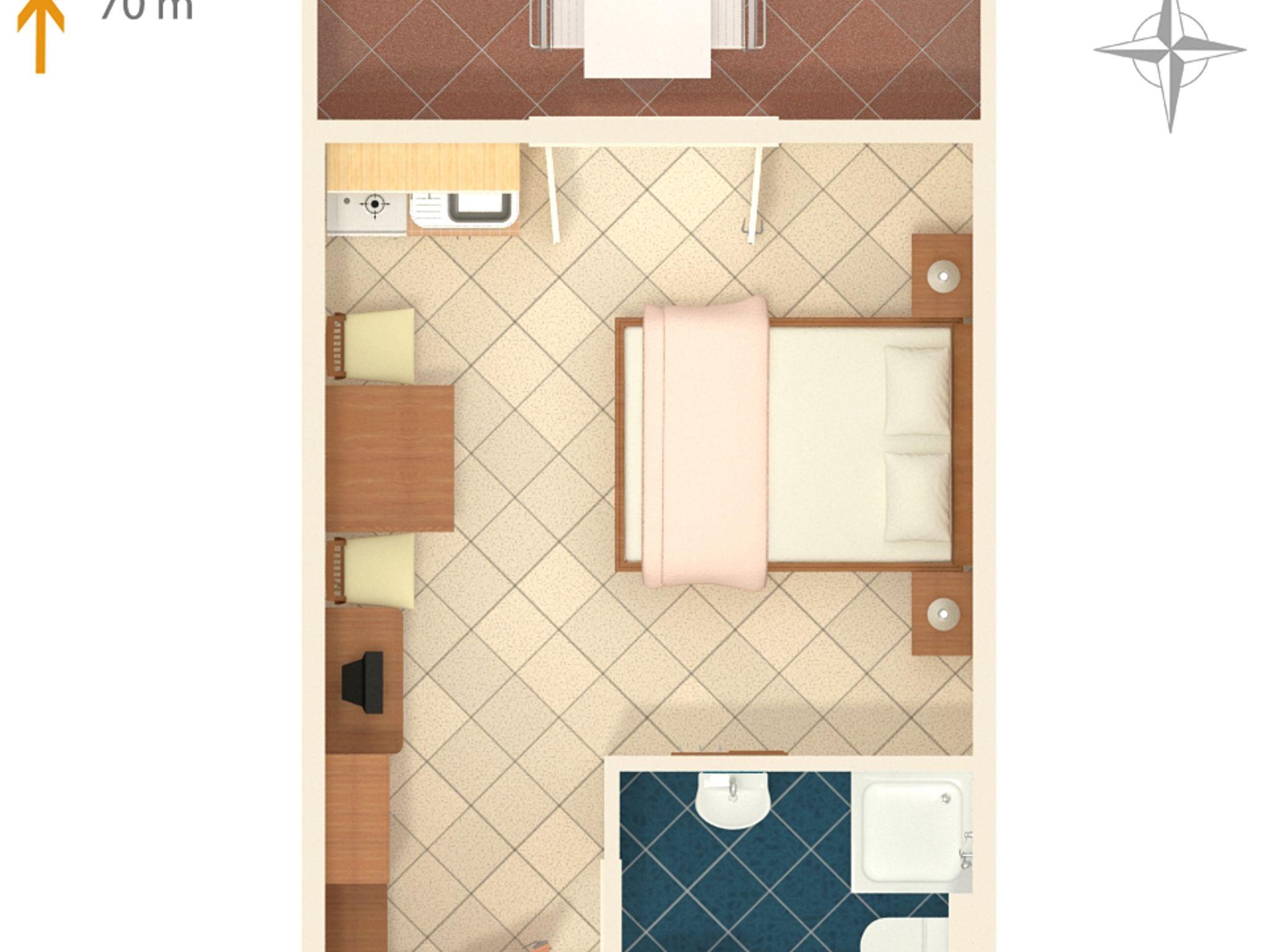 Studio bietet Platz für 2 Gäste. Die Betten sind in Schlafzimmern, die es 1 gibt, innerhalb einer Gesamtfläche von 23m2, angeordnet. Die Gäste haben eine eigene Terrasse zur Verfügung, auf der sie in warmen Sommernächten genießen können. Das Studio-Apartment bietet Meerblick. In der Unterkunftseinheit besteht die Möglichkeit des Mitbringens von Haustieren gegen Aufpreis. IM PREIS INBEGRIFFEN: Endreinigung, Klimatisierung, Parkplatz, Internet, Wäschewaschen, Kinderbett, Bügeleisen, Bügelbrett, Föhn. VERBINDLICHE ZUSÄTZLICHE KOSTEN: Kurtaxe (Erwachsene 0,93 € - 1,50 € Nacht/Person, Kinderermäßigung 12 - 17 Jahre), Aufzahlung für Kurzaufenthalte (prozentualer Zuschlag pro Nächtigungsanzahl: 30% - 1, 20% - 2, 10% - 3). UNVERBINDLICHE ZUSÄTZLICHE KOSTEN: Frühstück (13,00 €, 50% Nachlass für Kinder zwischen 4 und 12 Jahren, Kinder bis 4 Jahre sind frei.), Halbpension (40,00 €, 50% Nachlass für Kinder zwischen 4 und 12 Jahren, Kinder bis 4 Jahre sind frei.), Haustiere (3,00 € pro Nacht). Die Verfügbarkeit zusätzlicher Dienstleistungen in Ihrem reservierten Termin und die Preise derselben (falls nicht aufgeführt) müssen im Voraus überprüft werden. Zusätzliche Dienstleistungen die in der Zahlungsaufforderung nicht aufgeführt sind werden direkt beim Vermieter bezahlt, angenommen der Gast nutzt auch diese.