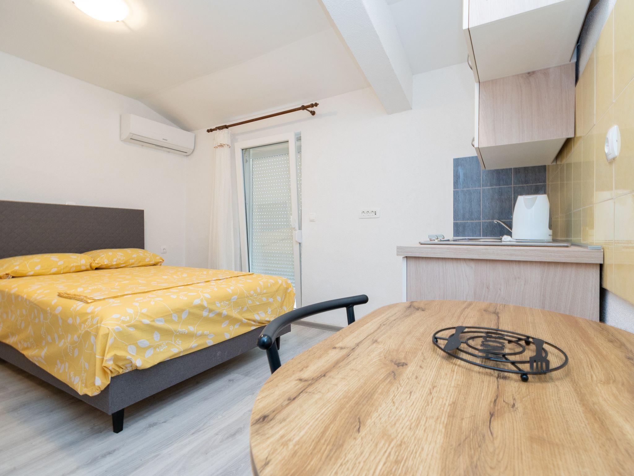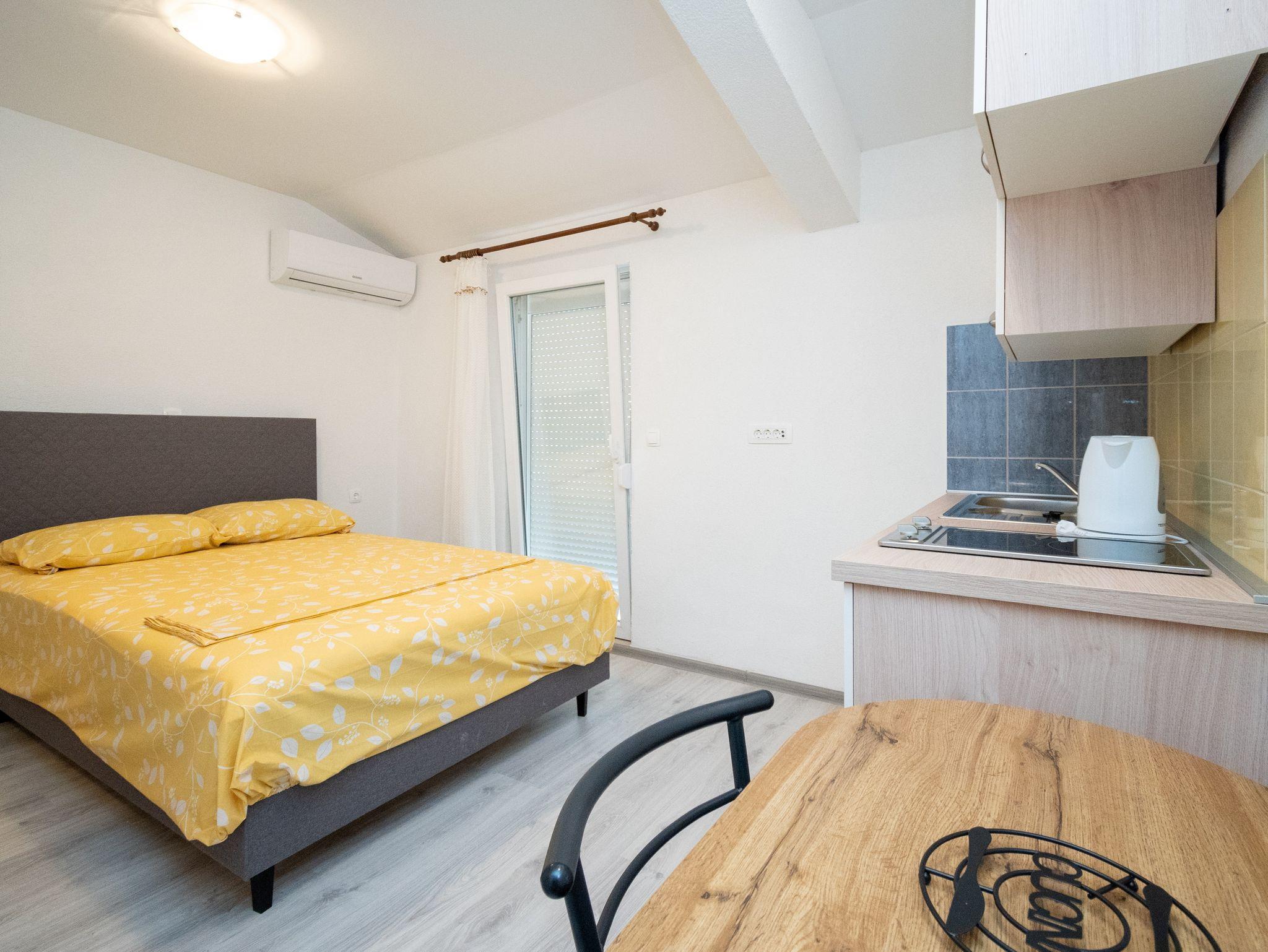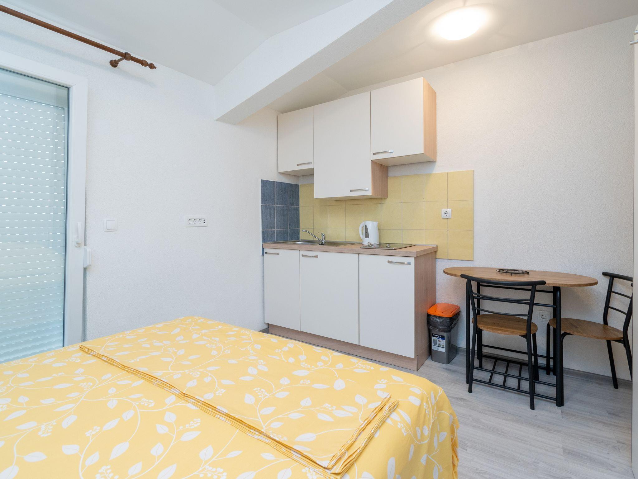 Studio bietet Platz für 2 Gäste. Die Betten sind in Schlafzimmern, die es 1 gibt, innerhalb einer Gesamtfläche von 17m2, angeordnet. Das Studio-Apartment bietet Meerblick. Es ist erlaubt, Speisen auf dem Gemeinschafts-Grill vorzubereiten. Die reservierte Unterkunftseinheit verfügt über einen gemeinsame Terrasse. IM PREIS INBEGRIFFEN: Kurtaxe, Endreinigung, Klimatisierung, Parkplatz, Internet. VERBINDLICHE ZUSÄTZLICHE KOSTEN: Aufzahlung für Kurzaufenthalte (prozentualer Zuschlag pro Nächtigungsanzahl: 30% - 1, 20% - 2, 10% - 3). Die Verfügbarkeit zusätzlicher Dienstleistungen in Ihrem reservierten Termin und die Preise derselben (falls nicht aufgeführt) müssen im Voraus überprüft werden. Zusätzliche Dienstleistungen die in der Zahlungsaufforderung nicht aufgeführt sind werden direkt beim Vermieter bezahlt, angenommen der Gast nutzt auch diese. Ermäßigung auf den Grundpreis: Gratistag 14=13 (bei einem Aufenthalt von 14 Tagen oder mehr erhalten Sie einen Gratistag für den Aufenthalt bis 31.12.26).