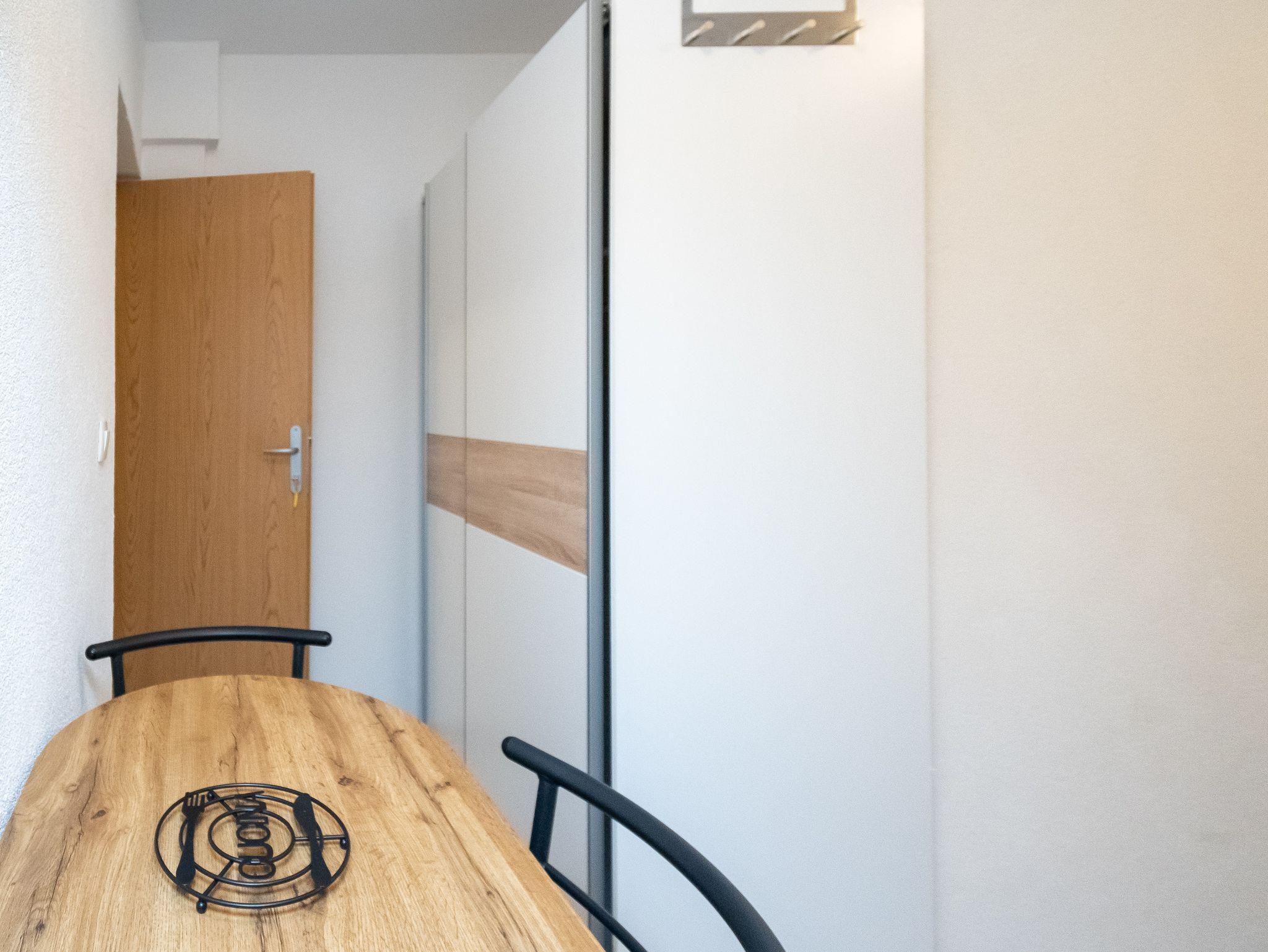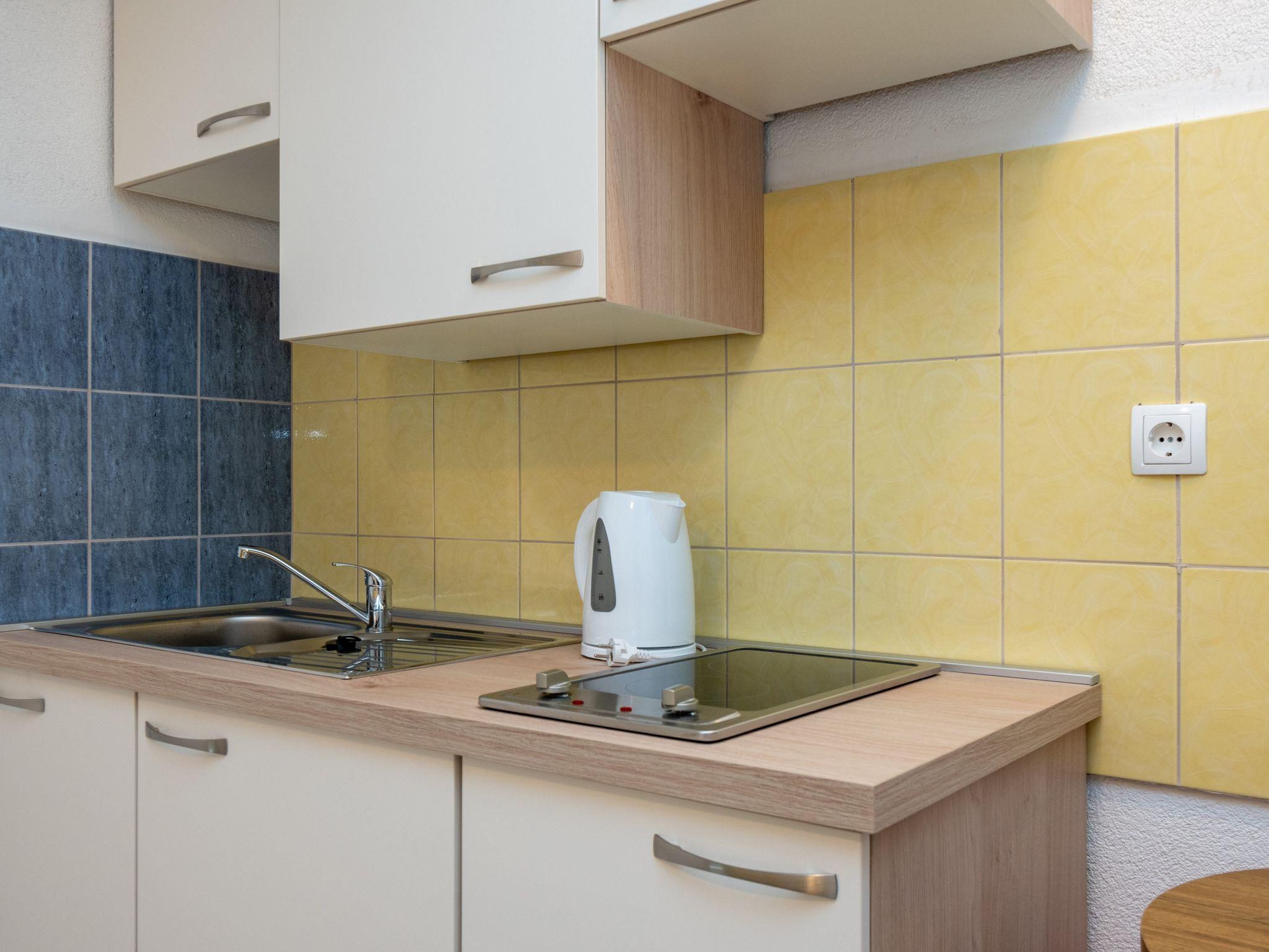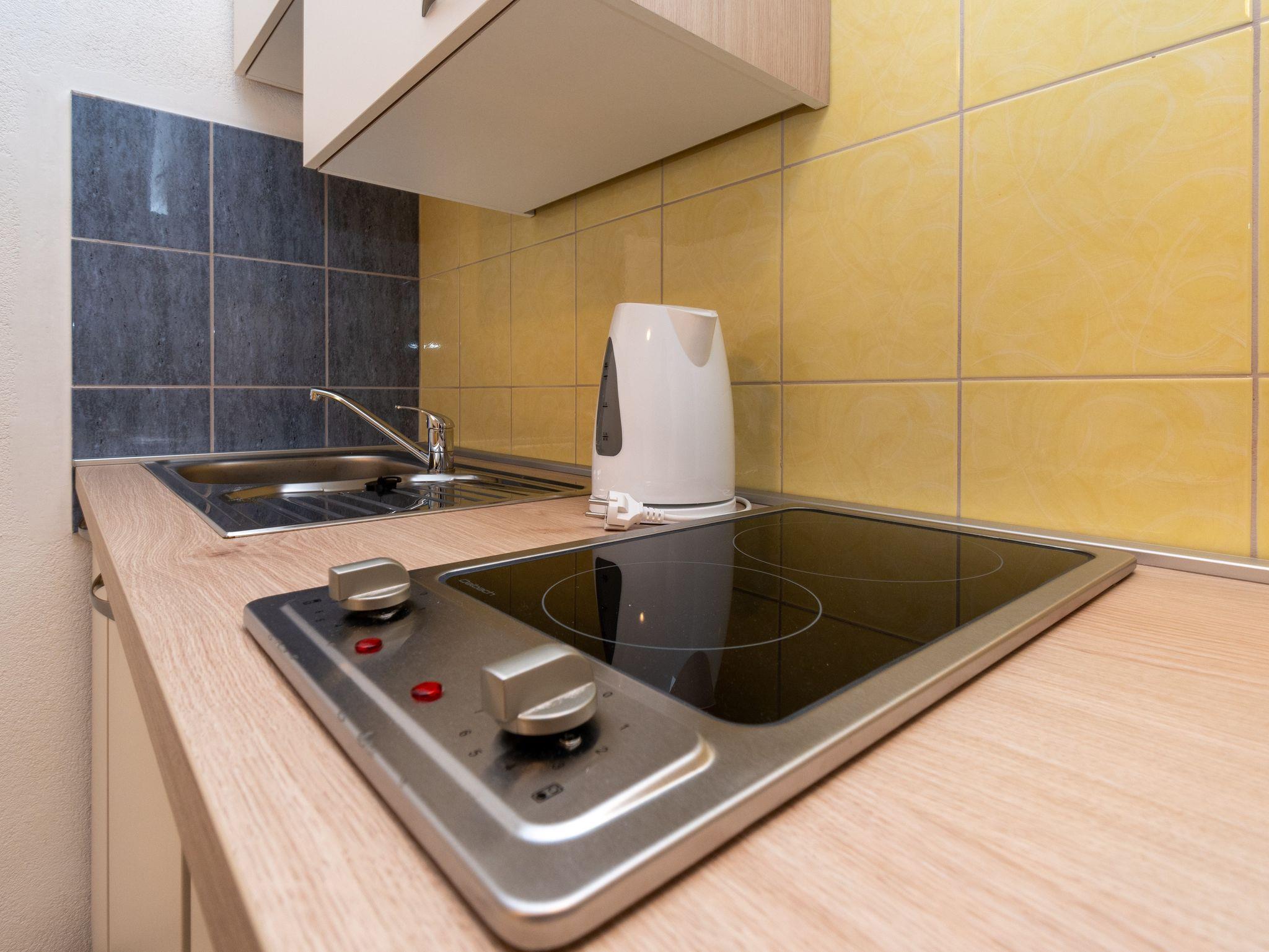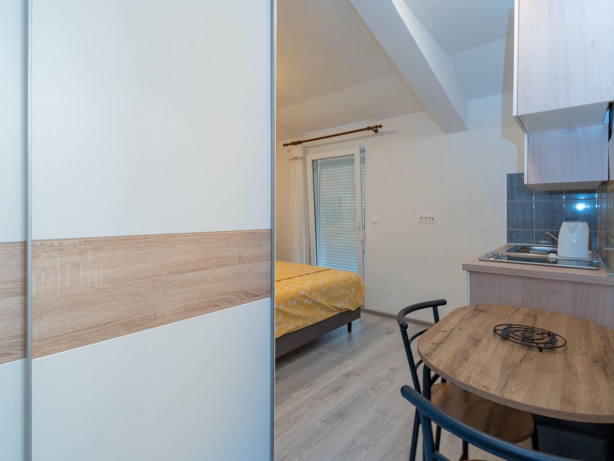 Studio bietet Platz für 2 Gäste. Die Betten sind in Schlafzimmern, die es 1 gibt, innerhalb einer Gesamtfläche von 17m2, angeordnet. Das Studio-Apartment bietet Meerblick. Es ist erlaubt, Speisen auf dem Gemeinschafts-Grill vorzubereiten. Die reservierte Unterkunftseinheit verfügt über einen gemeinsame Terrasse. IM PREIS INBEGRIFFEN: Kurtaxe, Endreinigung, Klimatisierung, Parkplatz, Internet. VERBINDLICHE ZUSÄTZLICHE KOSTEN: Aufzahlung für Kurzaufenthalte (prozentualer Zuschlag pro Nächtigungsanzahl: 30% - 1, 20% - 2, 10% - 3). Die Verfügbarkeit zusätzlicher Dienstleistungen in Ihrem reservierten Termin und die Preise derselben (falls nicht aufgeführt) müssen im Voraus überprüft werden. Zusätzliche Dienstleistungen die in der Zahlungsaufforderung nicht aufgeführt sind werden direkt beim Vermieter bezahlt, angenommen der Gast nutzt auch diese. Ermäßigung auf den Grundpreis: Gratistag 14=13 (bei einem Aufenthalt von 14 Tagen oder mehr erhalten Sie einen Gratistag für den Aufenthalt bis 31.12.26).