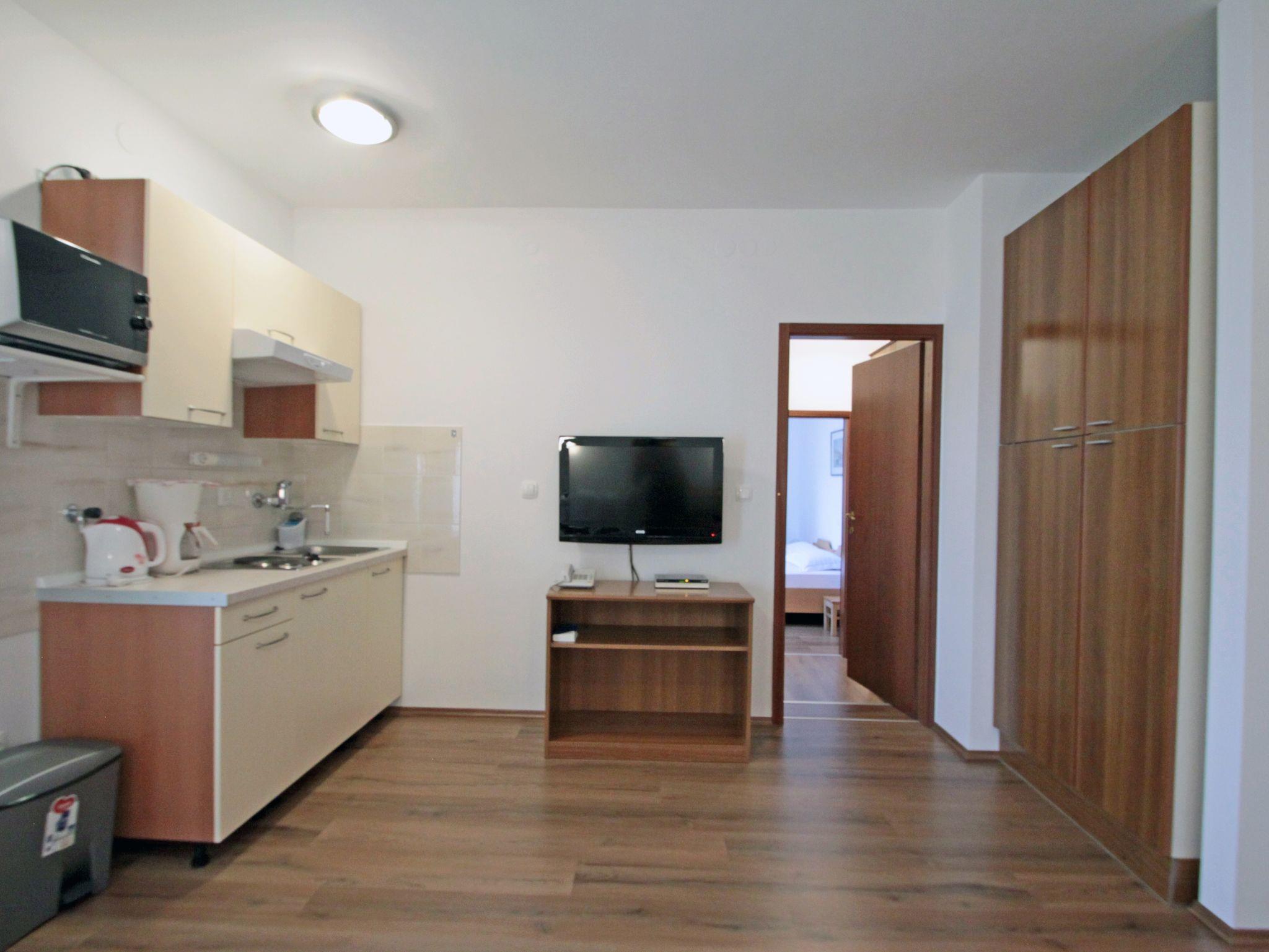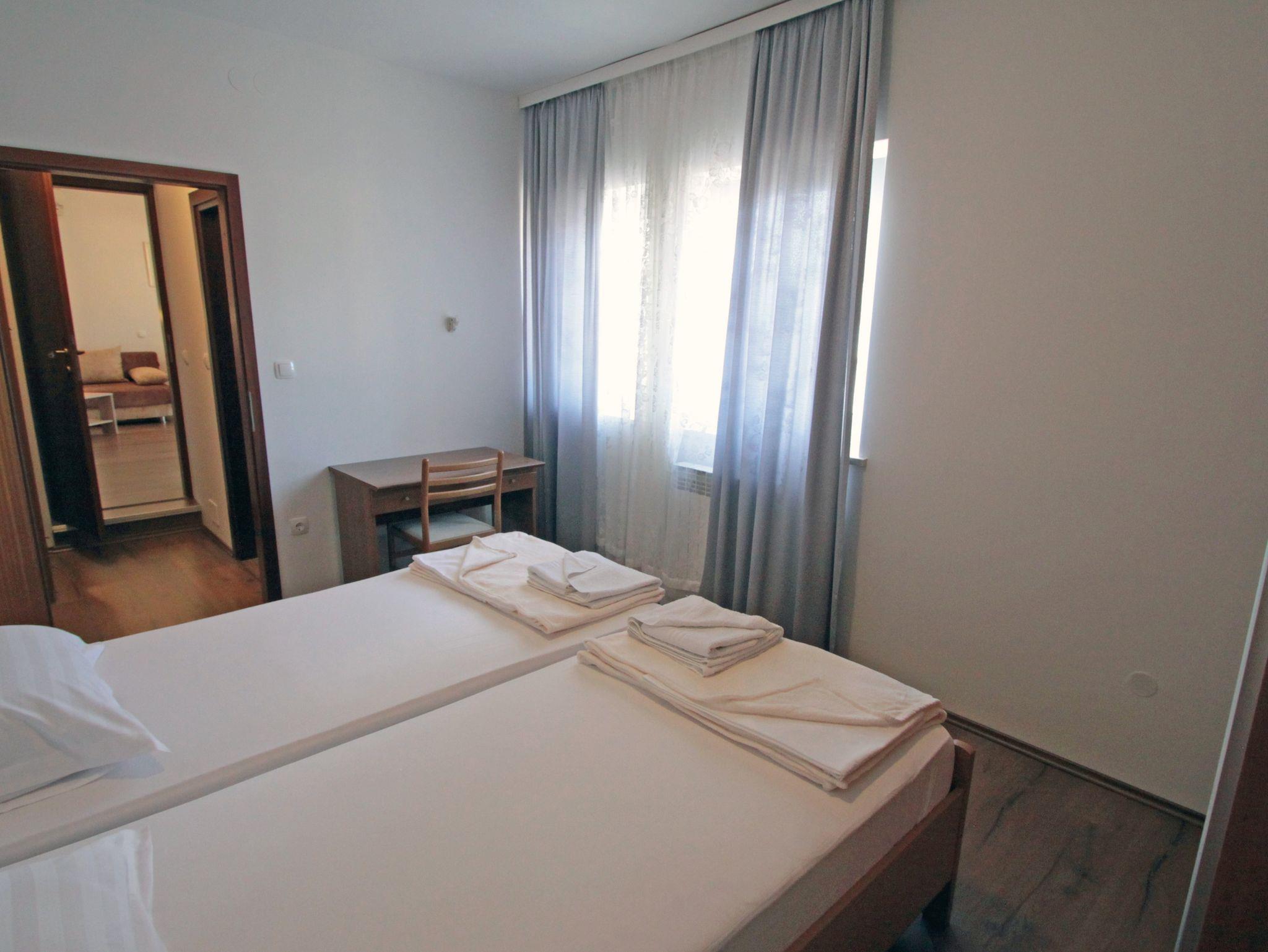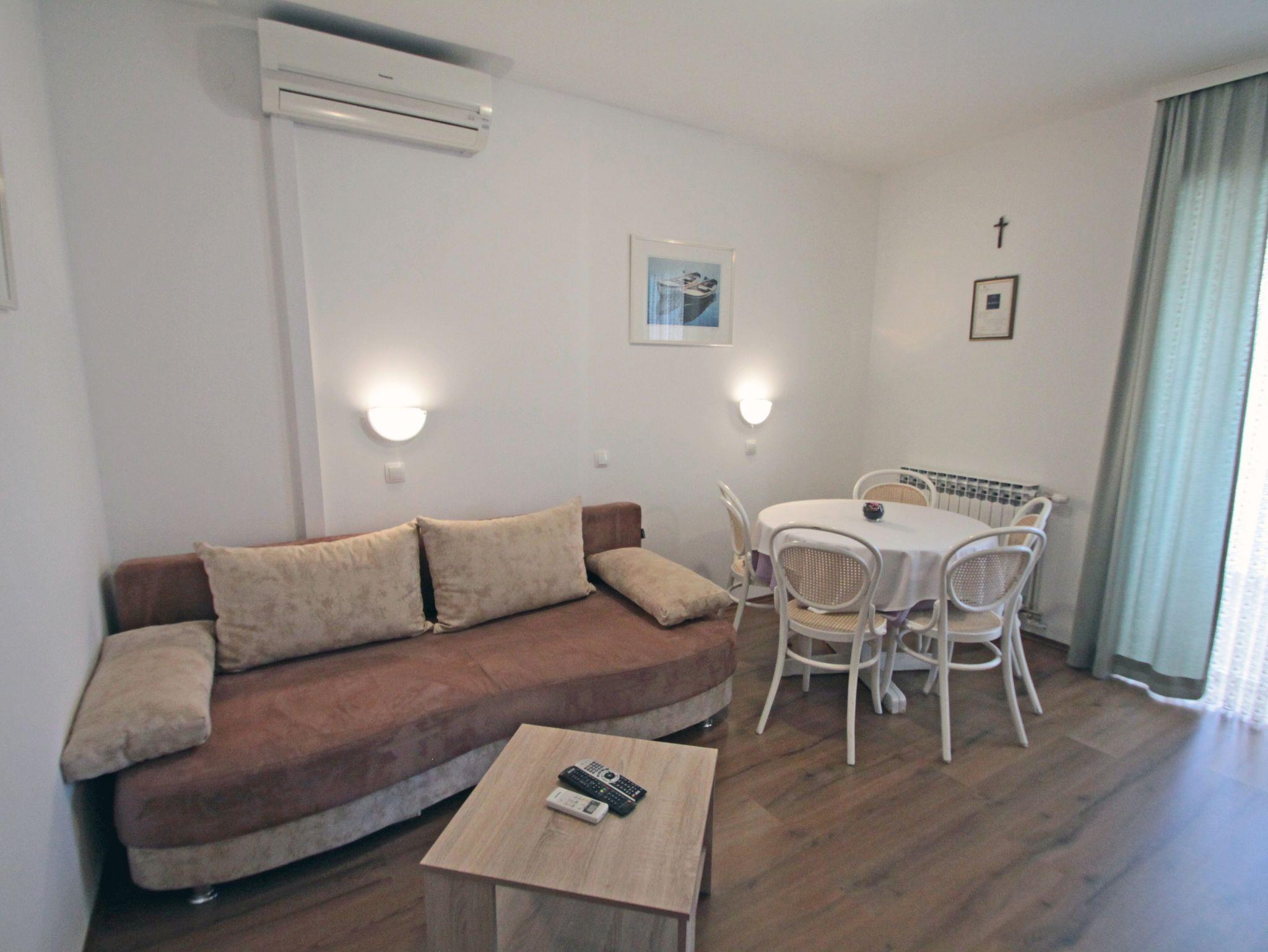 Ferienwohnung bietet Platz für 4 Gäste. Die Betten sind in Schlafzimmern, die es 1 gibt, und in Wohnzimmer, innerhalb einer Gesamtfläche von 38m2, angeordnet. Die Gäste haben eine eigene Terrasse zur Verfügung, auf der sie in warmen Sommernächten genießen können. Das Apartment bietet Meerblick. In der Unterkunftseinheit besteht die Möglichkeit des Mitbringens von Haustieren gegen Aufpreis. IM PREIS INBEGRIFFEN: Kurtaxe, Endreinigung, Klimatisierung, Zentralheizung, Parkplatz, Internet, Wäschewaschen, Kinderbett, Bügeleisen, Bügelbrett, Föhn. VERBINDLICHE ZUSÄTZLICHE KOSTEN: Aufzahlung für Kurzaufenthalte (prozentualer Zuschlag pro Nächtigungsanzahl: 30% - 1, 20% - 2, 10% - 3). UNVERBINDLICHE ZUSÄTZLICHE KOSTEN: Frühstück (15,00 €, 50% Nachlass für Kinder zwischen 4 und 12 Jahren, Kinder bis 4 Jahre sind frei.), Halbpension (40,00 €, 50% Nachlass für Kinder zwischen 4 und 12 Jahren, Kinder bis 4 Jahre sind frei.), Haustiere (3,00 € pro Nacht). Die Verfügbarkeit zusätzlicher Dienstleistungen in Ihrem reservierten Termin und die Preise derselben (falls nicht aufgeführt) müssen im Voraus überprüft werden. Zusätzliche Dienstleistungen die in der Zahlungsaufforderung nicht aufgeführt sind werden direkt beim Vermieter bezahlt, angenommen der Gast nutzt auch diese.
