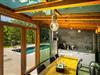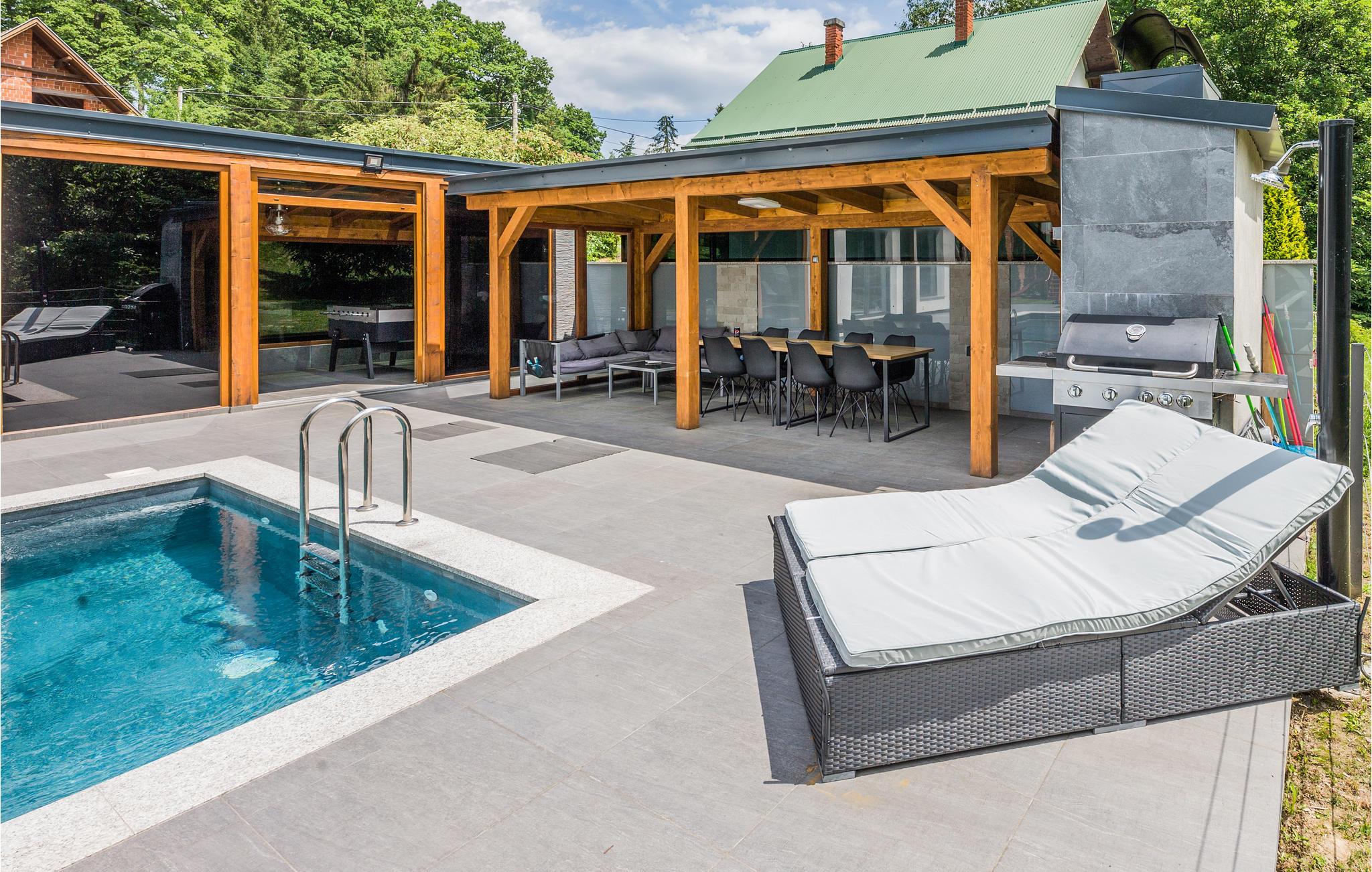 Den opvarmede udendørs pool er endnu et højdepunkt i feriehuset, og det velplejede område er ideelt til længere ophold udendørs.