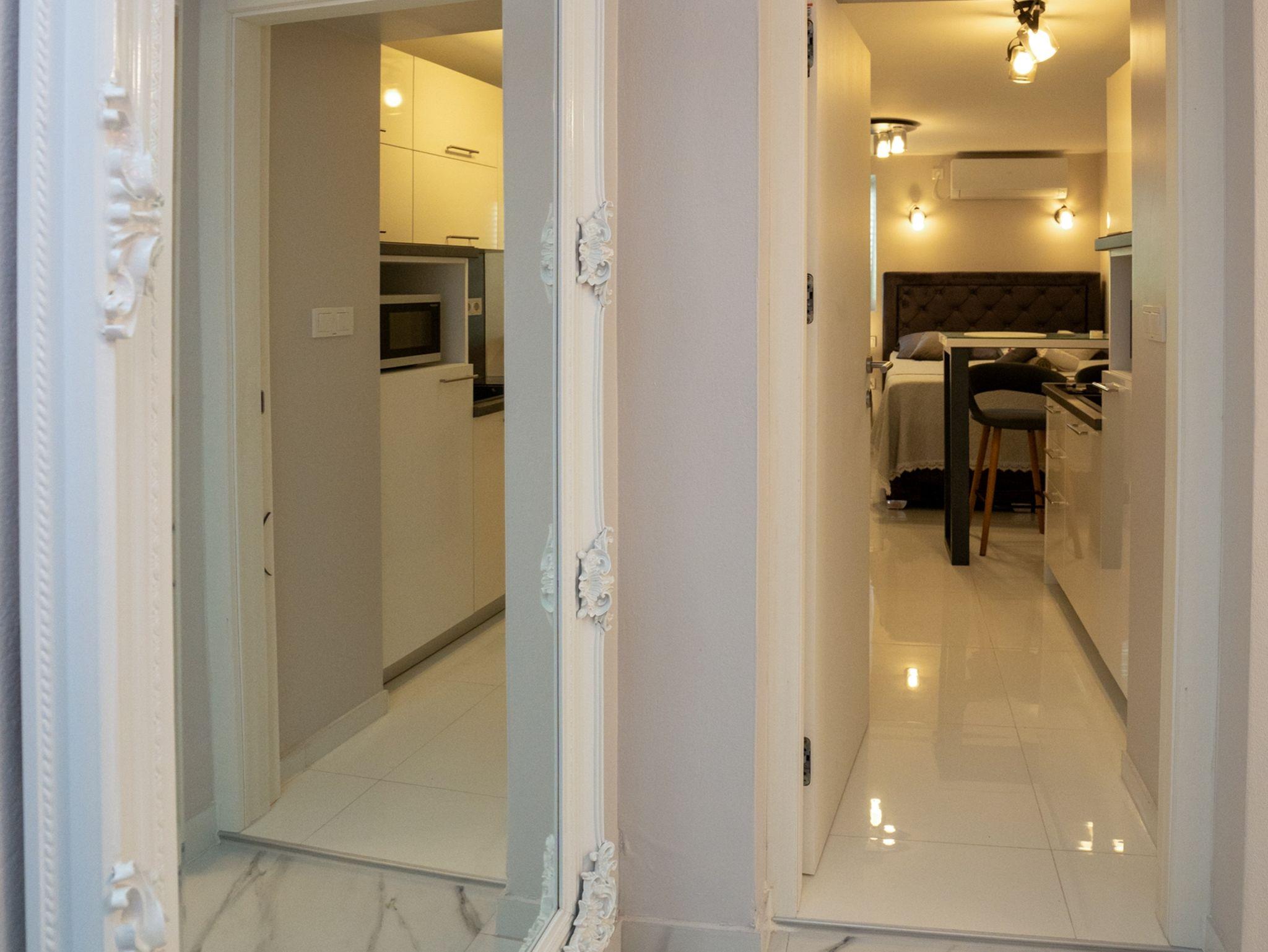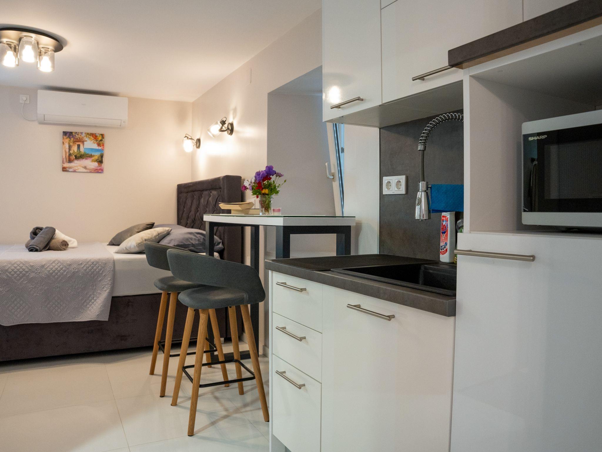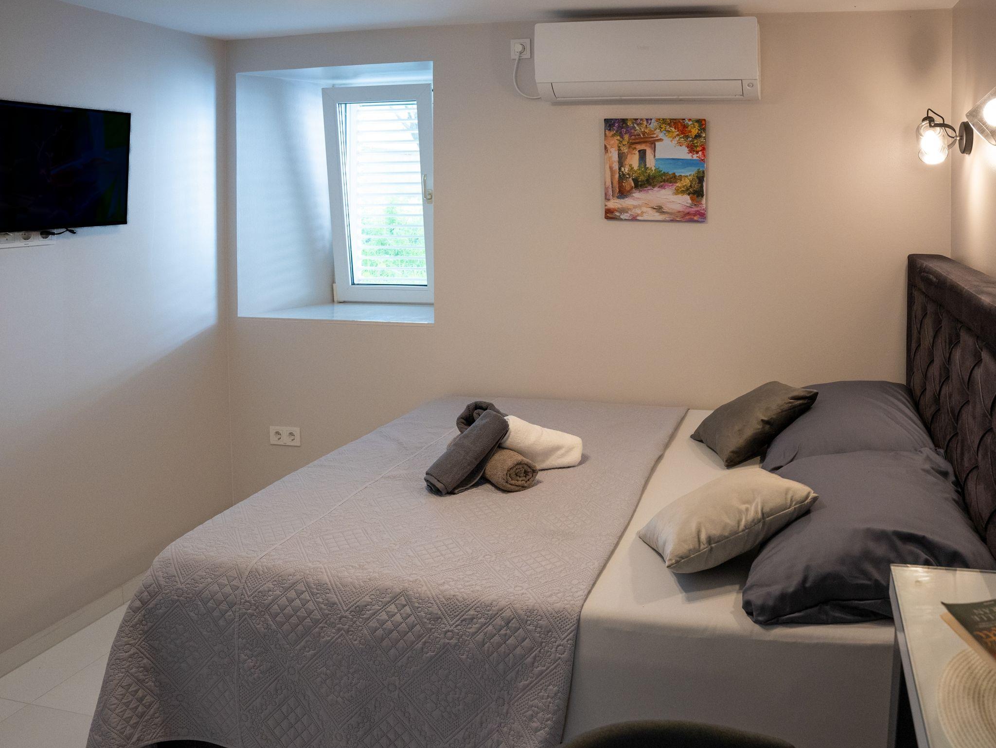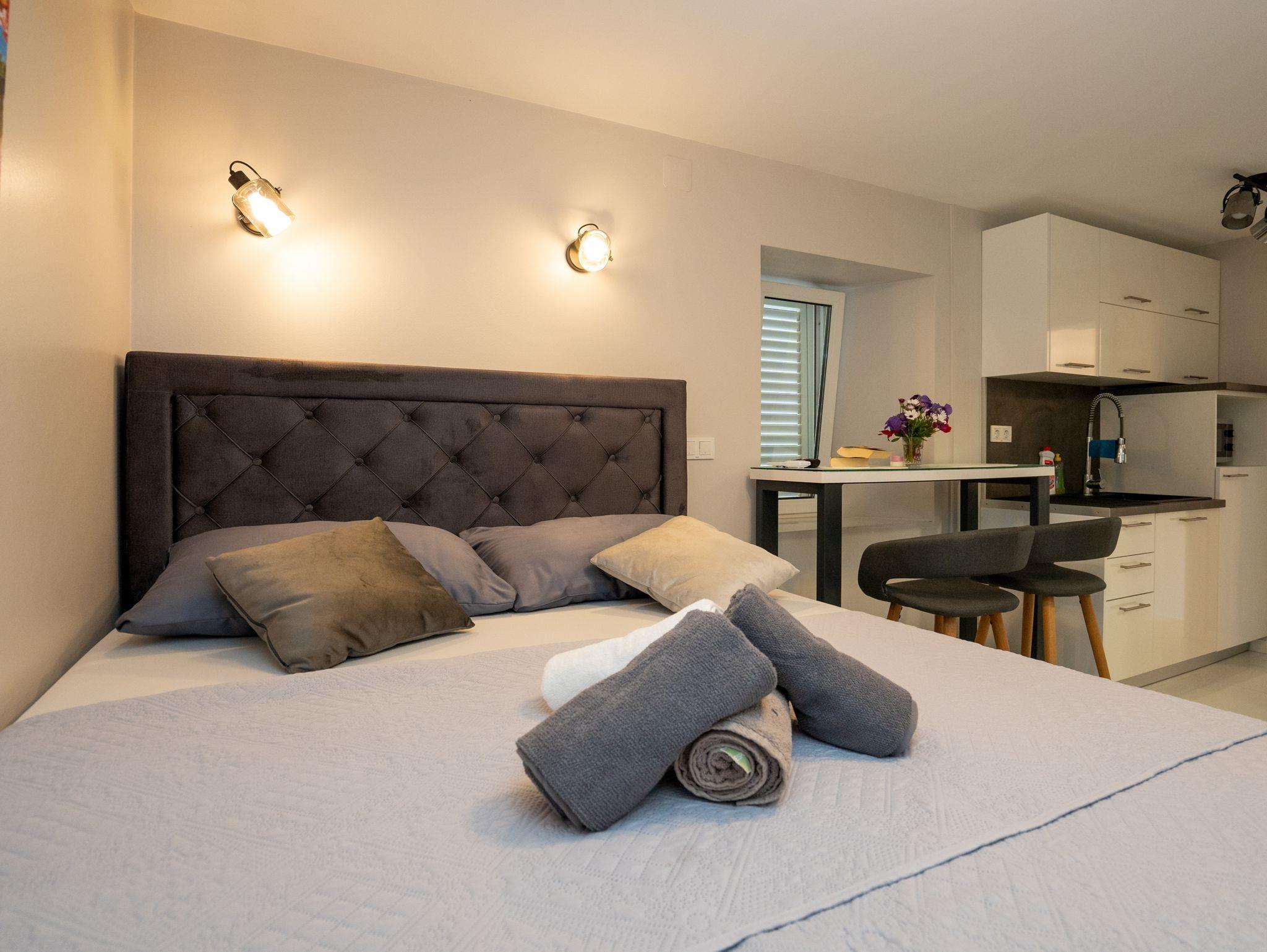 Studio bietet Platz für 2 Gäste. Die Betten sind in Schlafzimmern, die es 1 gibt, innerhalb einer Gesamtfläche von 22m2, angeordnet. Das Studio-Apartment bietet Meerblick. Es ist erlaubt, Speisen auf dem Gemeinschafts-Grill vorzubereiten. Die reservierte Unterkunftseinheit verfügt über einen gemeinsame Terrasse. IM PREIS INBEGRIFFEN: Kurtaxe, Endreinigung, Klimatisierung, Internet, Wäschewaschen, Bootsanlegeplatz, Bügeleisen, Bügelbrett, Föhn. VERBINDLICHE ZUSÄTZLICHE KOSTEN: Aufzahlung für Kurzaufenthalte (prozentualer Zuschlag pro Nächtigungsanzahl: 30% - 1, 20% - 2, 10% - 3). Die Verfügbarkeit zusätzlicher Dienstleistungen in Ihrem reservierten Termin und die Preise derselben (falls nicht aufgeführt) müssen im Voraus überprüft werden. Zusätzliche Dienstleistungen die in der Zahlungsaufforderung nicht aufgeführt sind werden direkt beim Vermieter bezahlt, angenommen der Gast nutzt auch diese.