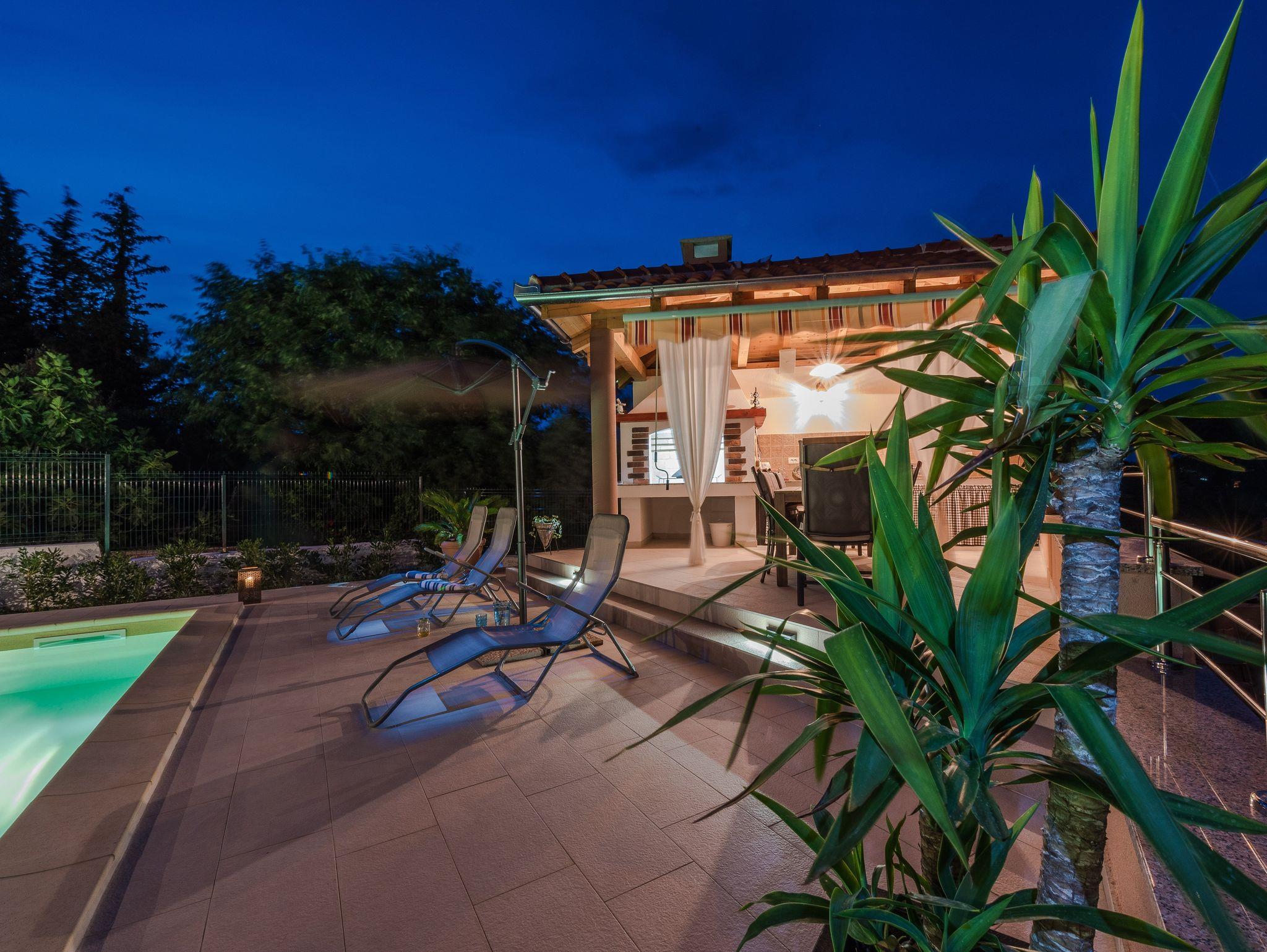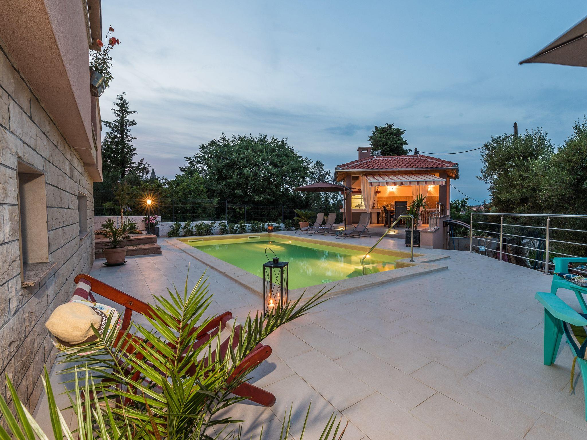 Umgebung des Objekts (Eingerichtet), Hof (600m2, Sitzbereich), Parkplatz (Anzahl der Parkplätze: 4, Entfernung vom Objekt: im Hof), Pool: gemeinsam, Dimensionen: 8m x 4m x 1.5m, Wassertyp: Süßwasser, Grill: gemeinsam, WiFi Internet, Boot, Bootsanlegeplatz (Entfernung vom Objekt: 500 m, Bootsanlegeplatztyp: Boje), Föhn, Bügeleisen, Bügelbrett, Sonnenschirm, Liegestühle, Kinderbett