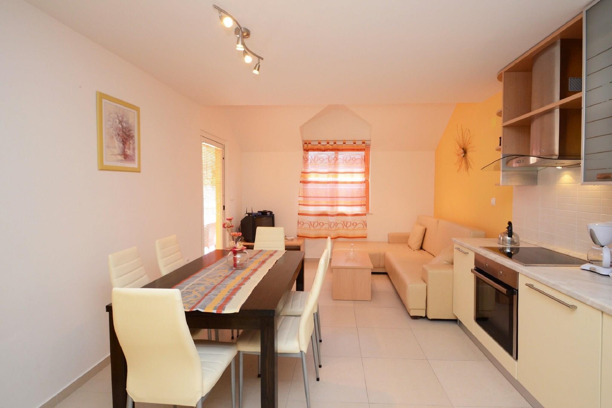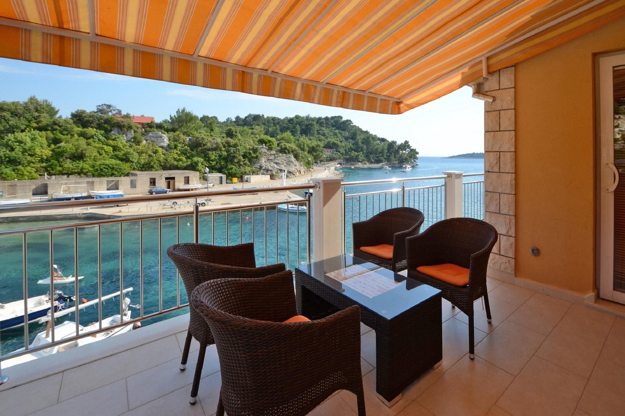 Apartments Korcula er indkvartering med egen forplejning beliggende i Prižba på øen Korcula. Ejendommen har 4 boligenheder.Privat parkering er til rådighed, reservation er ikke påkrævet.Denne standard toværelses lejlighed har egen indgang og er beliggende på øverste etage. Det har opholdsområde med opholdsområde og fladskærms-satellit-tv. Køkkenet har ovn, komfur, køleskab, elkedel, kaffemaskine, opvaskemaskine og spiseplads. Badeværelset har bruser, hårtørrer, sæbe og toiletpapir. Sengelinned og håndklæder leveres, så som gratis WiFi og aircondition. Lejligheden har terrasse med havudsigt. Apartments Korcula ligger kun 5 meter fra havet på øen Korcula. Øen Korcula er en af de grønneste øer i Adriaterhavet, med rigelige vinmarker og olivenlunde. Dens sydlige kyst er dannet af små strande og stille bugter. Den nærmeste strand ligger 100 m fra ejendommen. Den nærmeste restaurant ligger i stueetagen af overnatningsstedet. Marked og bar ligger 1 km fra ejendommen. Det nærmeste apotek ligger 7 km væk.Den nærmeste busstation ligger 7 km væk.