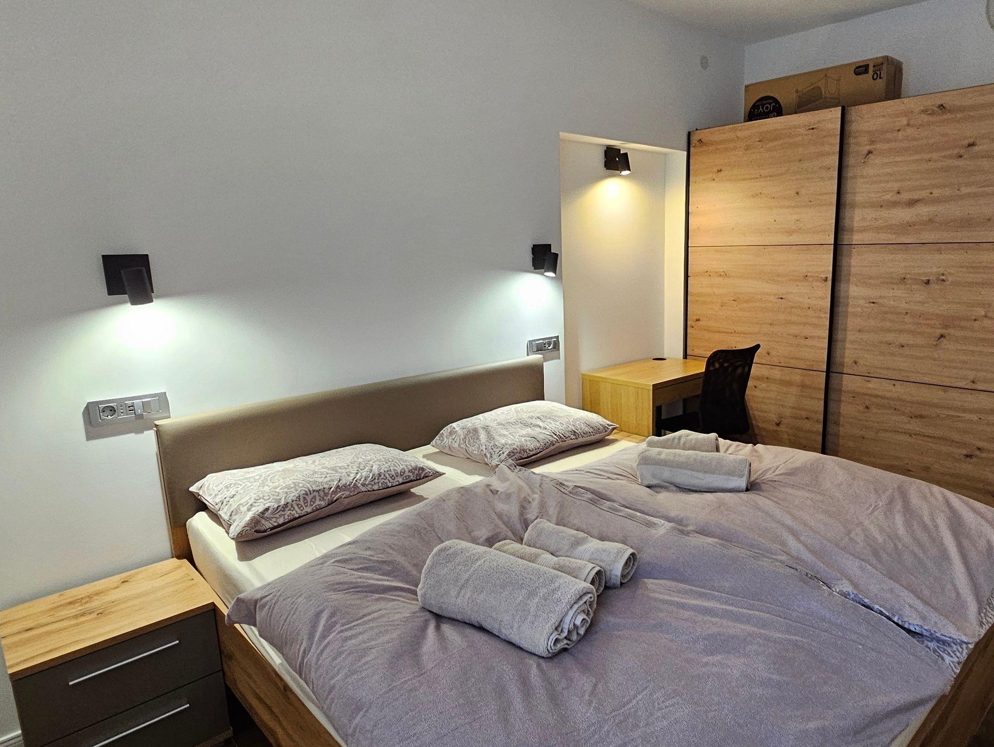 Ferienwohnung bietet Platz für 3 Gäste. Die Betten sind in Schlafzimmern, die es 1 gibt, und in Wohnzimmer, innerhalb einer Gesamtfläche von 45m2, angeordnet. Es ist erlaubt, Speisen auf dem Gemeinschafts-Grill vorzubereiten. Die reservierte Unterkunftseinheit hat keinen Balkon und keine Terrasse. IM PREIS INBEGRIFFEN: Kurtaxe, Endreinigung, Zentralheizung, Parkplatz, Internet, Kinderbett, Bügeleisen, Bügelbrett, Föhn, tragbarer Grill. Die Verfügbarkeit zusätzlicher Dienstleistungen in Ihrem reservierten Termin und die Preise derselben (falls nicht aufgeführt) müssen im Voraus überprüft werden. Zusätzliche Dienstleistungen die in der Zahlungsaufforderung nicht aufgeführt sind werden direkt beim Vermieter bezahlt, angenommen der Gast nutzt auch diese. Ermäßigung auf den Grundpreis: Gratistag 14=13 (bei einem Aufenthalt von 14 Tagen oder mehr erhalten Sie einen Gratistag für den Aufenthalt bis 31.12.26).