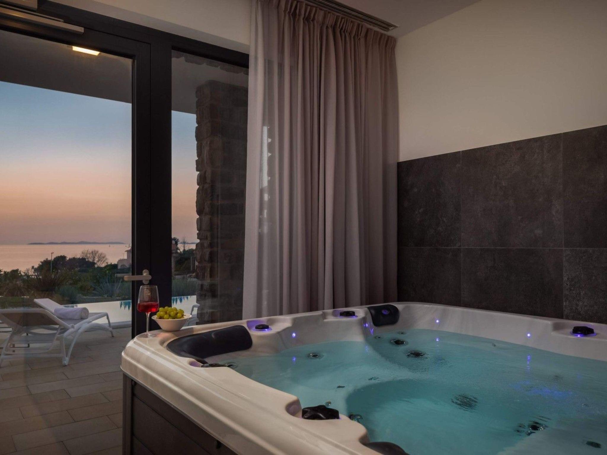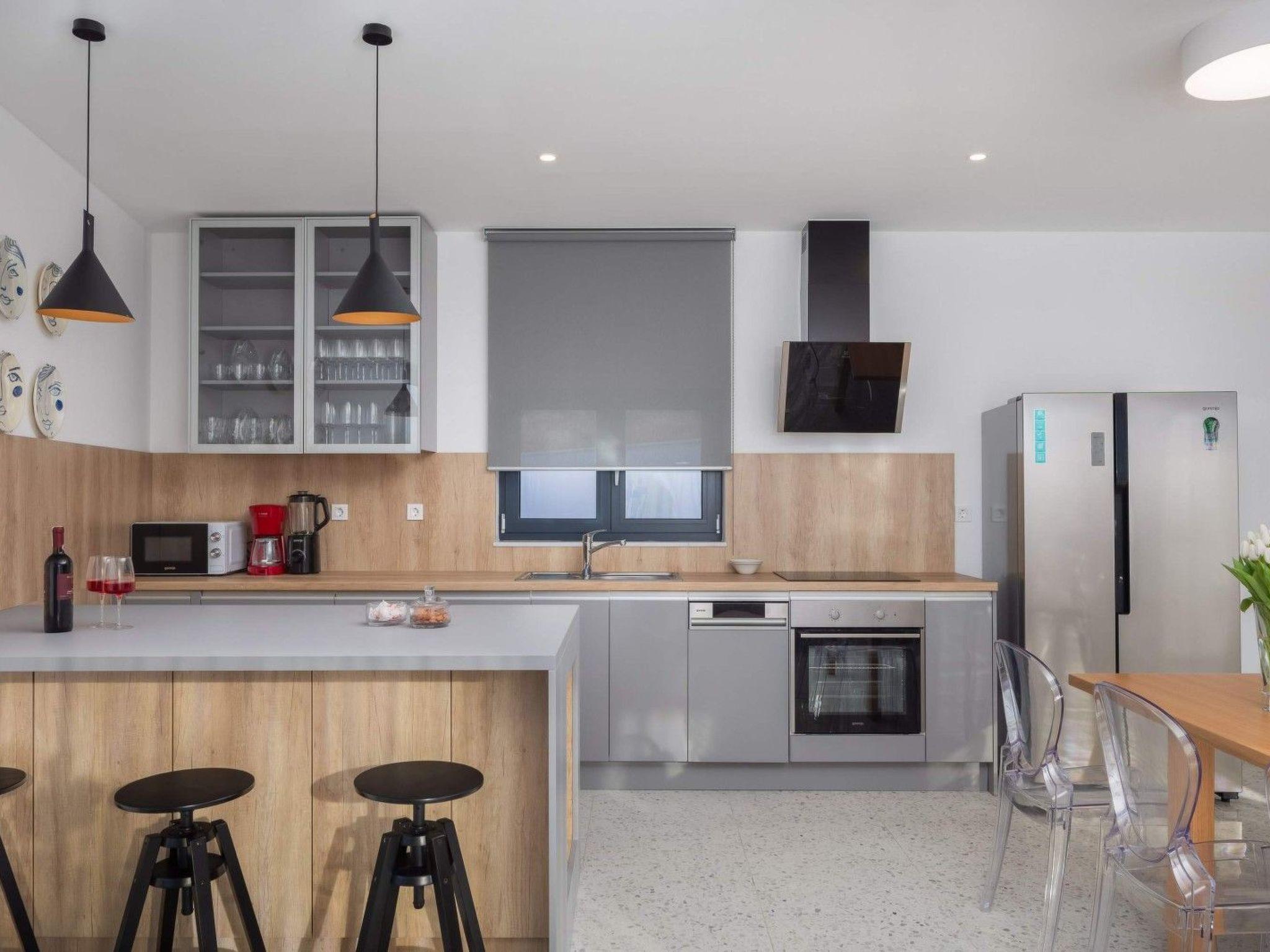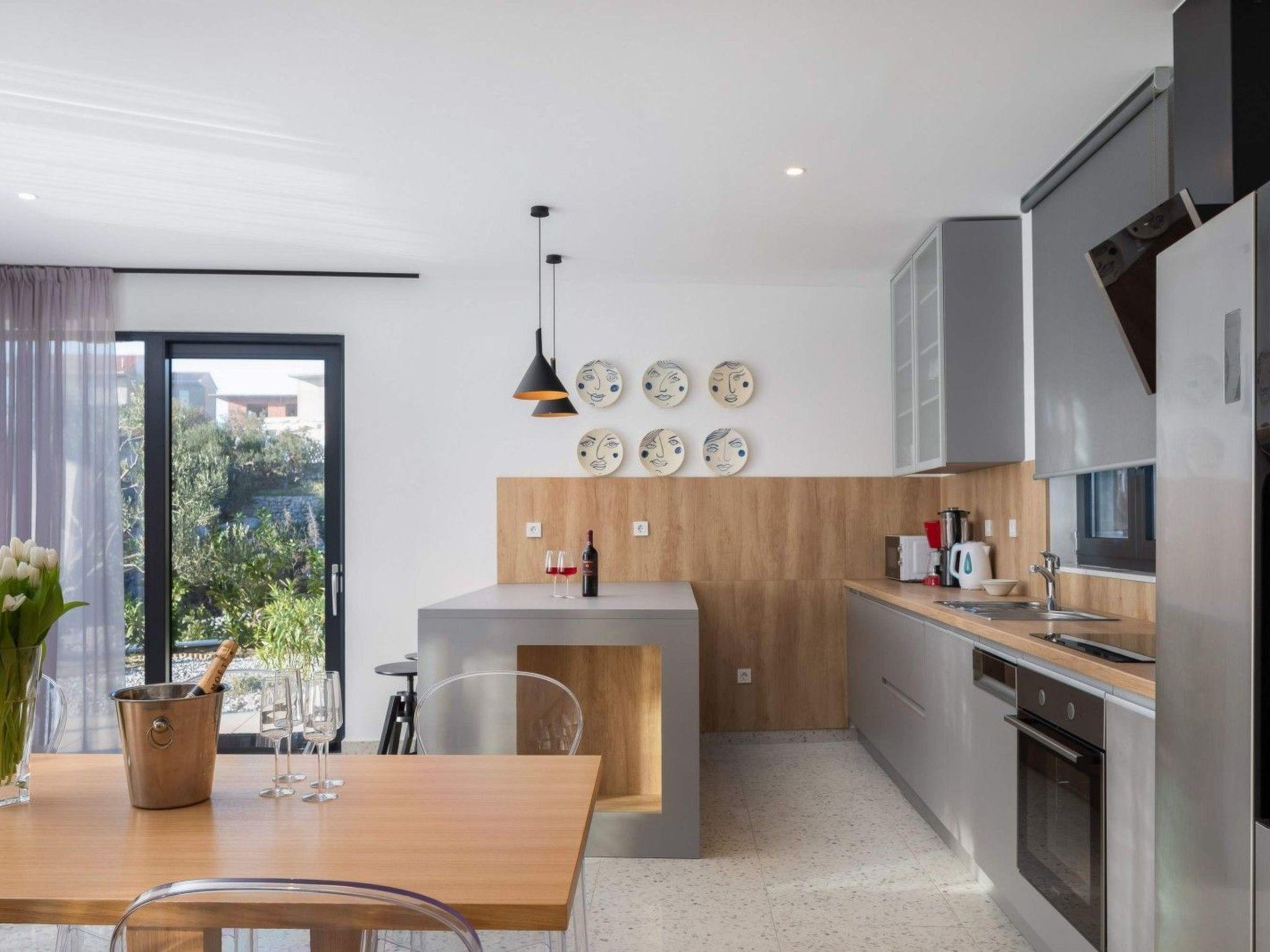This villa has a maximum capacity of 8+2 guests. Guests are accommodated in 4 spacious bedrooms, all with an en-suite bathroom. For 2 additional guests, there are sofa beds in two bedrooms. This is a great thing if you are travelling with children, especially smaller children. For a bit of relaxation, you will find the sauna and relaxation room indoors. We know you will be dining mostly in the outdoor dining area, but you can do it also in the indoor one, which is right by the kitchen. The kitchen has it all, from the kettle to the toaster. If you will be in need of warmth, there is heating with A/C units and a fireplace. But, we assure you, you don't have to worry. Most of the days are completely sun-soaked.