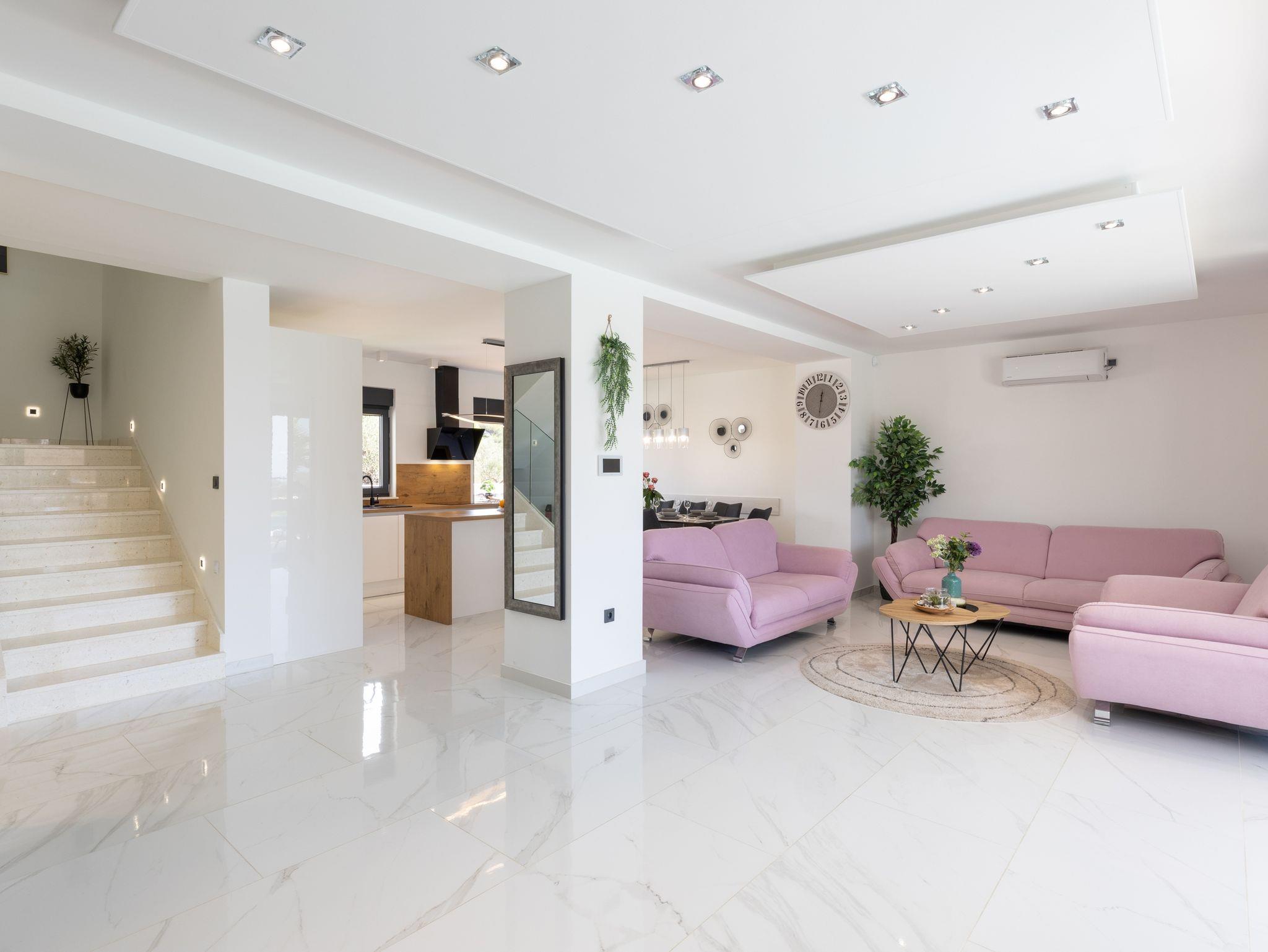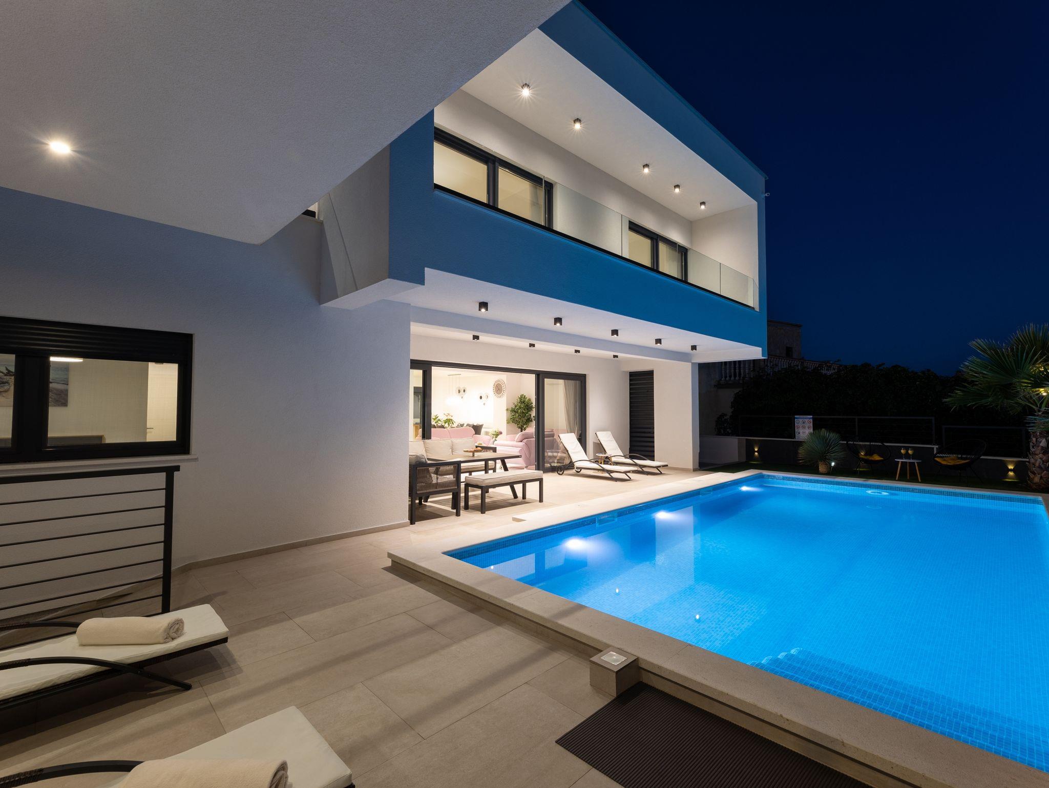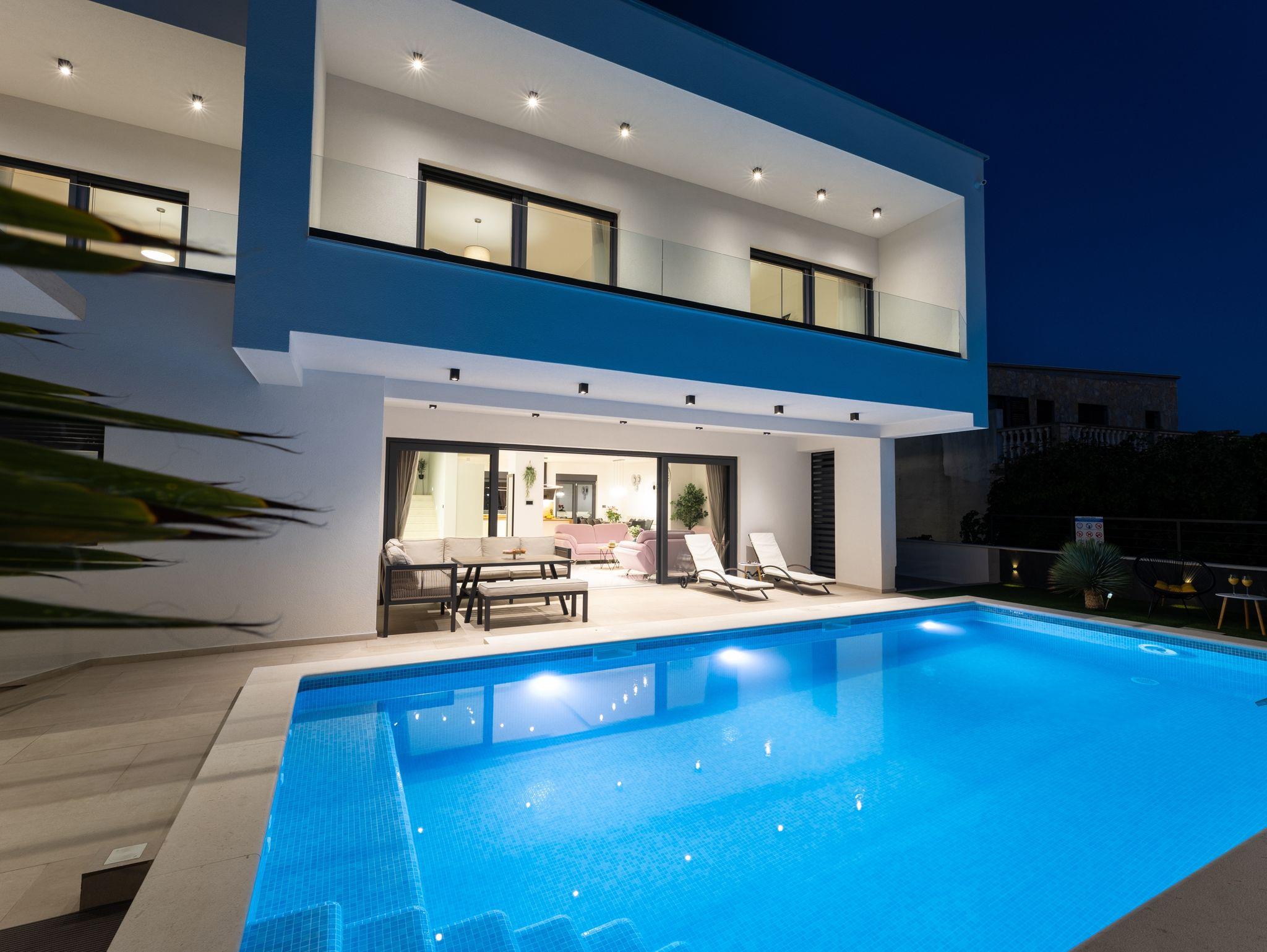 Haus bietet Platz für 10 Gäste. Die Betten sind in Schlafzimmern, die es 5 gibt, innerhalb einer Gesamtfläche von 181m2, angeordnet. Die Gäste haben eine eigene Terrasse zur Verfügung, auf der sie in warmen Sommernächten genießen können. Das Haus bietet Meerblick. Für vollen Genuss und Entspannung gibt es einen privaten Grill für Gäste dieser Unterkunft. Während ihres Aufenthalts können sich Gäste im privaten Schwimmbad entspannen. In der Unterkunftseinheit besteht die Möglichkeit des Mitbringens von Haustieren gegen Aufpreis. IM PREIS INBEGRIFFEN: Kurtaxe, Endreinigung, Klimatisierung, Pool, Parkplatz, Internet, Kinderbett, Zusatzbett, Bügeleisen, Bügelbrett, Föhn, Liegestühle. UNVERBINDLICHE ZUSÄTZLICHE KOSTEN: Haustiere (15,00 € pro Nacht). Die Verfügbarkeit zusätzlicher Dienstleistungen in Ihrem reservierten Termin und die Preise derselben (falls nicht aufgeführt) müssen im Voraus überprüft werden. Zusätzliche Dienstleistungen die in der Zahlungsaufforderung nicht aufgeführt sind werden direkt beim Vermieter bezahlt, angenommen der Gast nutzt auch diese. Ermäßigung auf den Grundpreis: Gratistag 28=25 (bei einem Aufenthalt von 28 oder mehr Tagen erhalten Sie 3 kostenlose Tage für den Aufenthalt bis 31.12.26).