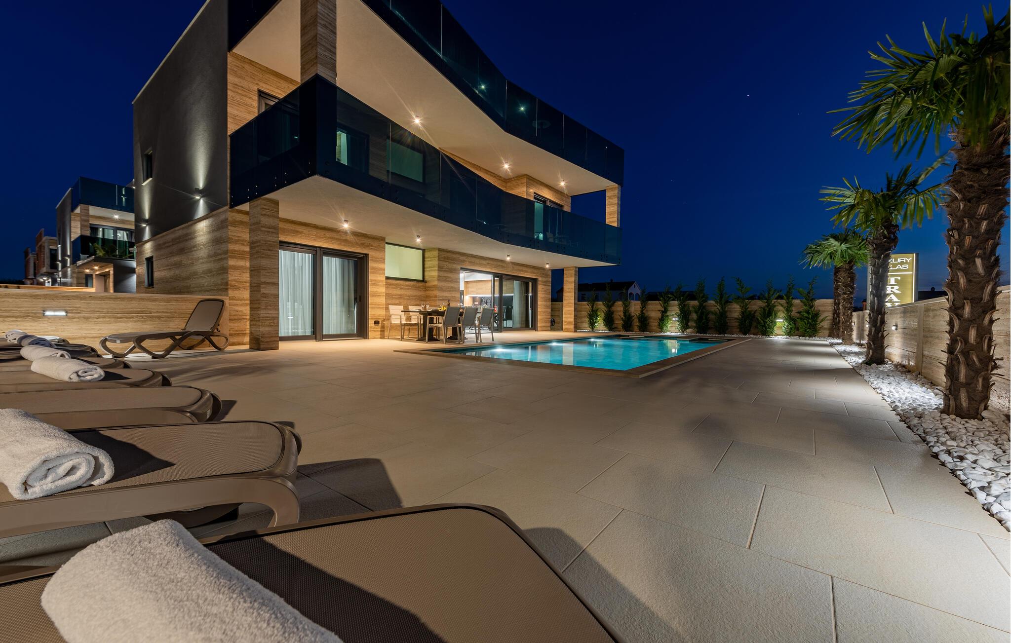 Udeområdet er tilsvarende luksuriøst og byder på flere terrasser, så I kan finde sol, skygge og læ efter behov i løbet af dagen. Når solen har bagt jer igennem, kan I køle jer dejligt af i poolen, og om aftenen er der ikke meget, der slår en tur i det udendørs spabad under solens sidste stråler.