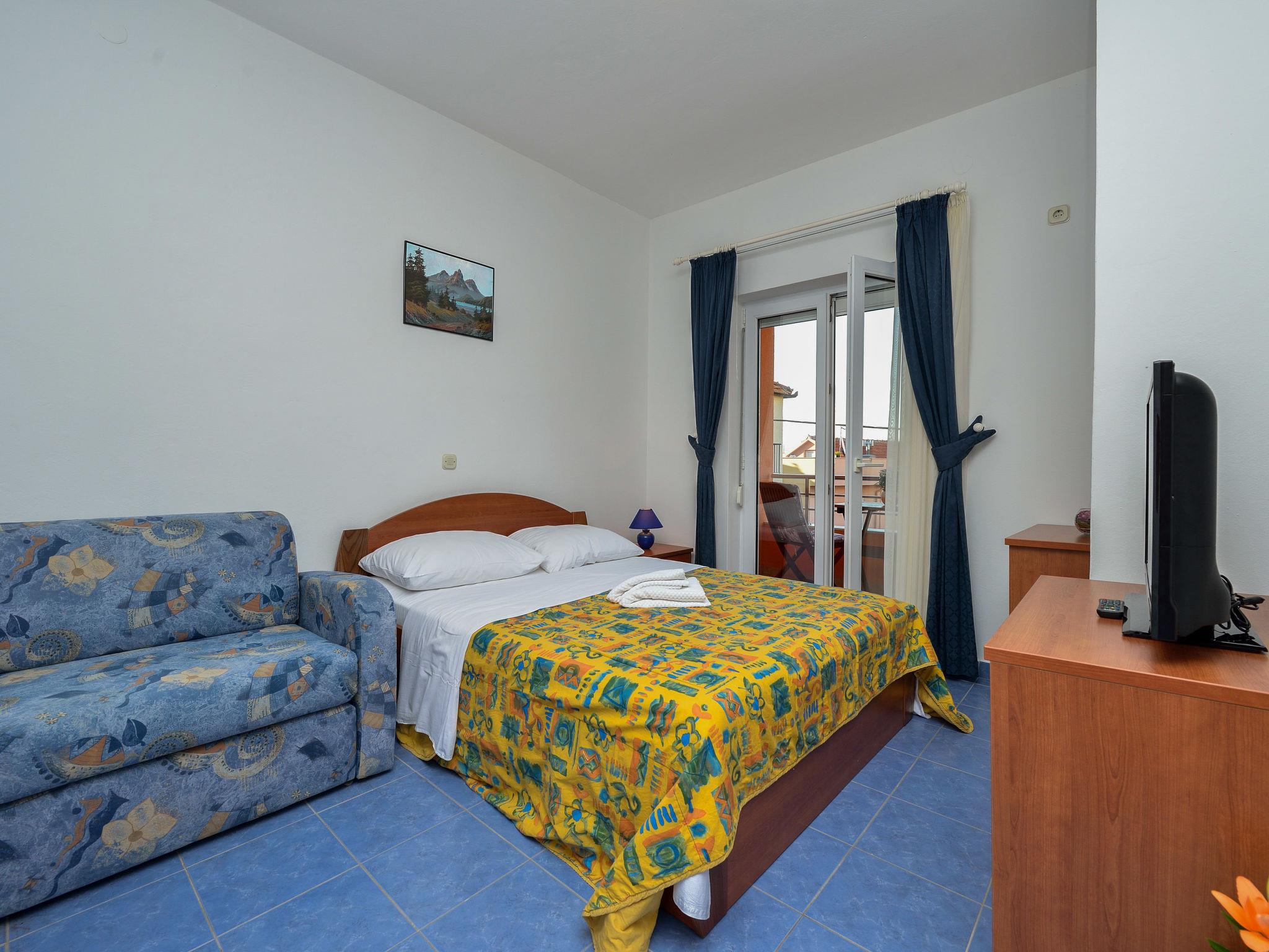 1-room apartment 24 m2 on 1st floor, north-east facing position. Studio with 1 sofabed (90 cm, length 200 cm), 1 french bed (140 cm, length 200 cm), satellite TV. Exit to the balcony. Open kitchen (2 hot plates, kettle, microwave). Shower/WC. No heating option. Balcony 3 m2. Balcony furniture. Facilities: Internet (WiFi, free).