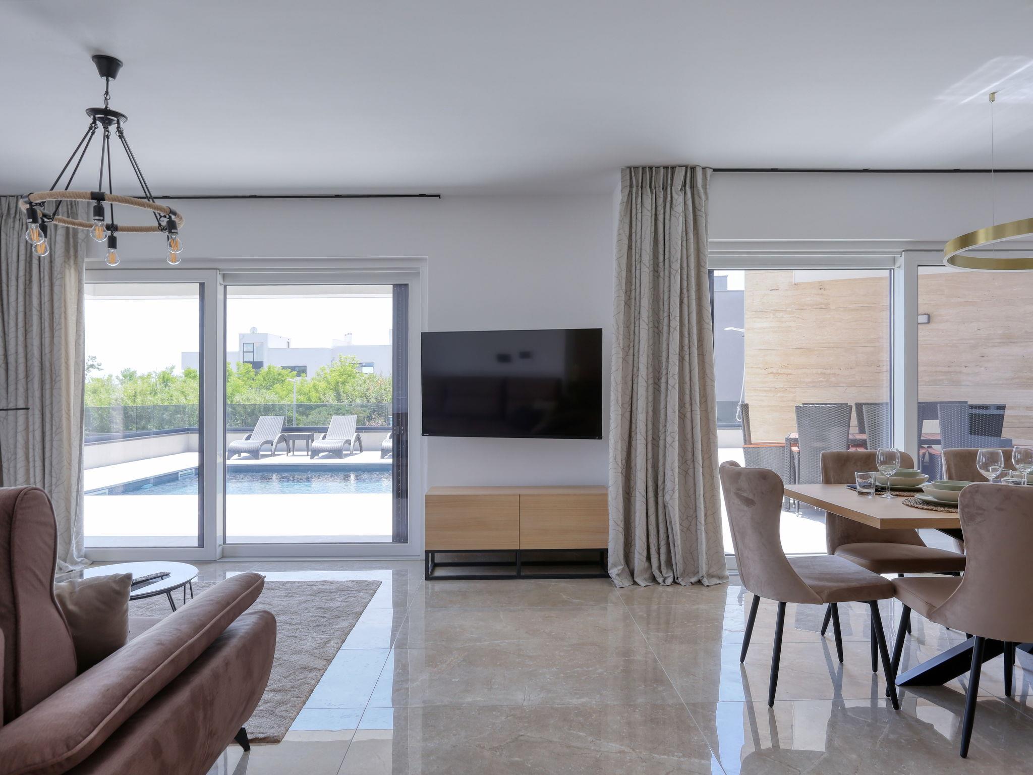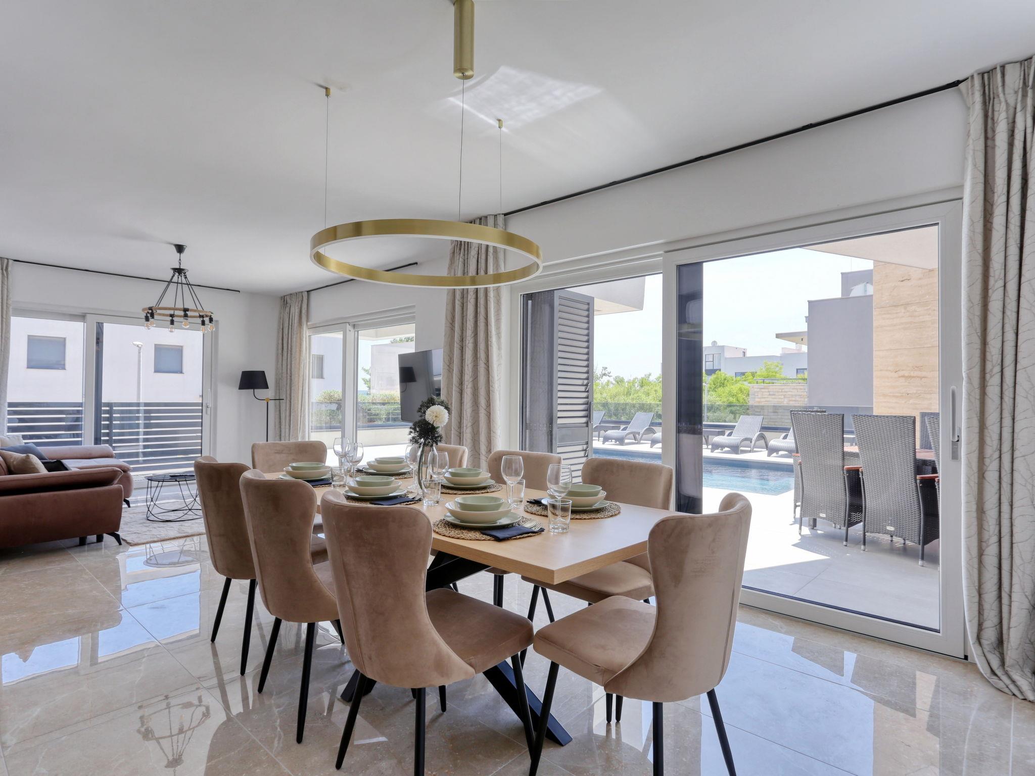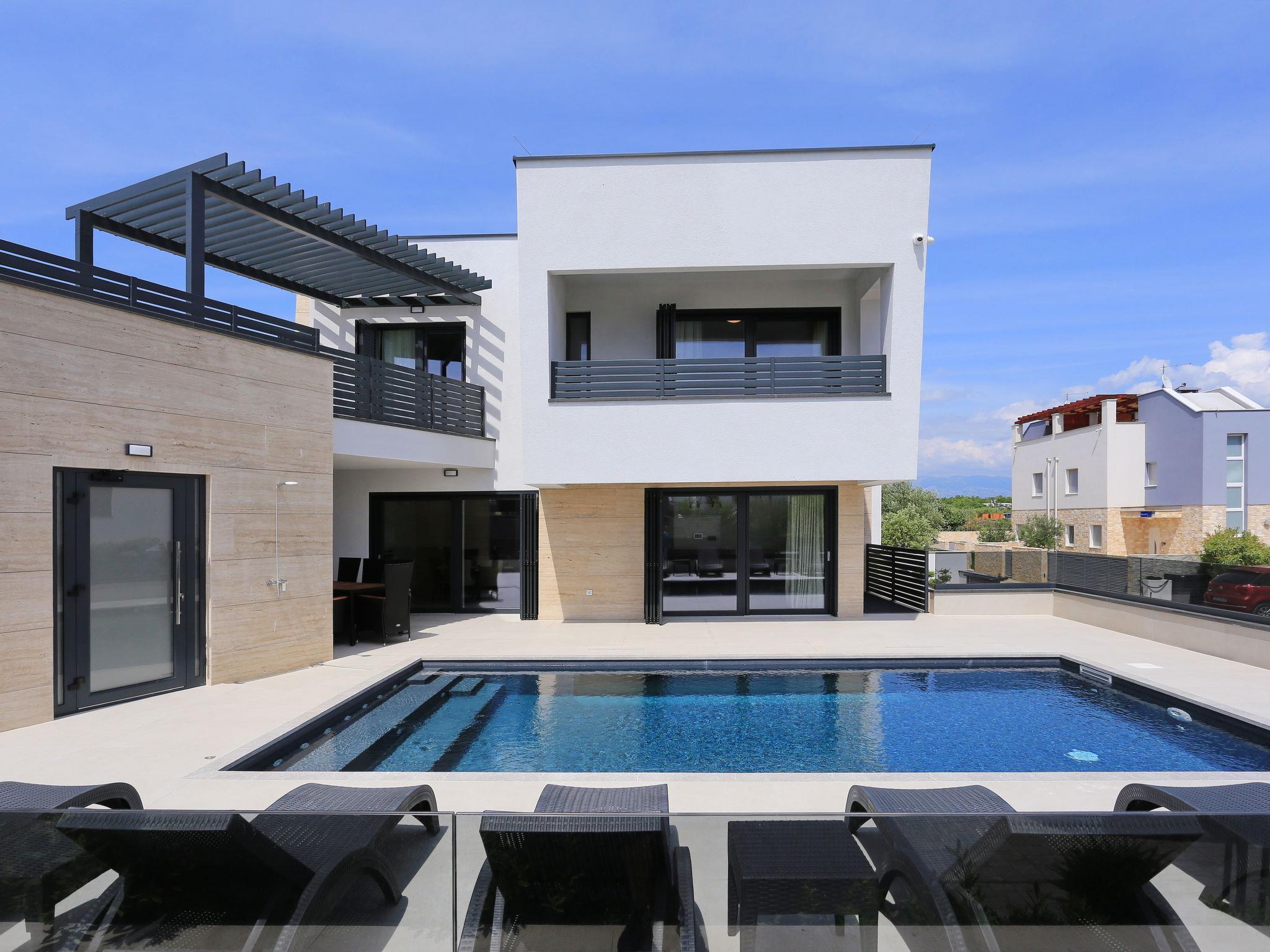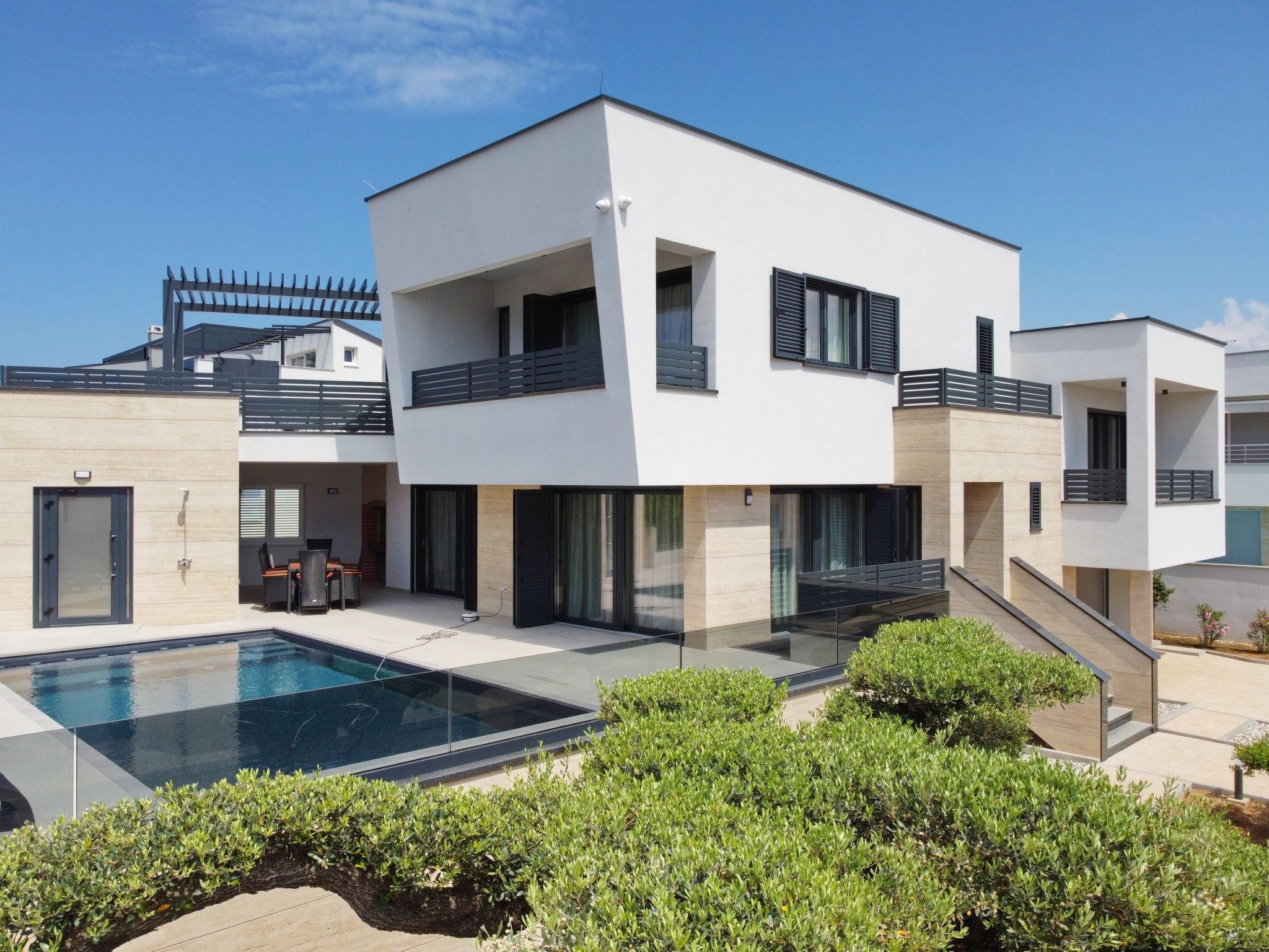 Modern single-family house "Villa Petra", 4 storeys, built in 2023. In the district of Mletak 3 km from the centre of Privlaka, in a sunny position, 170 m from the sea, 200 m from the beach. Private: property 680 m2 (fenced) with trees, swimming pool angular, heated (30 m2, depth 150 cm, seasonal availability: 01.May. - 01.Oct.) with internal staircase. Outdoor shower, barbecue, pool maintenance by the owner/gardener. In the house: internet access, sauna, billiard table. Parking (for 2 cars) at the house on the premises. Shop 300 m, supermarket 2 km, restaurant 2 km, bus stop 3.3 km, pebble beach 200 m. The owner does not accept any groups. The owner does not accept any youth groups. Please note: airfield 33 km from the property. In the basement: wine cellar (extra, on request), billiard room.