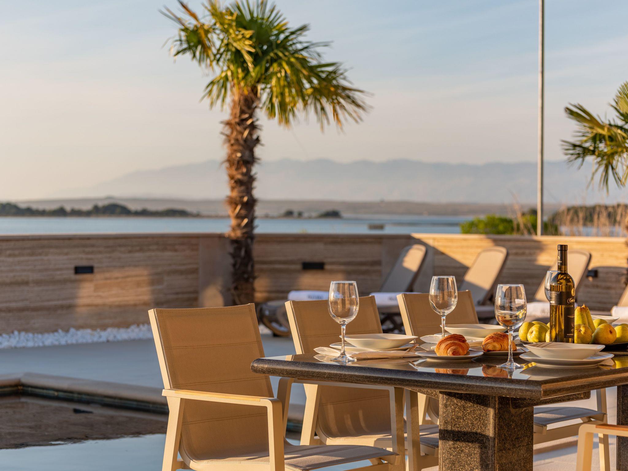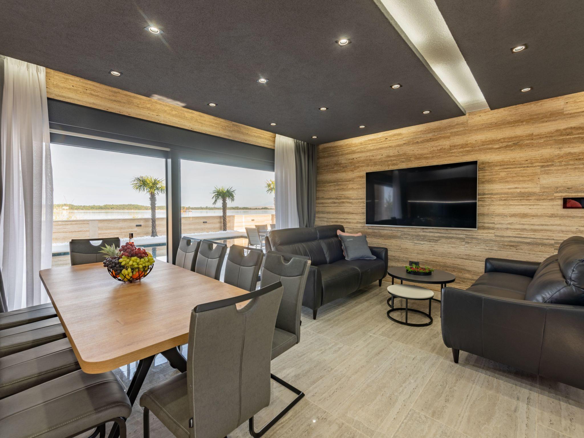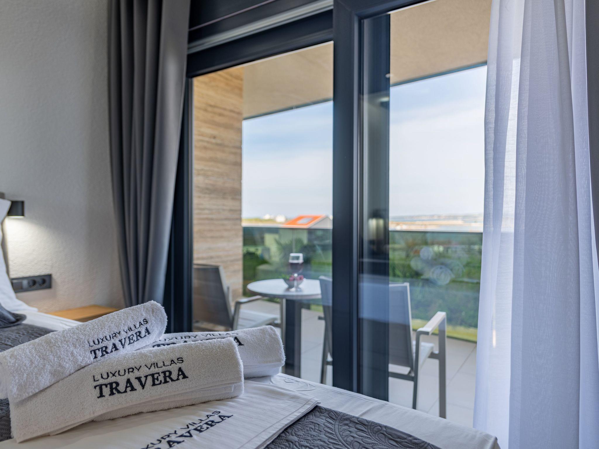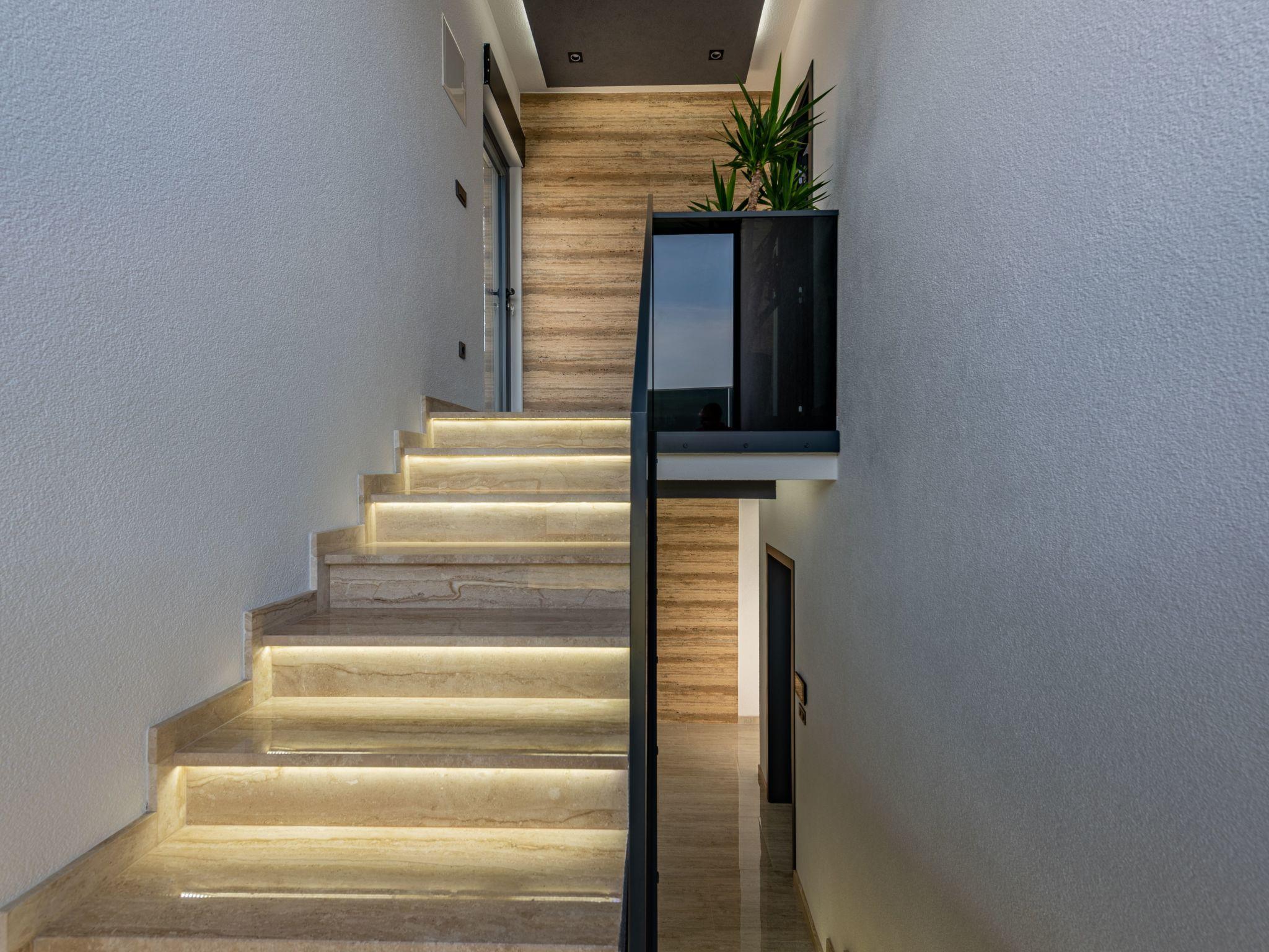 On the ground floor there is a stylish living room with pool view, dining room with fully equipped kitchen, one bedroom with double bed and en-suite bathroom with shower. On the first floor of the villa there are three bedrooms with double beds, each with en-suite bathroom with shower, while on the second floor there is a bedroom with double bed and en-suite bathroom with shower. Each bedroom has sea views and access to the terrace/balcony and all are equipped with satellite TV and air conditioning. The villa has a roof terrace with panoramic sea views and a seating area.