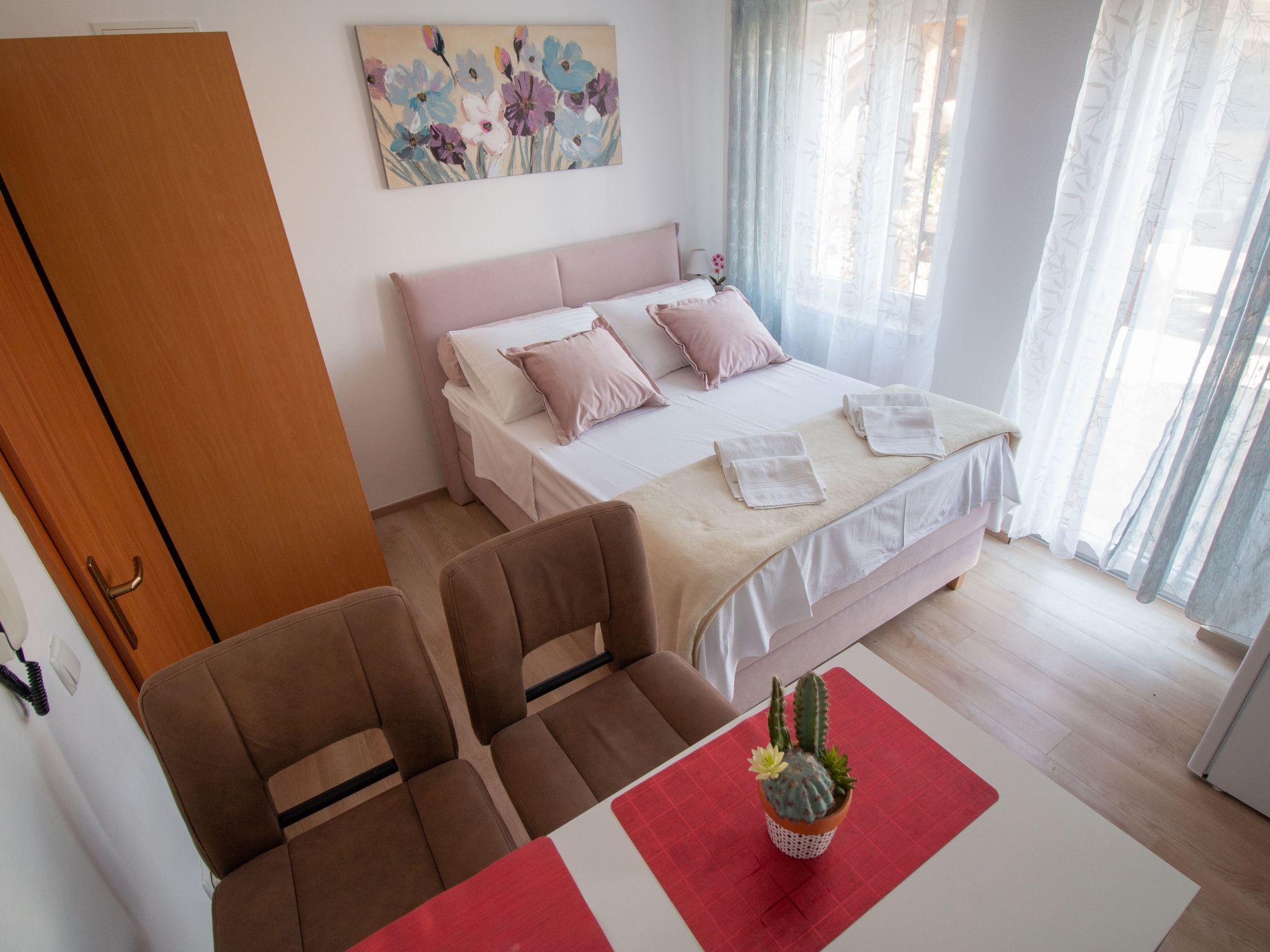 This air conditioned studio has an open plan living-/dining area with an integrated kitchen. There is a comfortable sofa that can be folded out into a double bed, and a dining table with chairs. All apartments are equipped with wi-fi and LCD satellite television.