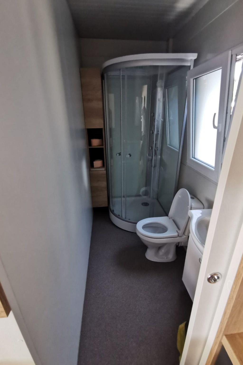 Inside, the mobile home boasts a well-thought-out layout equipped with all the essentials and more. Experience the comfort of air conditioning available throughout, ensuring a pleasant climate, regardless of the outdoor temperature. Entertainment is readily available with an LCD TV featuring DV channels, IPTV through the MaxTV app, and Netflix access, providing endless viewing options for those evenings in. The inclusion of a dishwasher, gas cooker, induction hob, and a dedicated washing machine makes daily chores a breeze, allowing you more time to enjoy your vacation. Additionally, the warmth of the fireplace adds a cozy touch to the space, creating a homely atmosphere.