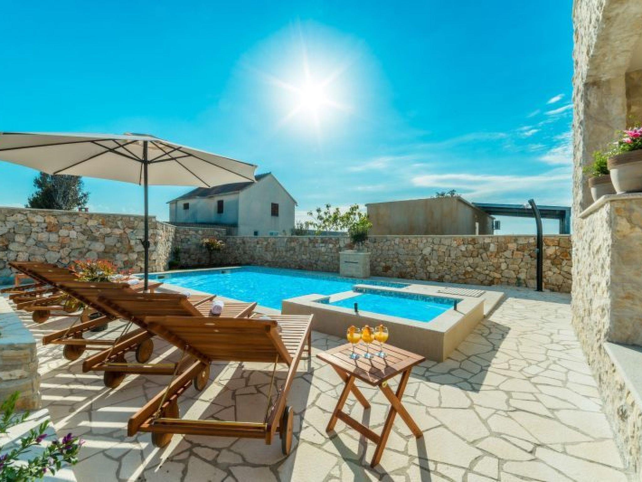 The villa has a private swimming pool with jacuzzi in the garden with deck chairs.