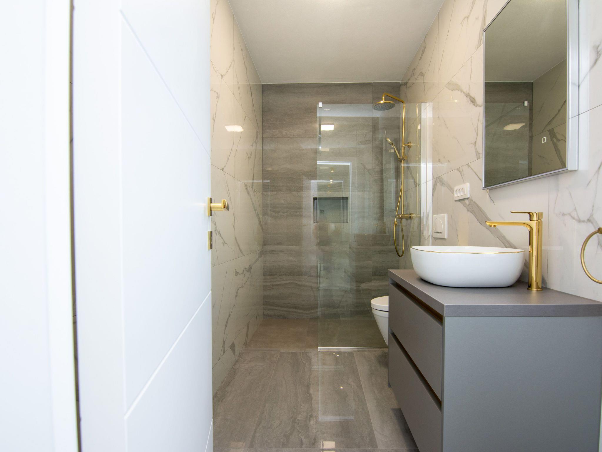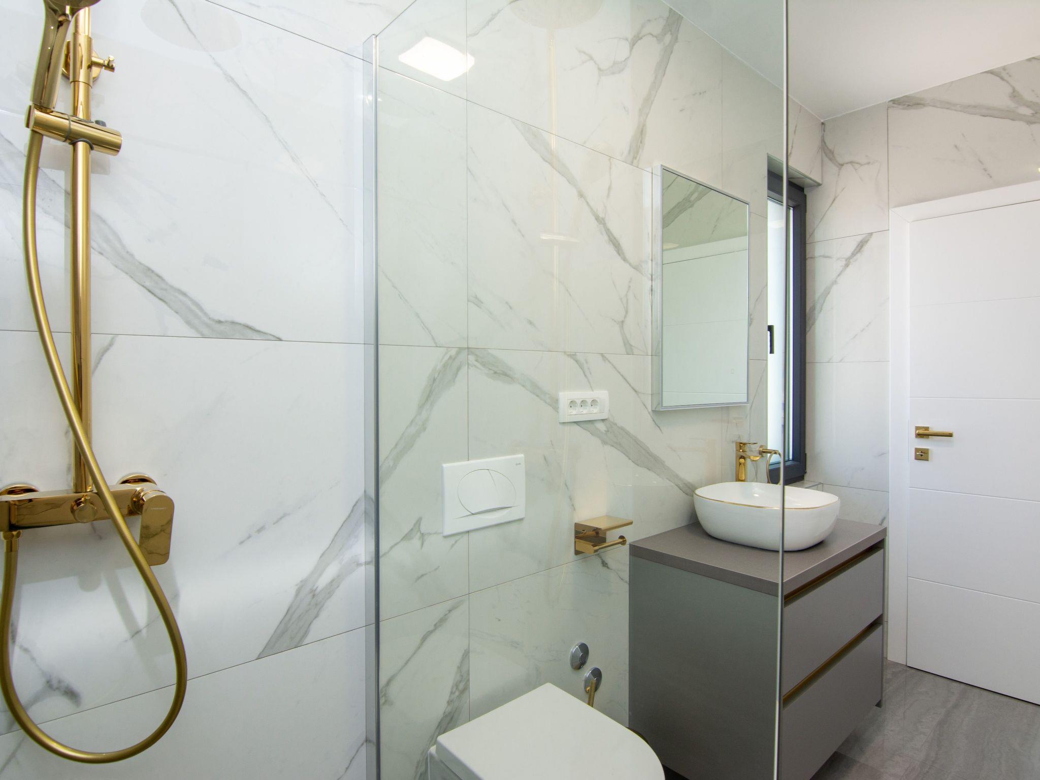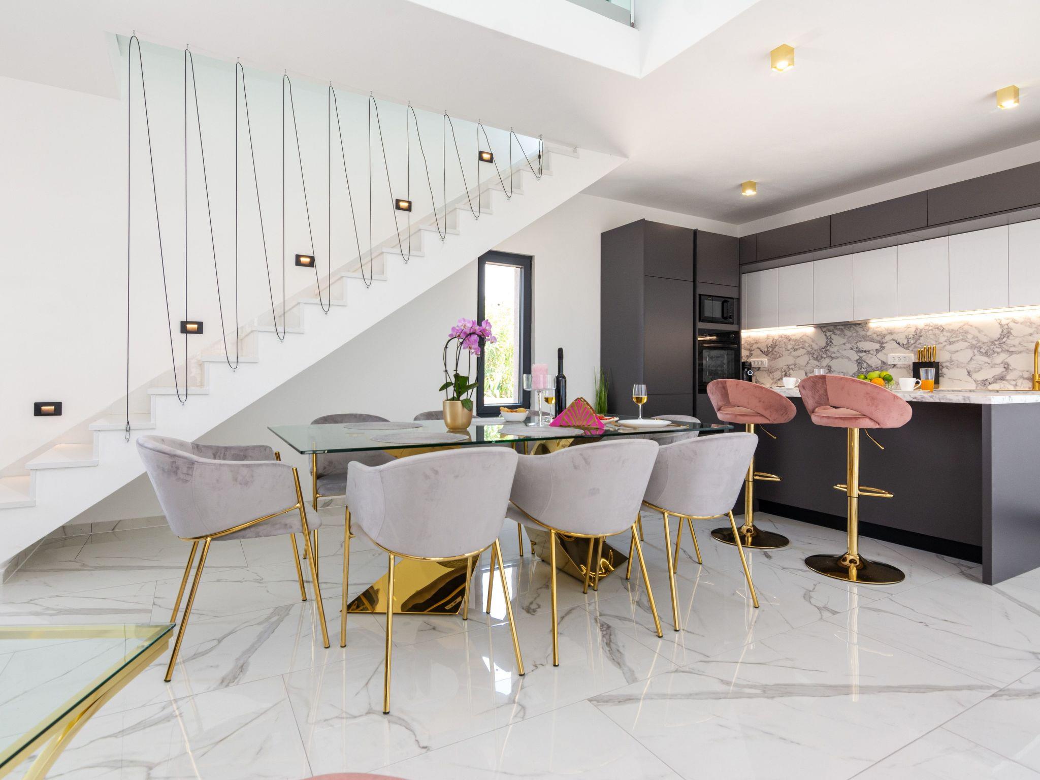 The 200 m² of living space is spread over two floors and is divided into a ground floor with a fully equipped kitchen, a dining room, a living room with partial sea views, an additional toilet and a bedroom with a double bed and en-suite bathroom. Upstairs, the space is divided into three double bedrooms with two bathrooms, one room with an en-suite bathroom and two rooms that share a bathroom. All bedrooms on the first floor have access to a balcony and views of the sea. On the ground floor, the kitchen, dining room and living room have partial sea views.