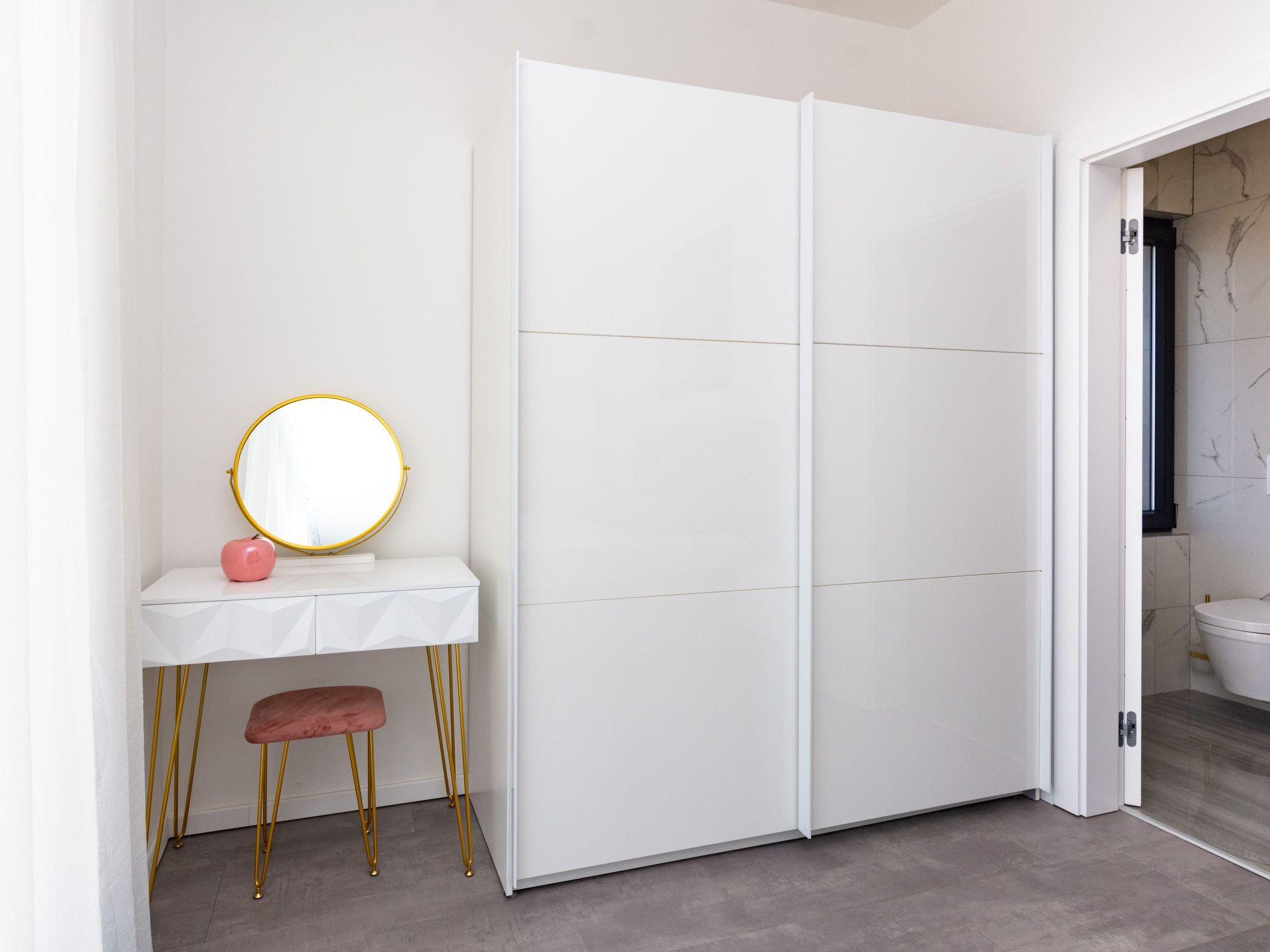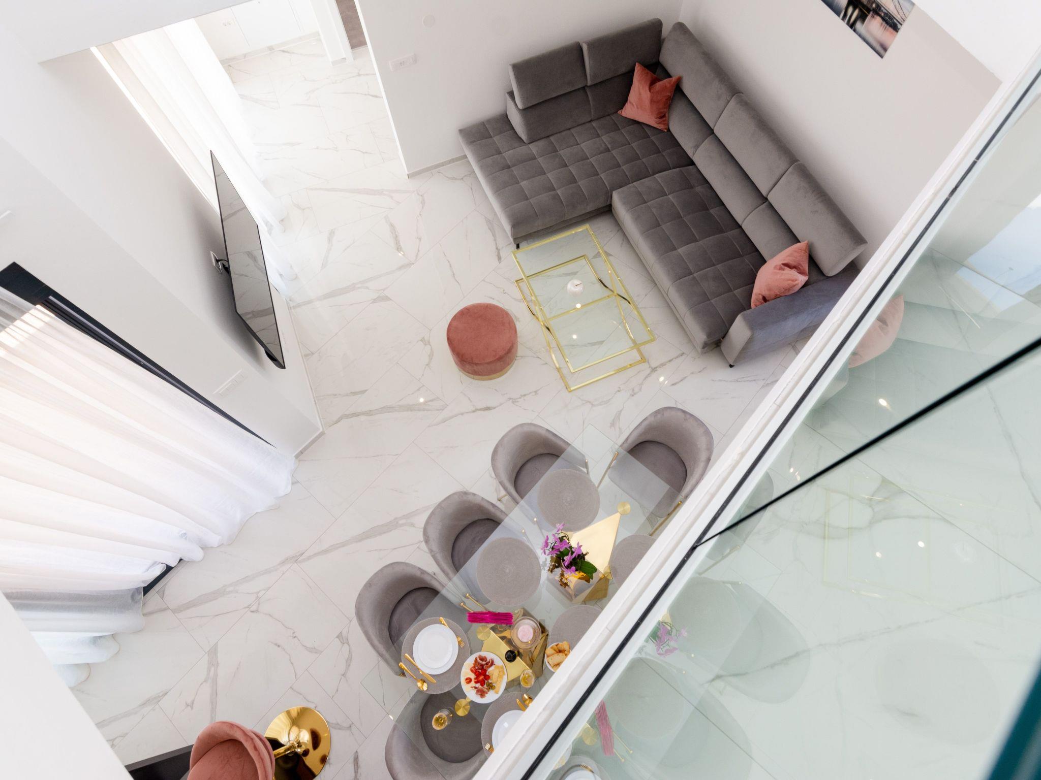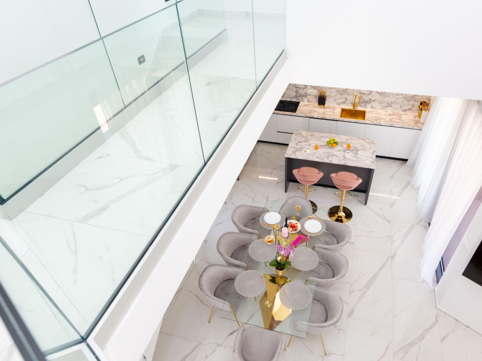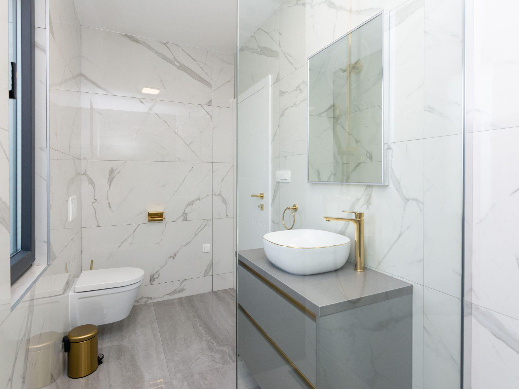 The 200 m² of living space is spread over two floors and is divided into a ground floor with a fully equipped kitchen, a dining room, a living room with partial sea views, an additional toilet and a bedroom with a double bed and en-suite bathroom. Upstairs, the space is divided into three double bedrooms with two bathrooms, one room with an en-suite bathroom and two rooms that share a bathroom. All bedrooms on the first floor have access to a balcony and views of the sea. On the ground floor, the kitchen, dining room and living room have partial sea views.