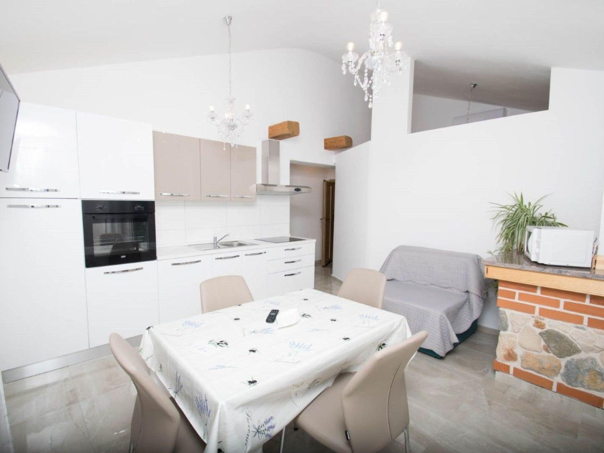 The apartment consists of two bedrooms, a bathroom, a living room, a kitchen, and a balcony with an enchanting view of the sea. It is located only 100 meters from the sea and has a beautiful sandy beach. The beach is suitable for children and adults due to its shallow entrance and soft sand, making it perfect for a family vacation. Guests also have a shared garden with a fireplace, perfect for preparing meals outdoors and enjoying the Dalmatian environment.
