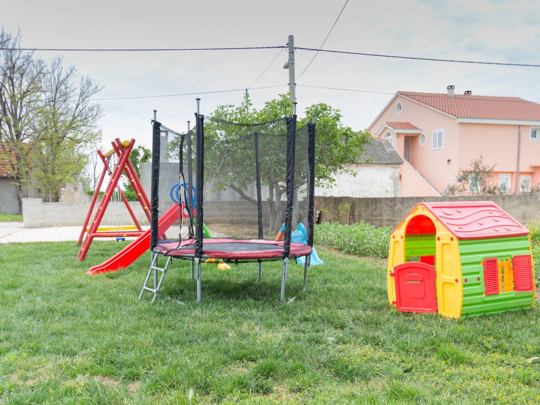 The exterior of Apartment Nikol is equally inviting, featuring a communal garden that beckons with a variety of leisure facilities. Children will delight in the trampoline, playhouse, swings, and slide, ensuring hours of entertainment. Adults can look forward to relaxing moments on the outdoor terrace, which comes equipped with a barbecue and outdoor furniture – ideal for intimate gatherings and memorable meals under the stars.