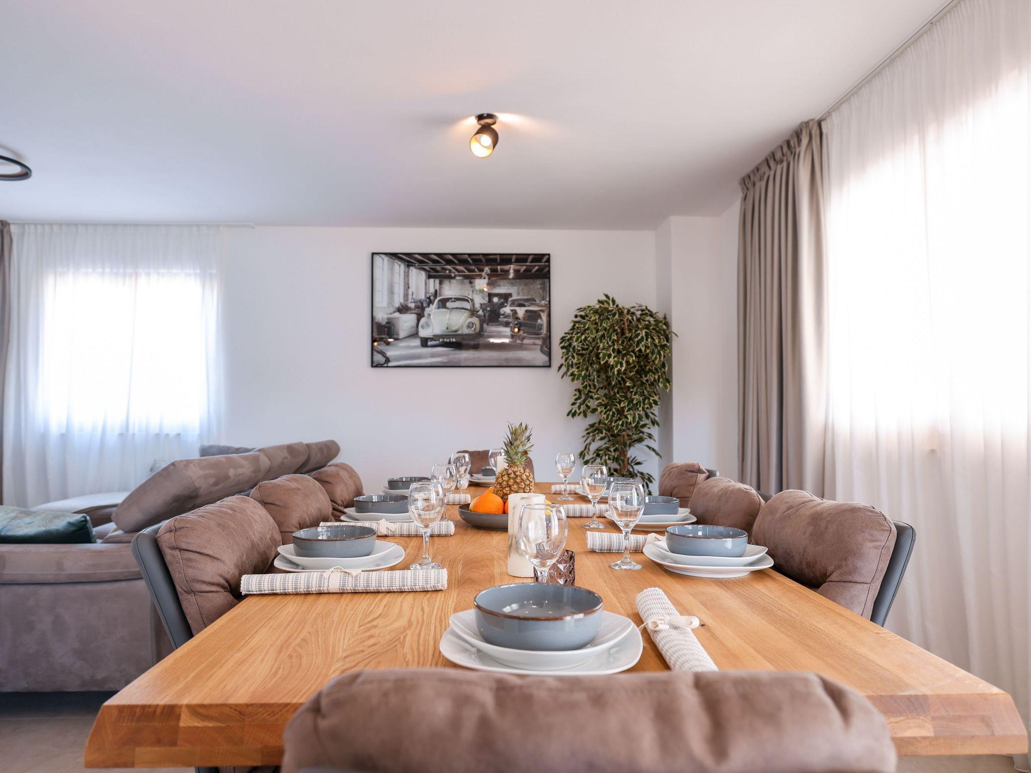 The house consists of ground and first floor. On the ground floor there is a living room with TV and multimedia, as well as an open-concept kitchen and dining room and one shower bathroom. On the first floor there are three bedrooms and two bathrooms. One bathroom is in the master bedroom, and the other is in the hallway. The upper floor has a balcony with a view of the garden and the surrounding area. The house has 100m2, with the garden, 600m2. Outside the house there is a heated swimming pool with deckchairs, and right at the exit from the house to the terrace there is a large table and chairs for lunch or dinner by the outdoor pool.
