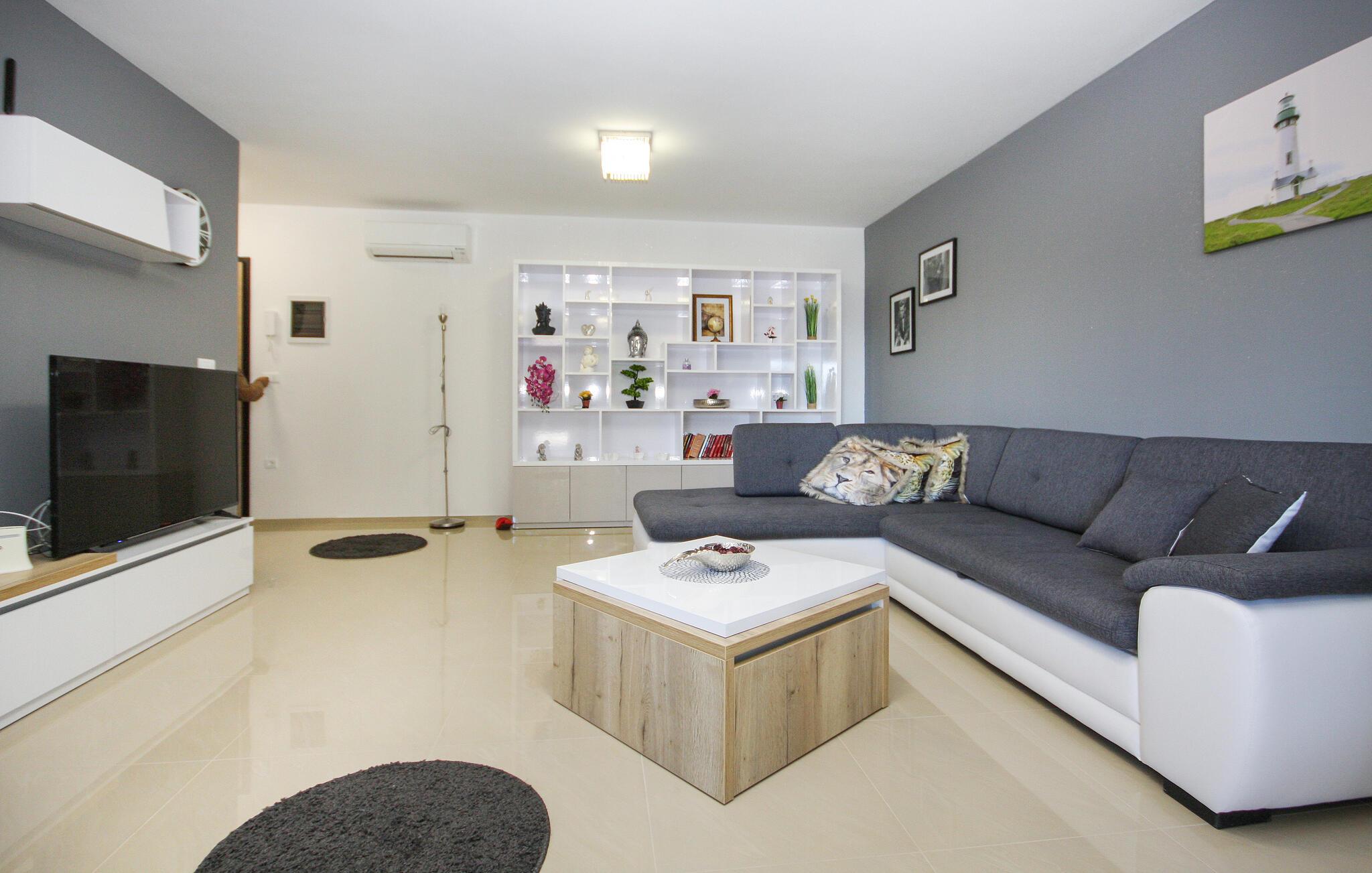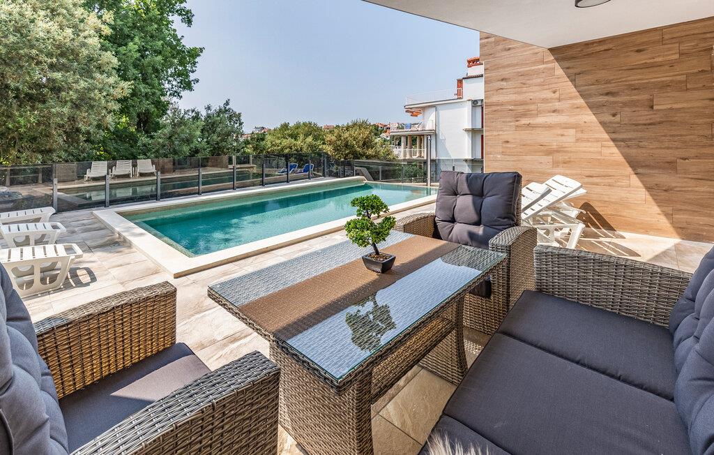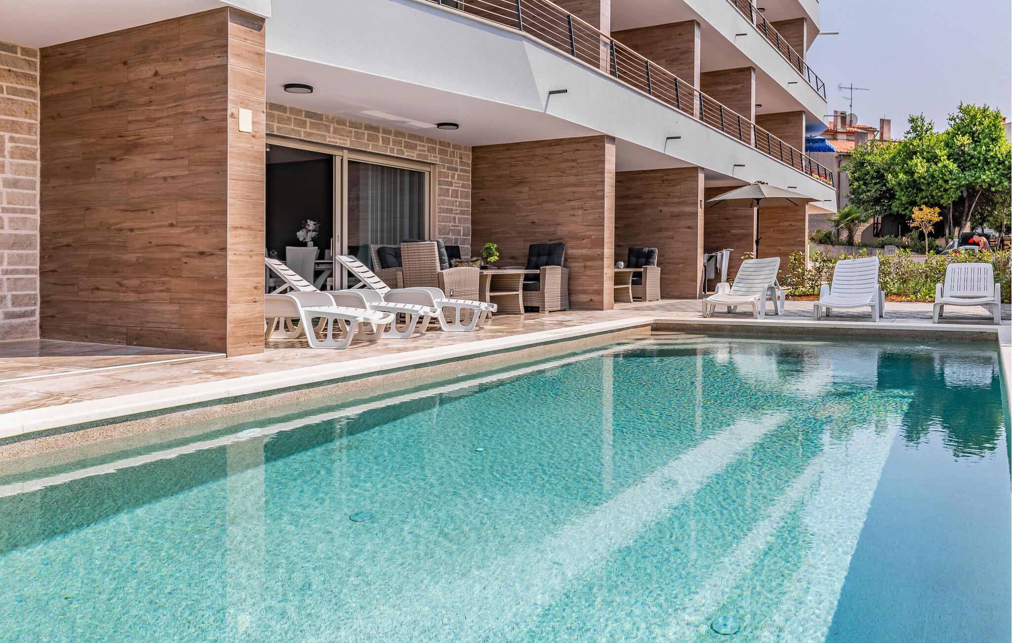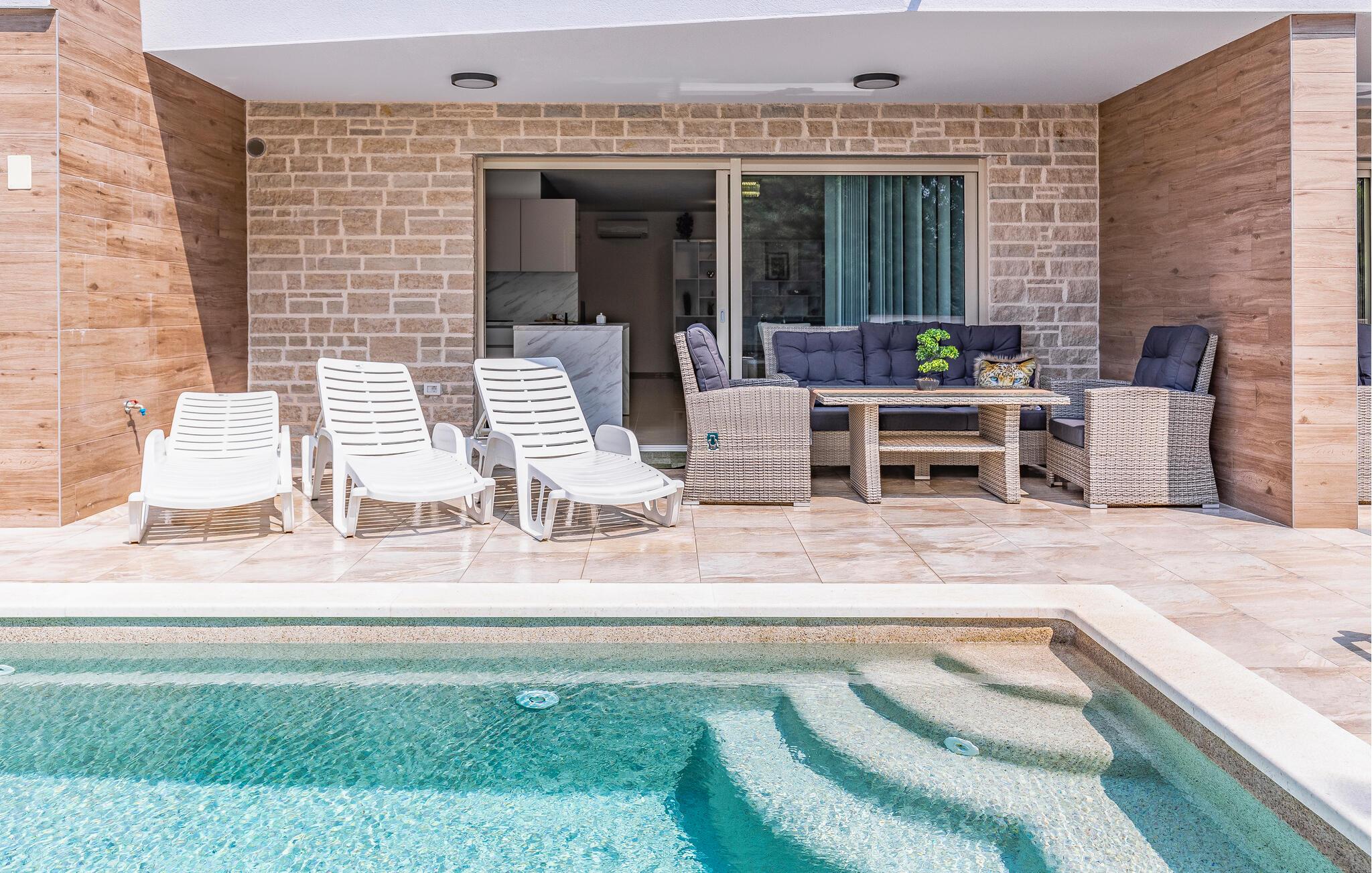 Nyd en solrig ferie i denne moderne ferielejlighed med privat pool. Denne komfortable lejlighed i stueetagen ligger kun få skridt fra sandstranden og byder jer velkommen med et stilfuldt møbleret interiør. Tilbered kulinariske lækkerier og glæd jer til harmoniske måltider i den indbydende spisestue. Efter en lang dag kan I slappe af på sofaen til en filmaften eller et brætspil. Start dagen med en afslappet svømmetur i den pragtfulde pool og nyd derefter morgenmaden på terrassen. Lad op på liggestolene og afslut aftenen med et glas vin i den varme sommerluft. Udforsk Pulas gamle bydel og beundr det imponerende romerske amfiteater og de historiske templer. Oplev skjulte bugter og små øer på en bådtur og vandr gennem Kamenjak Naturpark, hvor imponerende klipper og afsondrede strande venter på jer. Om aftenen inviterer Pulas havnepromenade og små kystrestauranter jer til at nyde en afslappende afslutning på dagen med frisk fisk og skaldyr.
