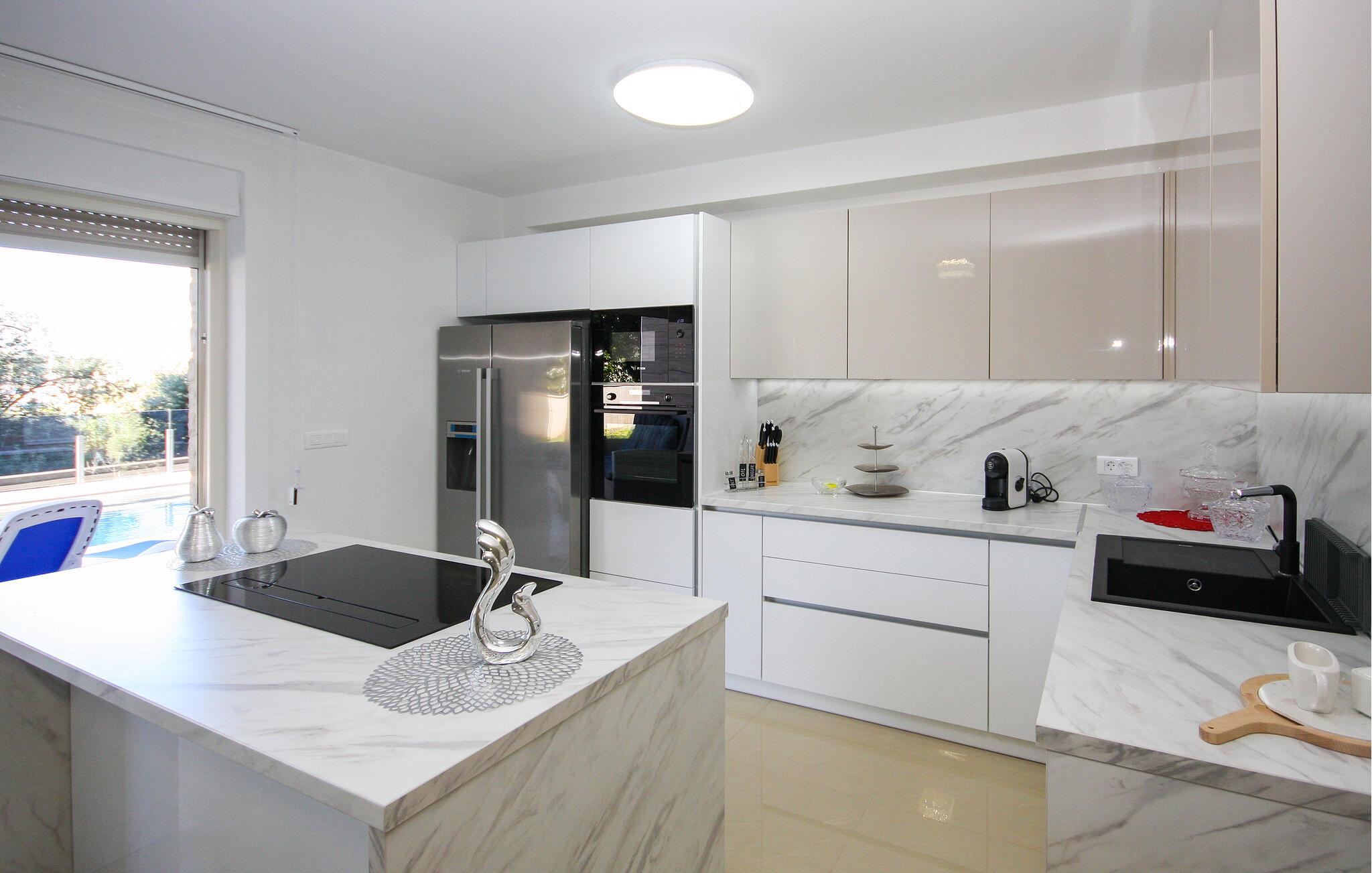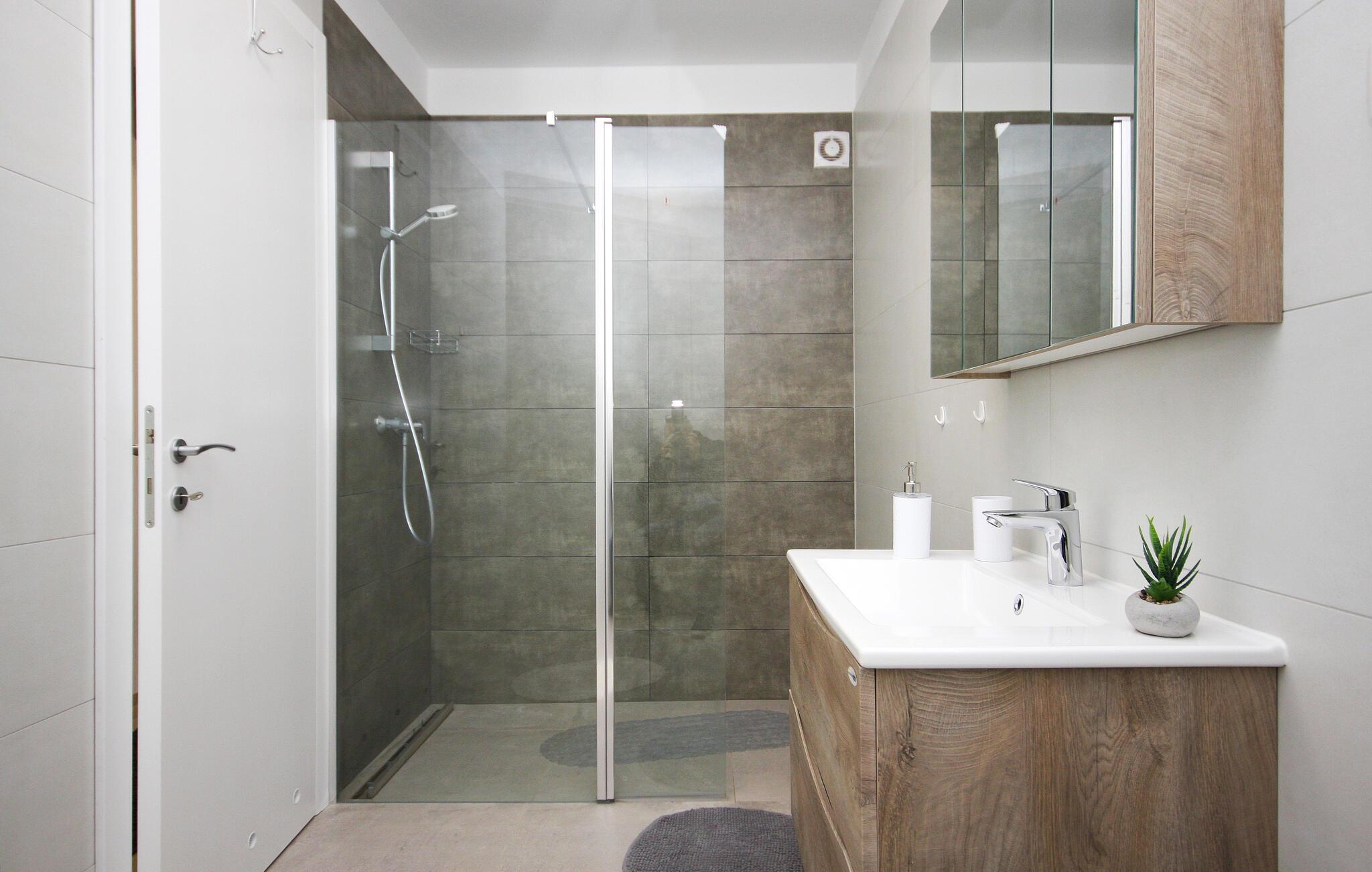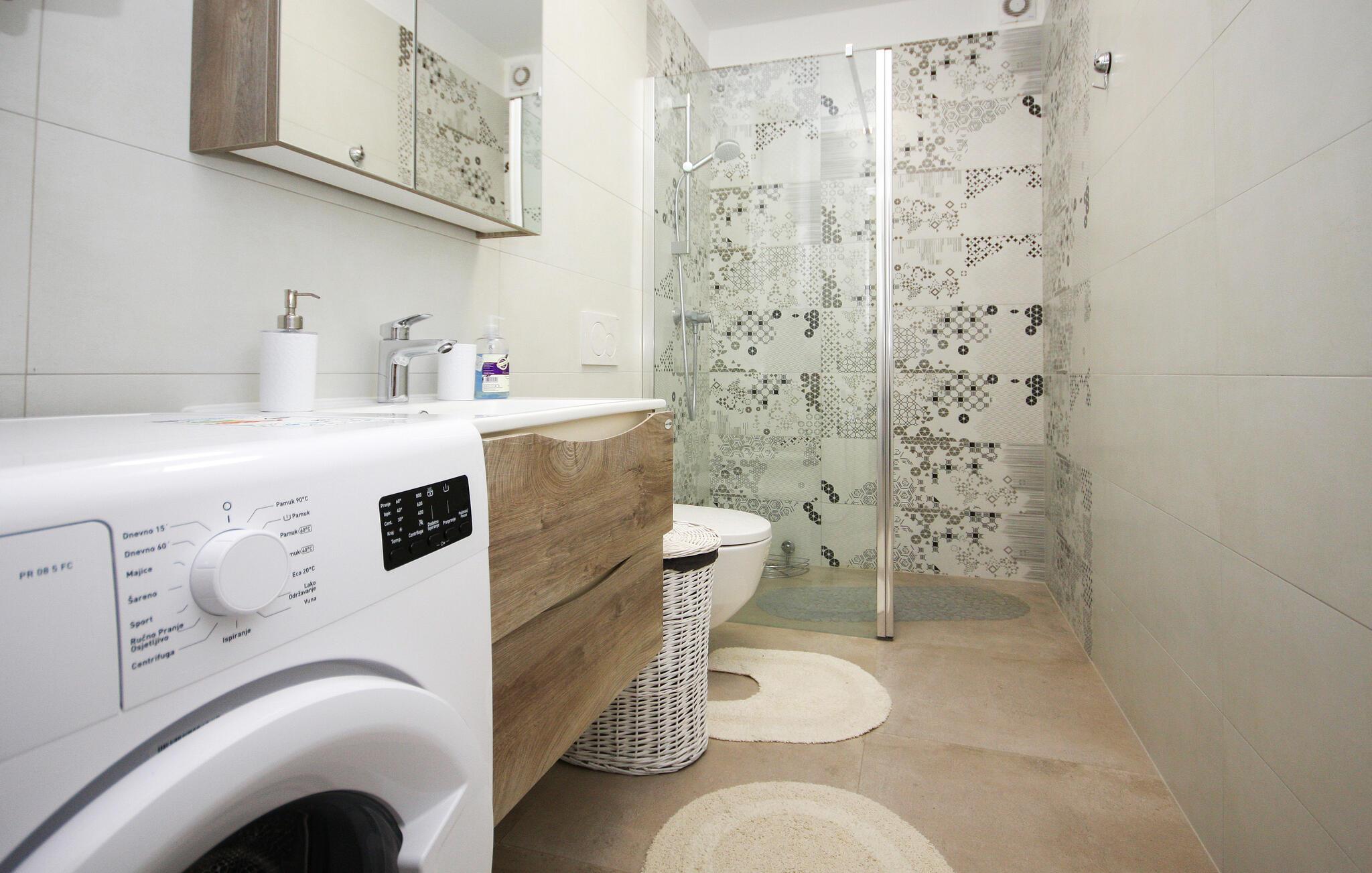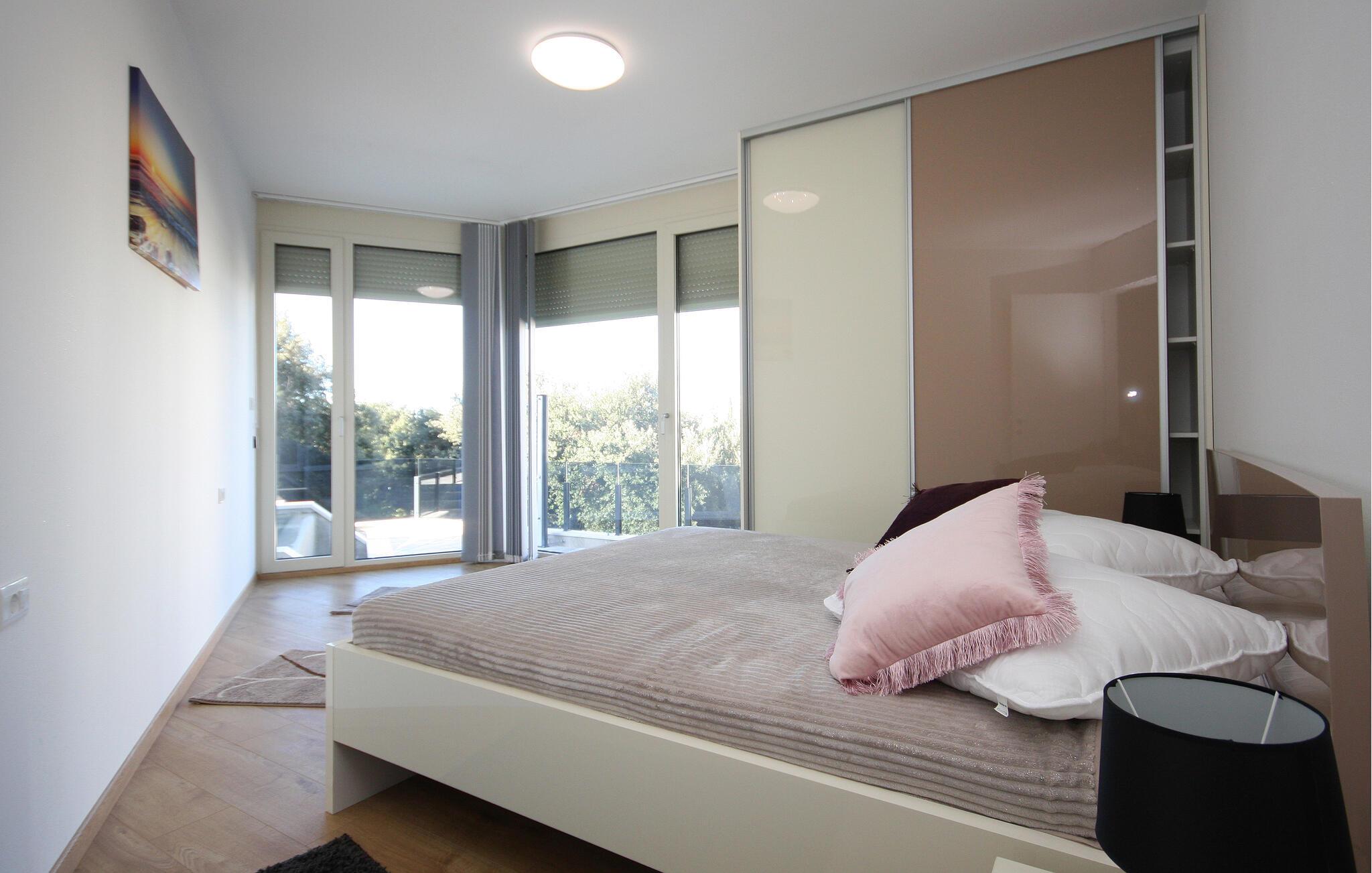 Nyd en solrig ferie i denne moderne ferielejlighed med privat pool. Denne komfortable lejlighed i stueetagen ligger kun få skridt fra sandstranden og byder jer velkommen med et stilfuldt møbleret interiør. Tilbered kulinariske lækkerier og glæd jer til harmoniske måltider i den indbydende spisestue. Efter en lang dag kan I slappe af på sofaen til en filmaften eller et brætspil. Start dagen med en afslappet svømmetur i den pragtfulde pool og nyd derefter morgenmaden på terrassen. Lad op på liggestolene og afslut aftenen med et glas vin i den varme sommerluft. Udforsk Pulas gamle bydel og beundr det imponerende romerske amfiteater og de historiske templer. Oplev skjulte bugter og små øer på en bådtur og vandr gennem Kamenjak Naturpark, hvor imponerende klipper og afsondrede strande venter på jer. Om aftenen inviterer Pulas havnepromenade og små kystrestauranter jer til at nyde en afslappende afslutning på dagen med frisk fisk og skaldyr.