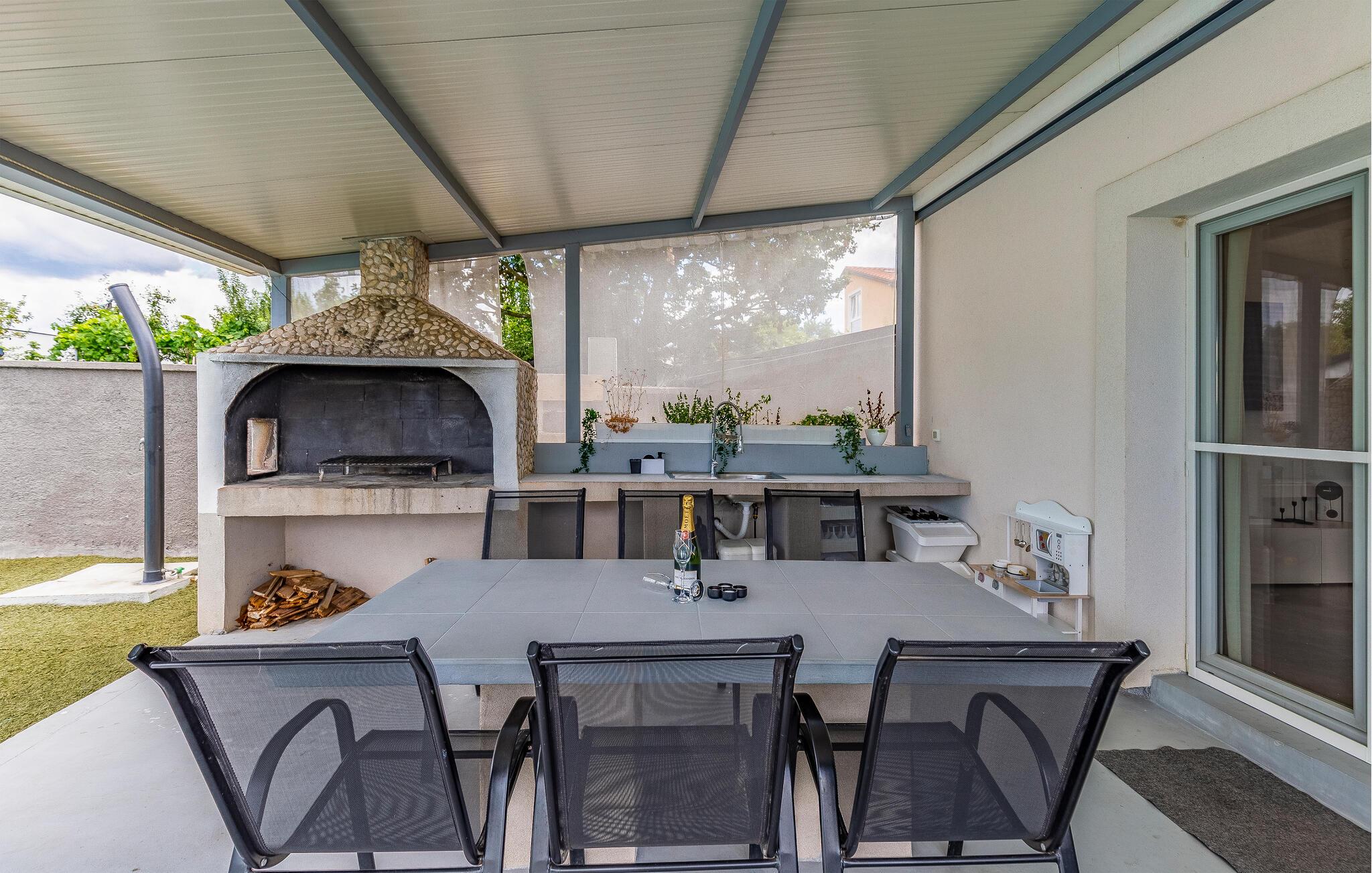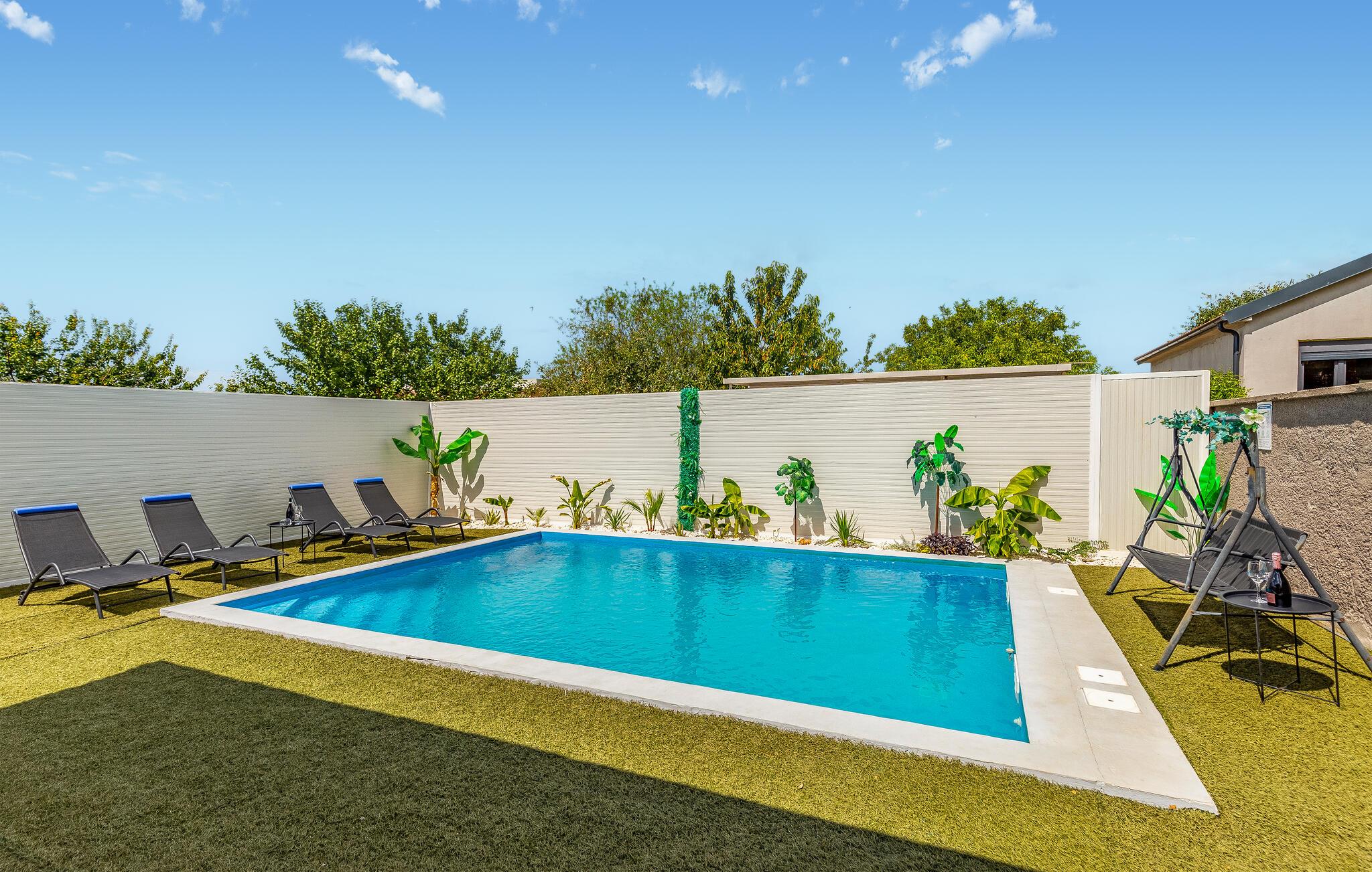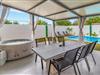 Udenfor er der en skøn pool med nem trappeadgang. Forkæl jer selv med en forfriskende svømmetur, lige når I har lyst. Om aftenen indbyder den overdækkede terrasse til hyggelige grillaftener.