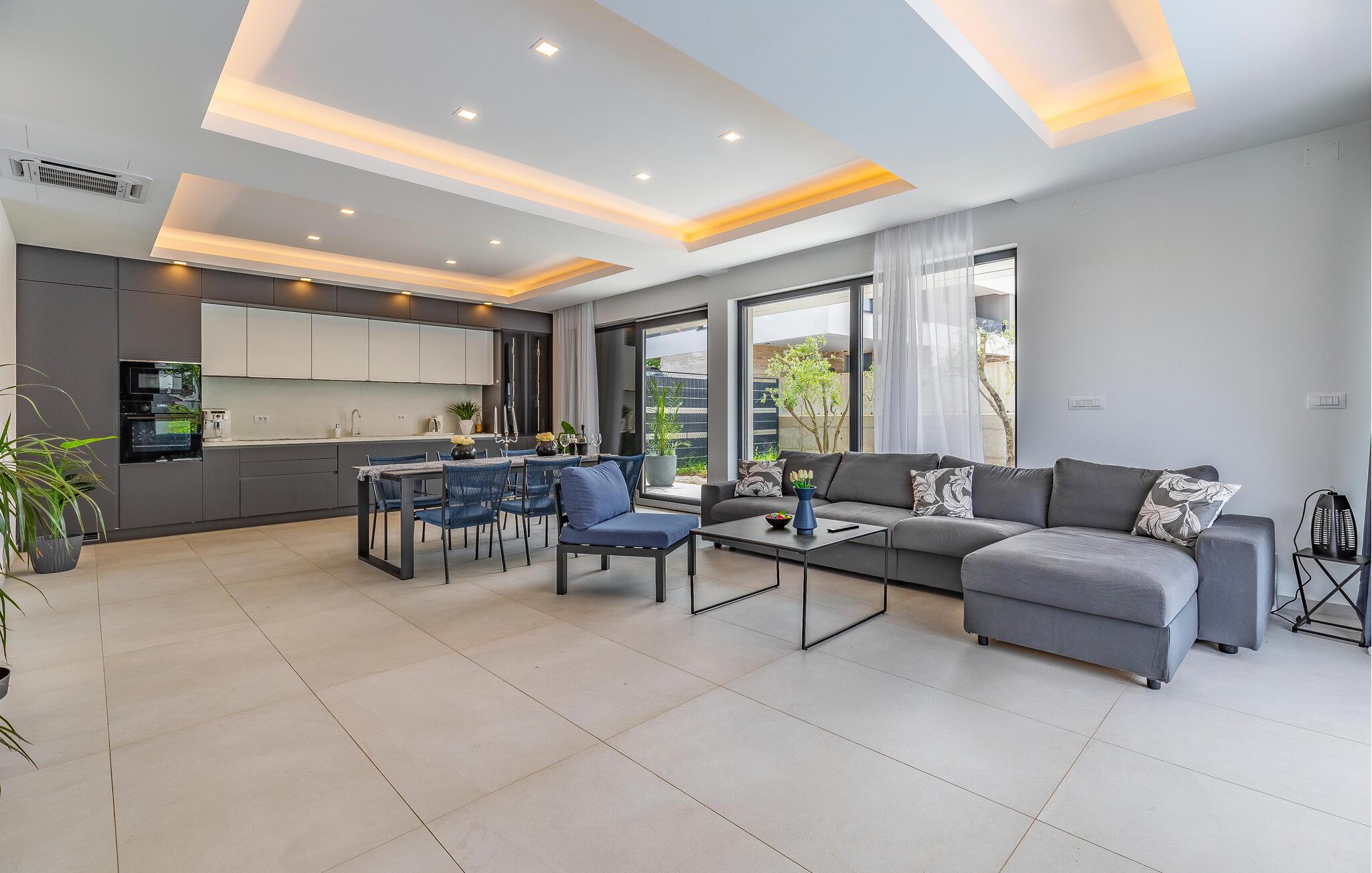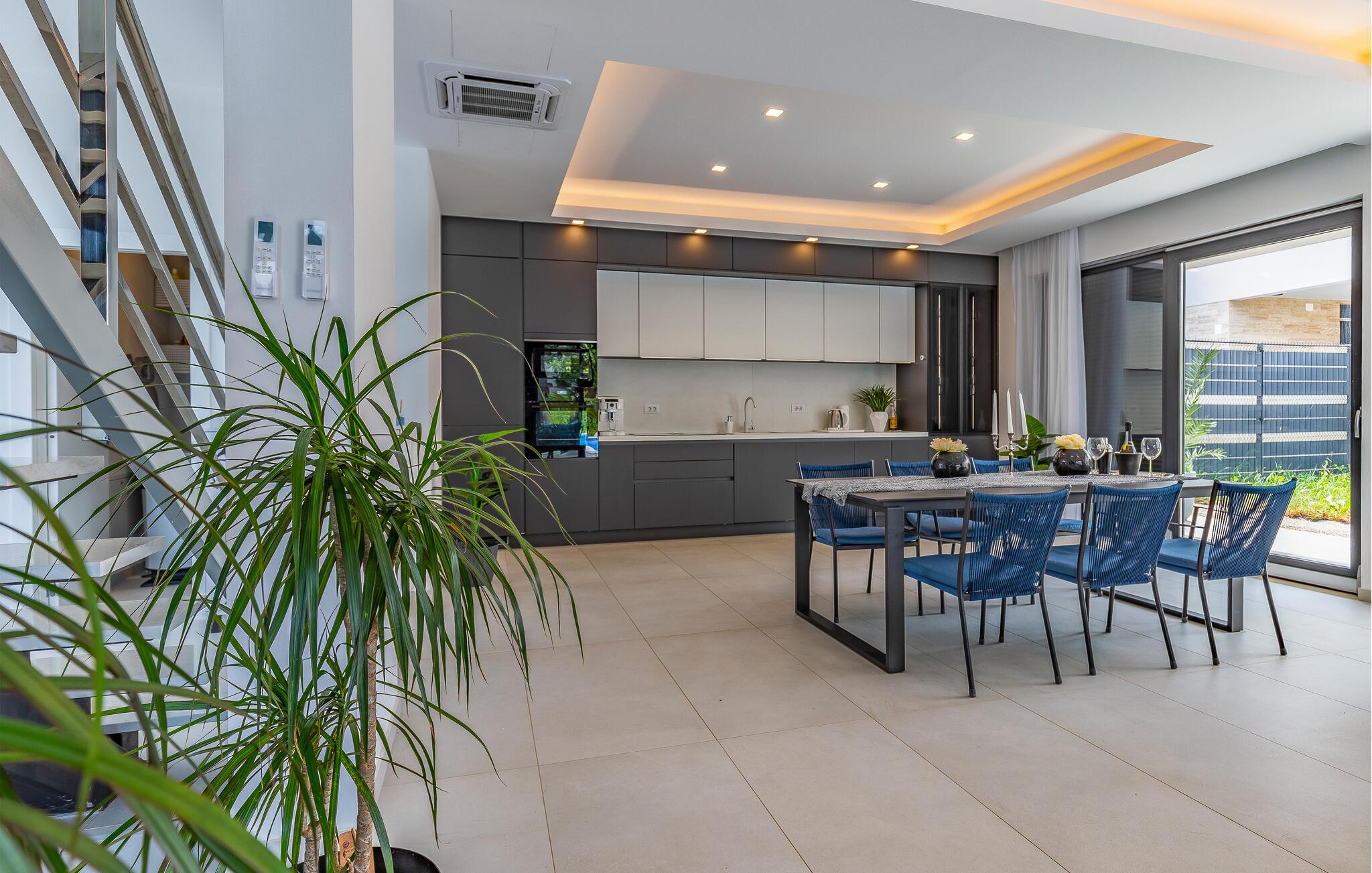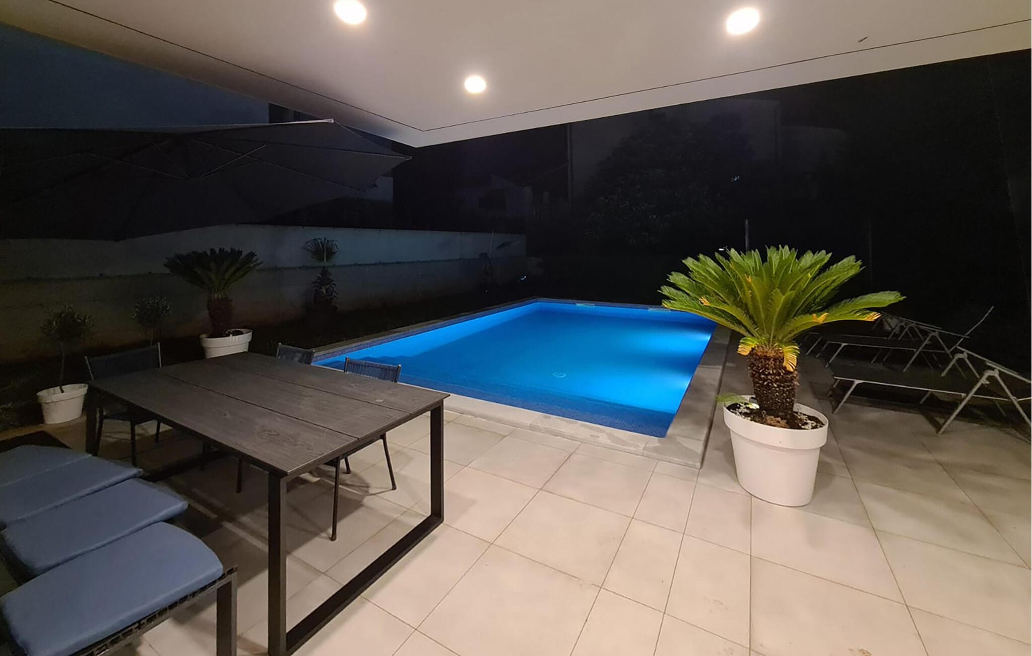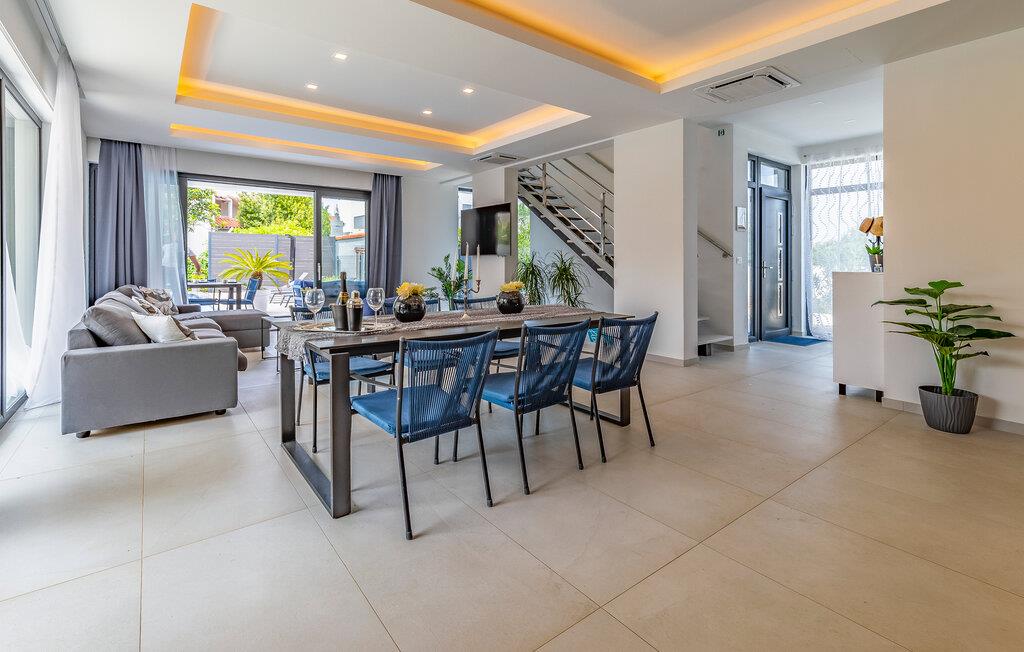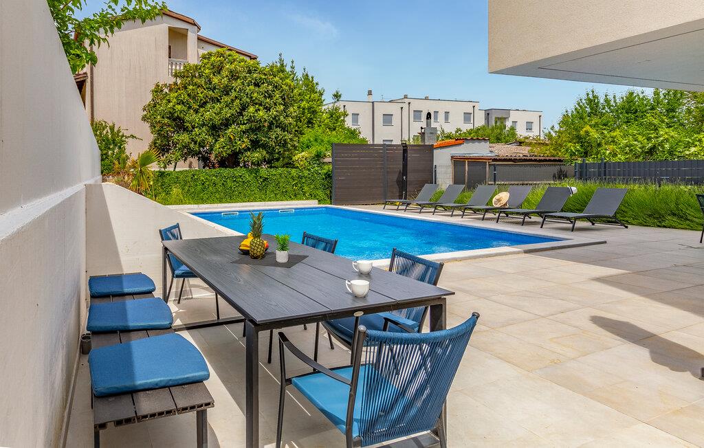 Velkommen til dette flotte og smagfulde feriehus, ikke langt fra Pulas centrum. Gør det til jeres hjem og tilbring en afstressende ferie i en bolig med høj komfort og interiør af høj kvalitet. Samspillet mellem lyse og mørke elementer skaber en fantastisk boligoplevelse, der gør det nemt for jer at slappe af. I bestemmer selv, om I vil bade i poolen eller solbade på tagterrassen.