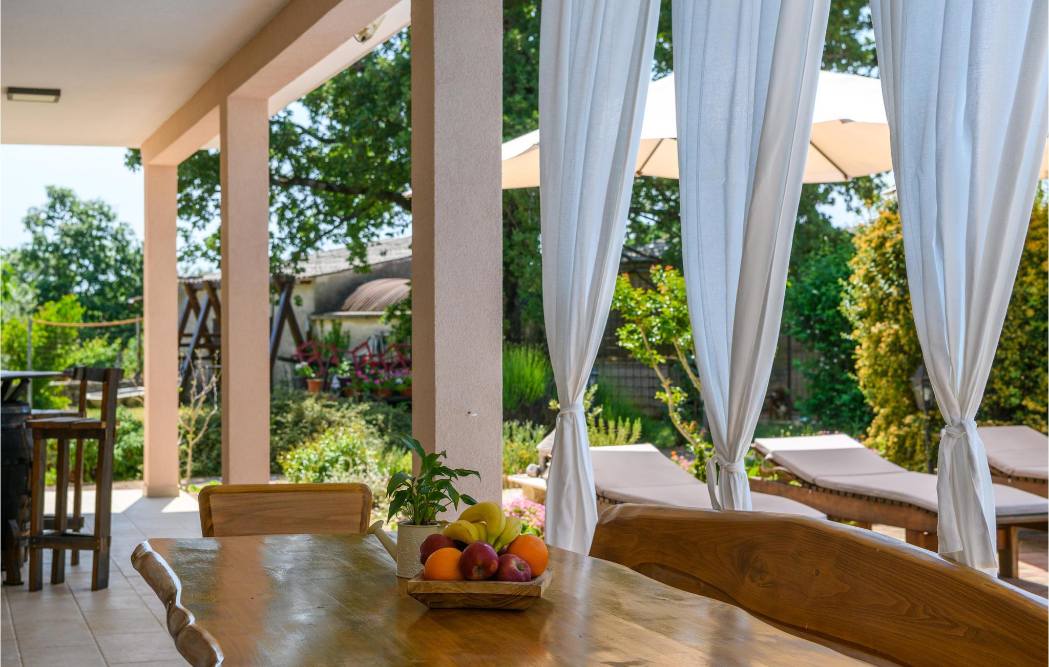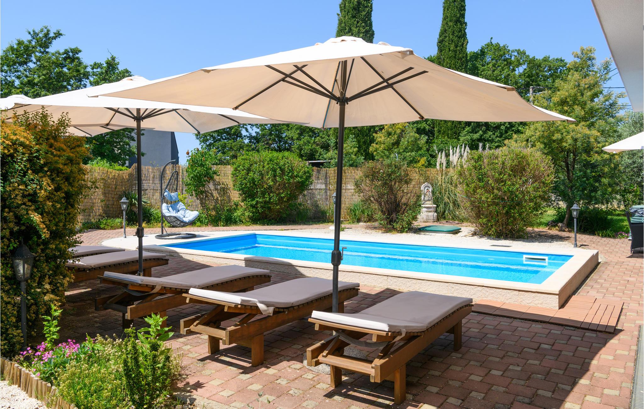 Dette dejlige og særdeles komfortable feriehus ligger i den lille by Krvavice. Det er indbydende møbleret og rummene holdt i klare farver. På øverste etage er der soveværelser, mens stuen med udgang til den skønne terrasse ligger i stueplan. Huset er ideelt til en rolig og afslappet ferie, da det ligger i en lille landsby, jeres børn kan trygt lege på den komplet indhegnede grund. På de varme sommerdage frister poolen til en svømmetur eller til plasken og leg. Besøg forlystelsesparken med vilde forlystelser i nabobyen Glavani, eller tag en tur på hesteryg på Ranchen i landsbyen Manjadvorci. På en ca. 10 km lang køretur kommer i til de nærmeste strande i Duga Uvala, med badeland hvor jeres børn kan springe, klatre og plaske. Vi anbefaler også et besøg i den historisk interessante by Pula, med den antikke Arena og talrige kulturelle og historiske seværdigheder, mange arrangementer og et festligt natteliv.