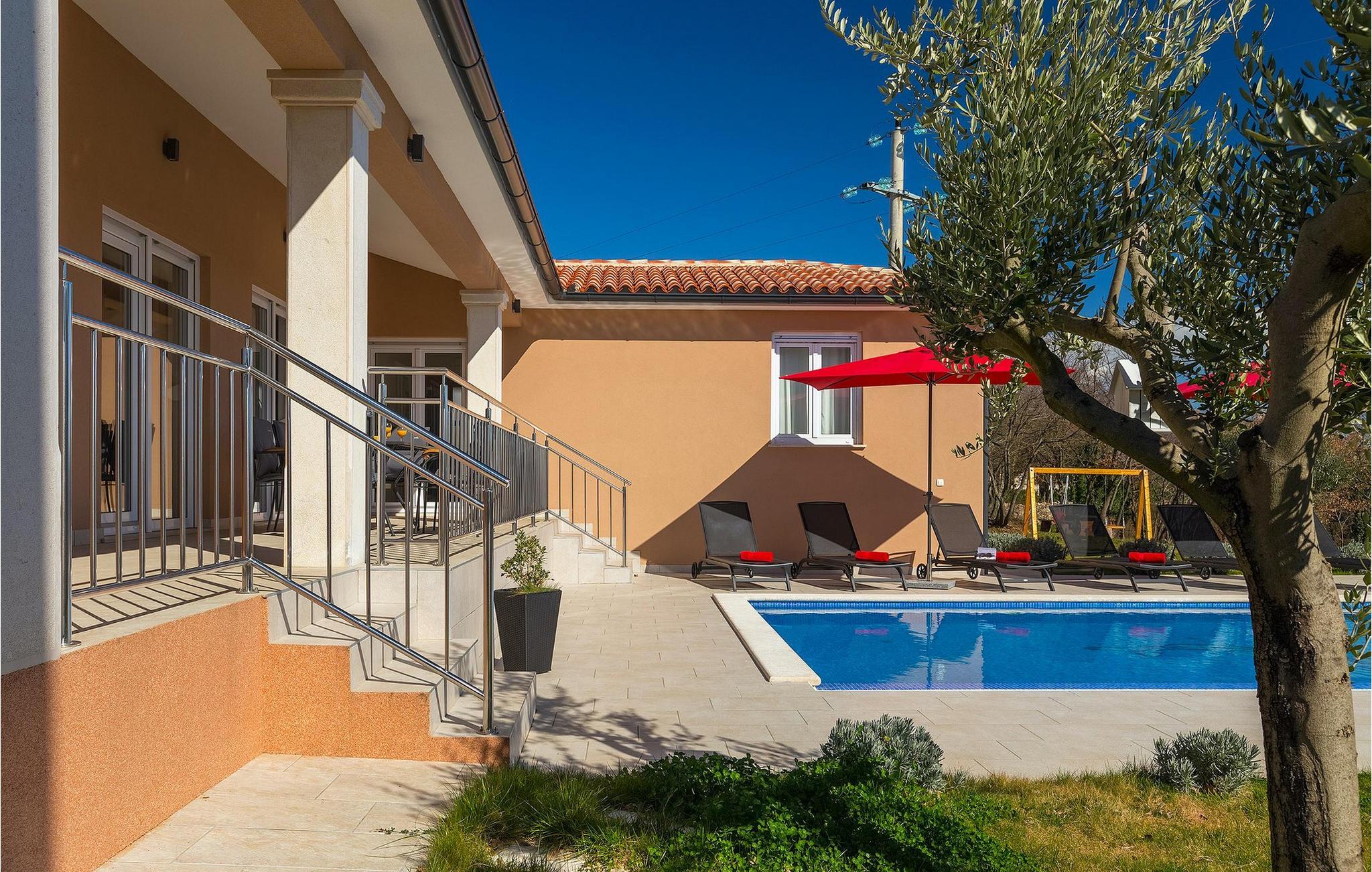 Uden for huset har du en dejlig swimmingpool med massagedyser - en velkomst forfriskning på varme sommerdage - med 8 liggestole til solbadning og afslapning. Den store have med en gynge er ideel for dine børn at lege og have det sjovt.