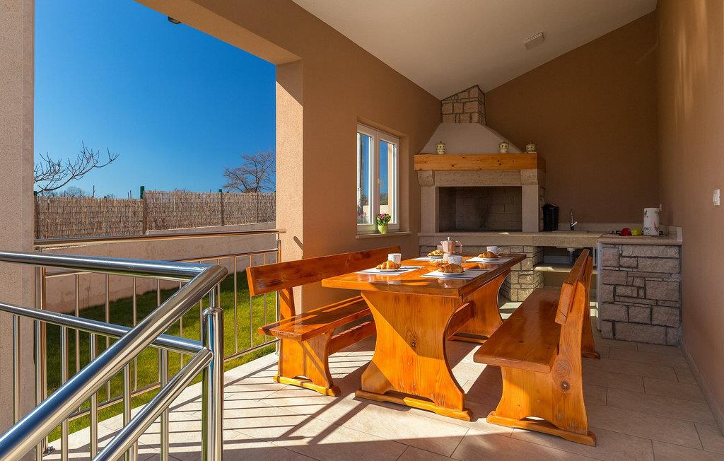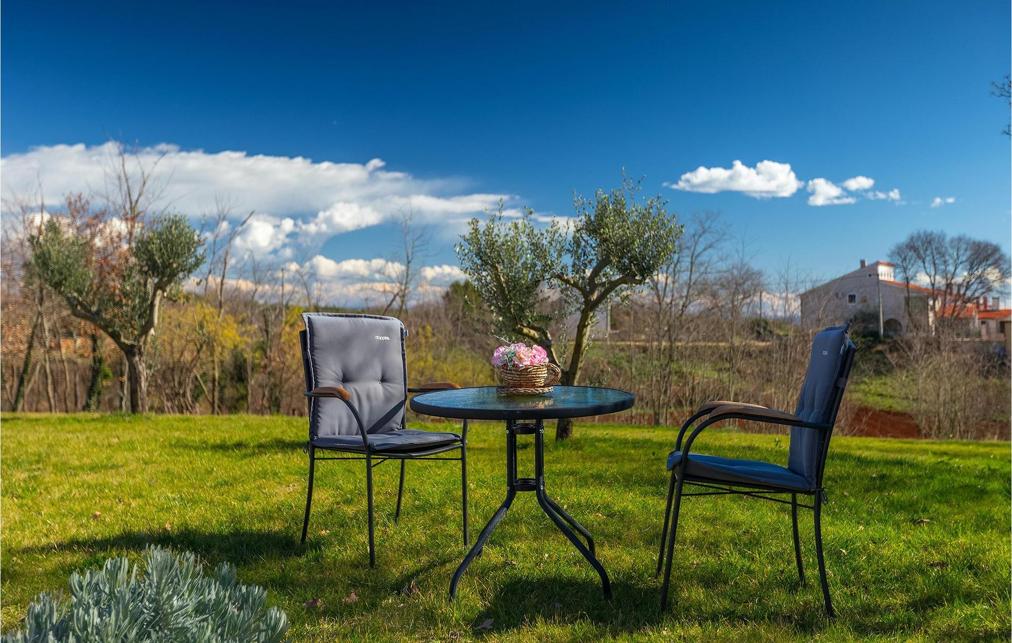 Fra terrassen kan du overskue poolen og haven, mens du tilbereder lækre måltider i det veludstyrede sommerkøkken med grill. Træ-spisebordet med bænke inviterer dig til en dejlig morgenmad, før du går på opdagelse i regionen. Der er et ekstra sæt havemøbler lige rundt om hjørnet, direkte foran stuen.