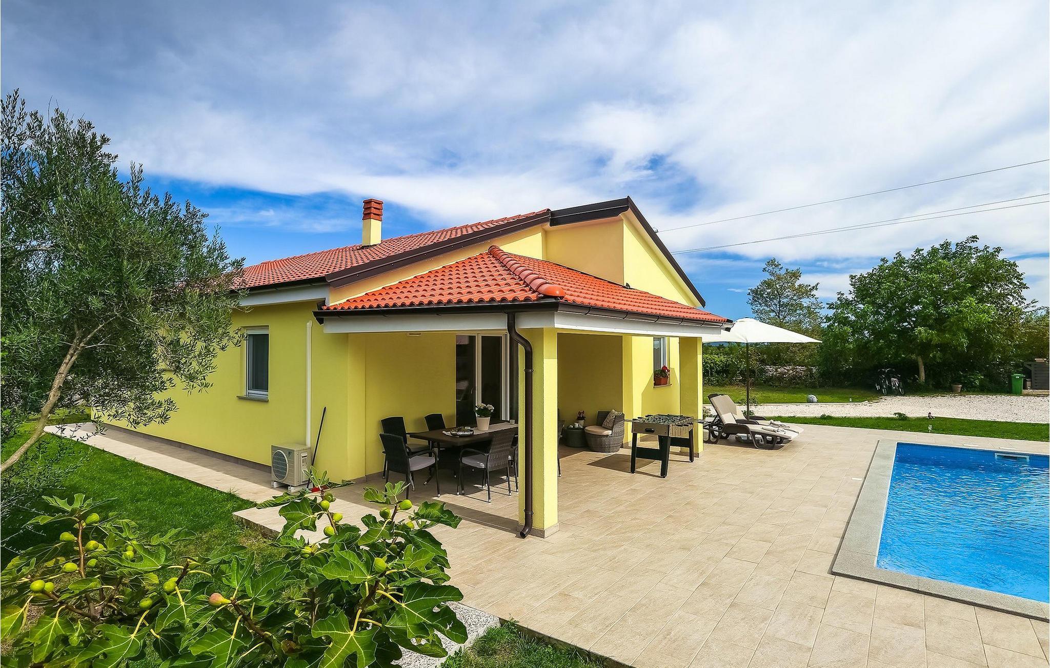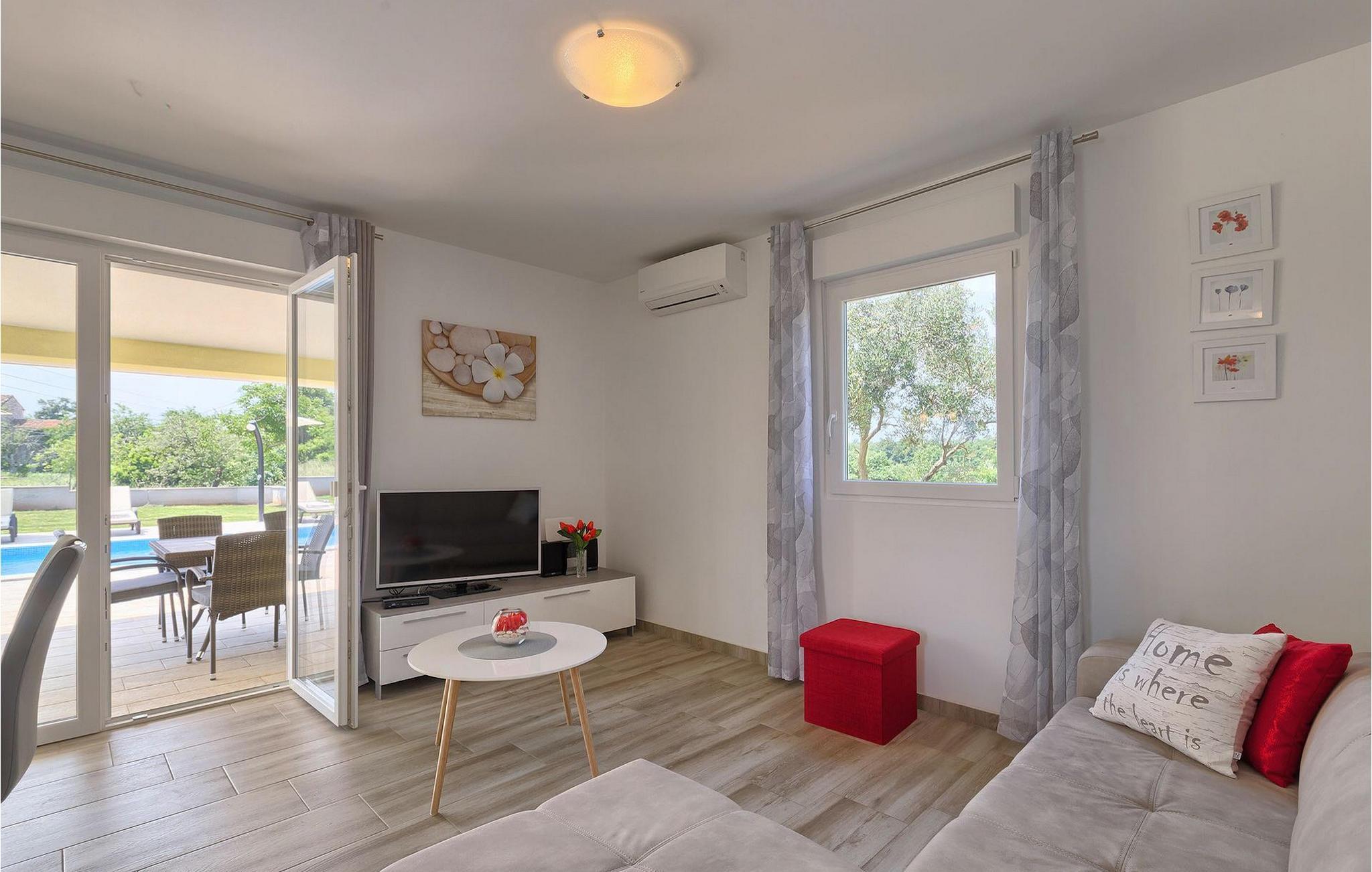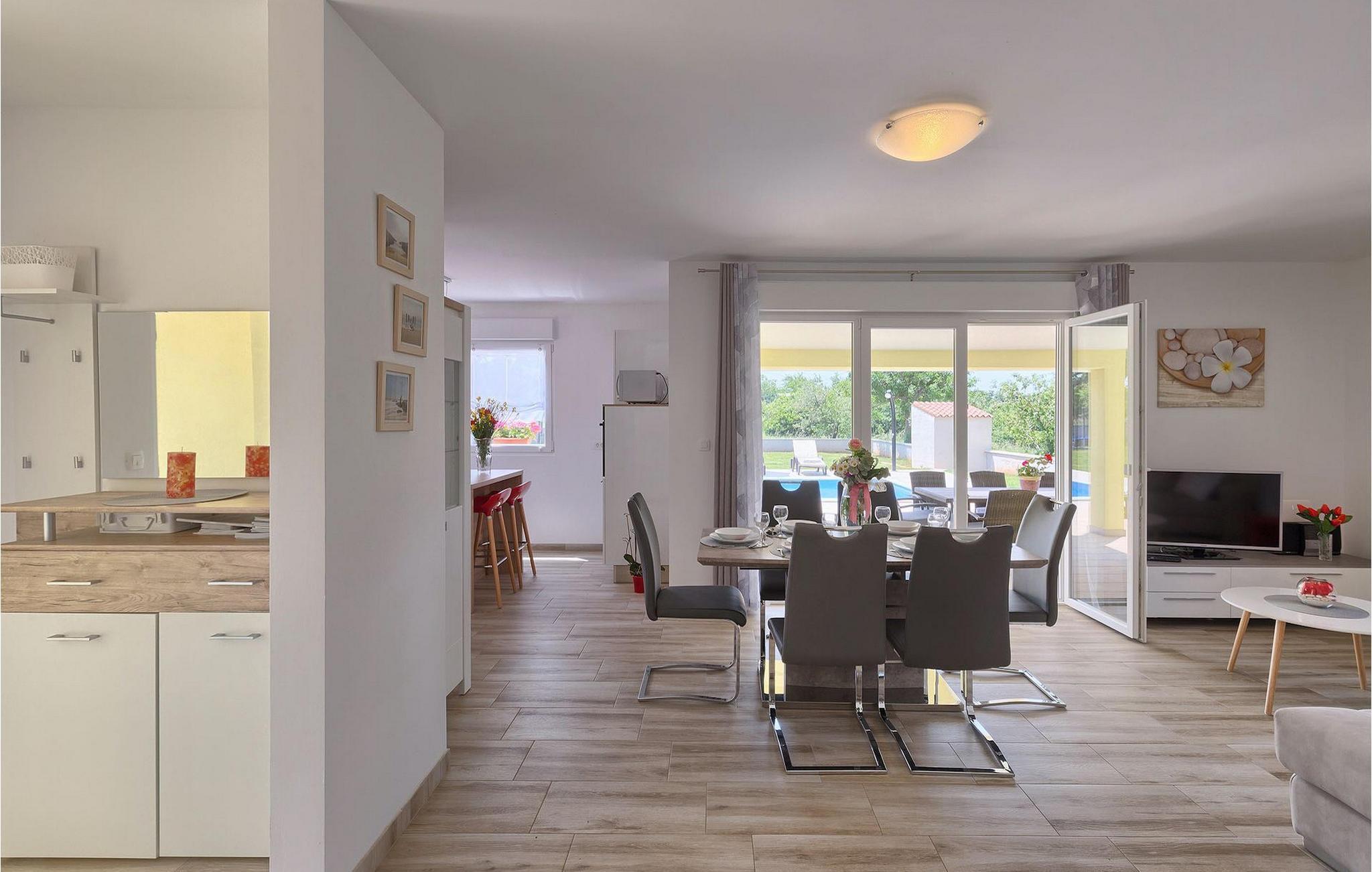 Villa Fiorina er en dejlig ferievilla, beliggende i en lille istrisk landsby Filipana og omgivet af grønne marker, som tilbyder en rigtig dejlig ferie for sine gæster. Et par kilometer adskiller denne villa fra den smukke istriske kyst, men hvis du foretrækker at bo i din villa, kan du finde en forfriskning i den private pool omgivet af liggestole. Villaen ligger på en ganske stor grund, hvor I kan spille volleyball eller lade børnene nyde trampolinen og gyngerne. Den overdækkede terrasse med spisebord er hvor du kan nyde frisklavede måltider fra grillen. Villaen er et hus i stueetagen; spise- og opholdsstuen er forbundet med det fuldt udstyrede køkken. Resten af huset er opdelt i 3 soveværelser, 2 badeværelser og et separat toilet. To soveværelser har en dobbeltseng, mens det resterende soveværelse består af to enkeltsenge. Denne dejlige, smagfuldt indrettede villa vil tilbyde dig en virkelig ubekymret ferie i Istrien. Dette smukke feriehus ligger i den lille landsby Filipana, på den sydlige side af halvøen Istrien. Placeringen af villaen tilbyder en perfekt balance mellem fred og privat nydelse væk fra en bysus og turistskarer matchet med kort afstand til alle større halvø-byer. Pula, den største by i Istrien, kun 18 kilometer væk fra Villaen er verdensberømt for sit fantastiske Colosseum, et gammelt amfiteater, der blev bygget i det 1. århundrede, mens den romerske kejser Vespansian regerede denne del af verden. Udover kulturelle og historiske skønheder byder Istrien på en unik gastrooplevelse, velkendt i denne del af Europa. Hjemmelavet istrisk prosciutto (pršut), vin, istrisk pasta (fuži) er blot nogle få af mange lækre gastro-fornøjelser, Istrien kan tilbyde for en ægte oplevelse af middelhavshjemmelavet køkken. Istrien-halvøen er også hjemsted for en af de smukkeste nationalparker i denne del af Europa - Brijuni. Det kan nås med båd med afgang fra Fažana, kun 16 kilometer væk fra villaen. En bil anbefales.