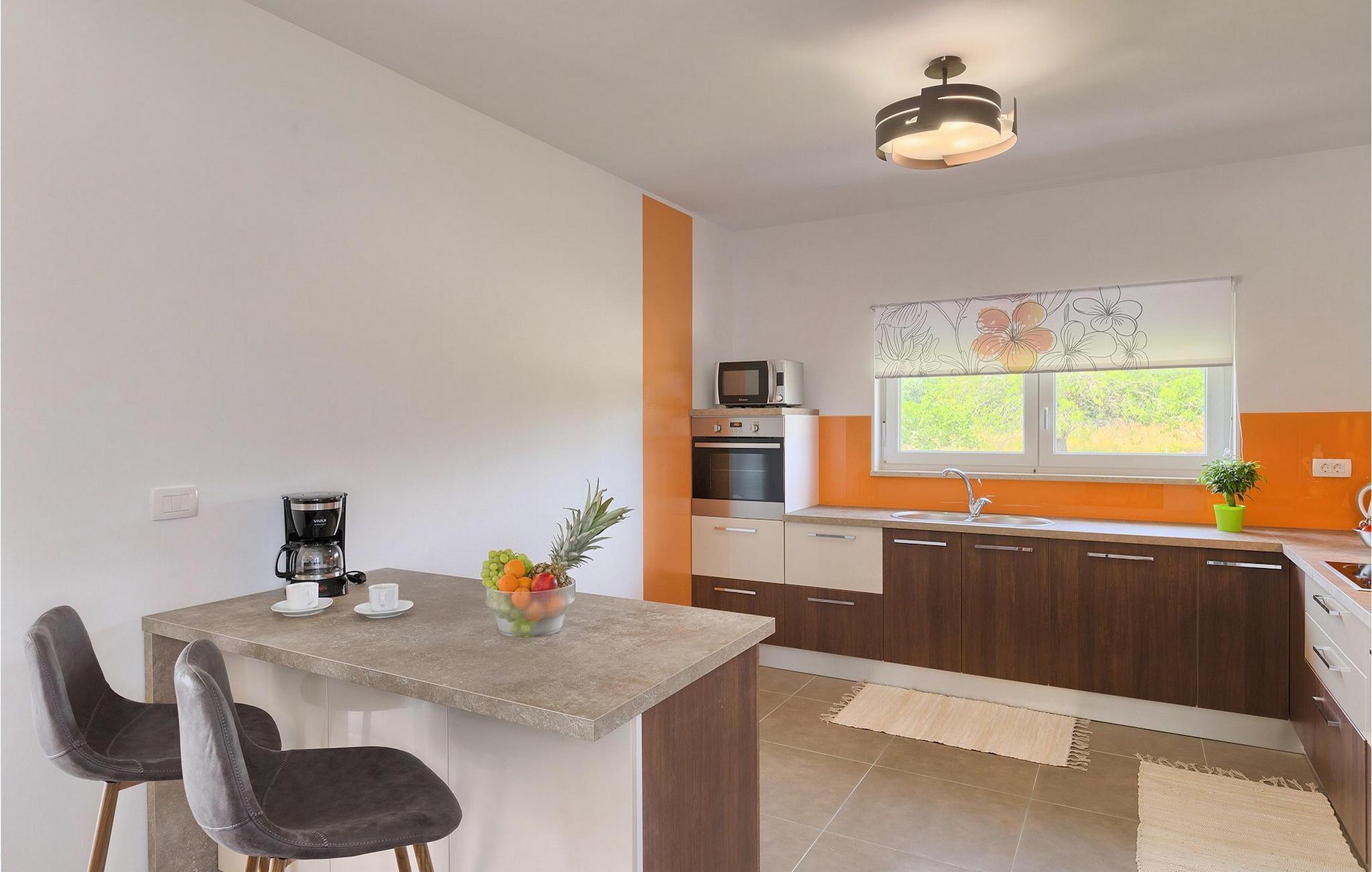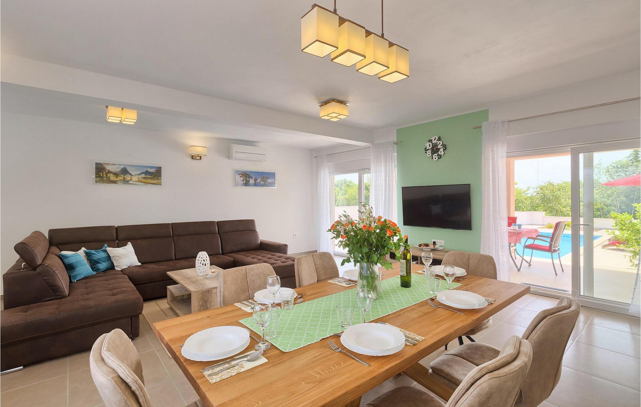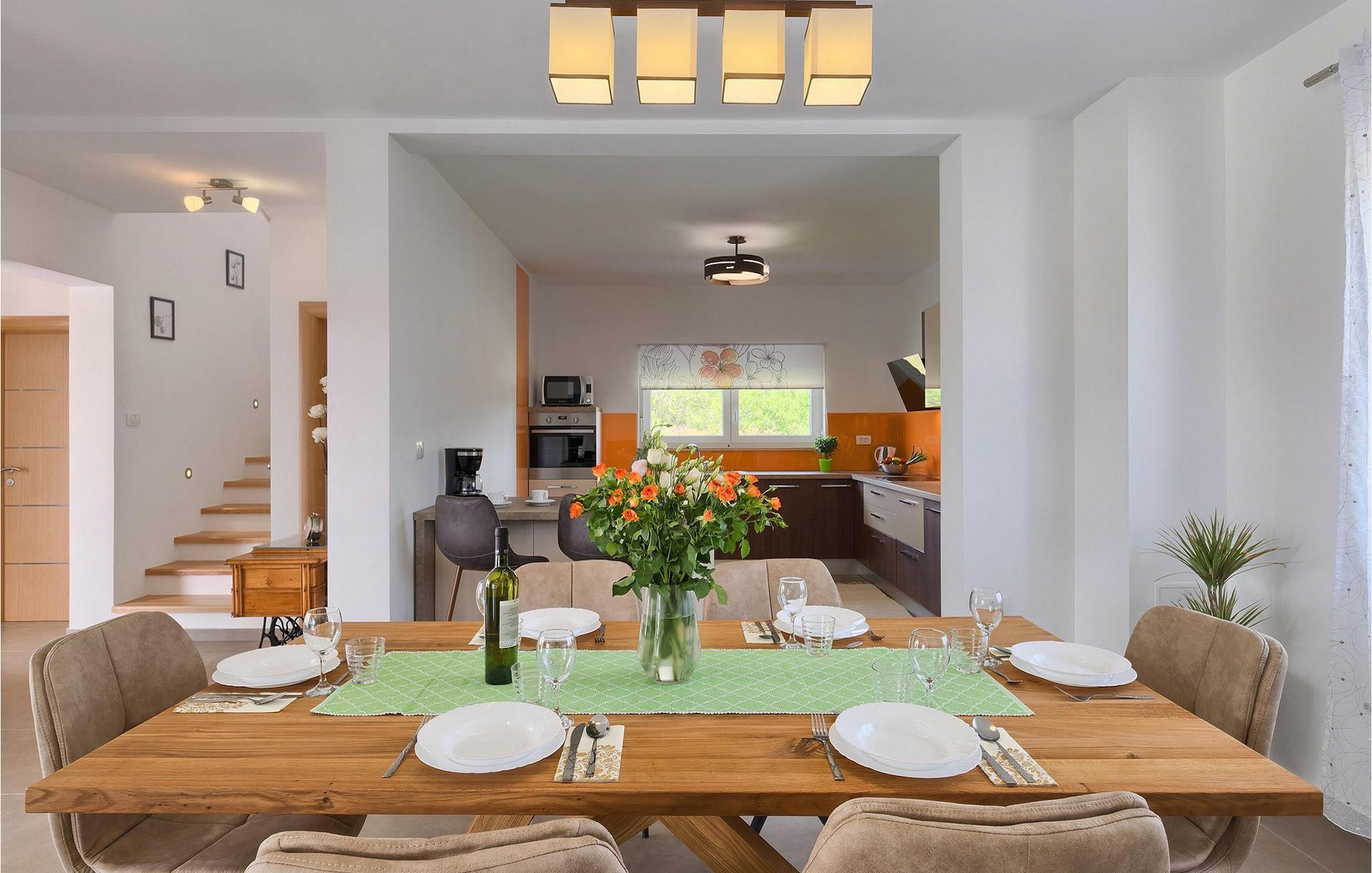 Villa Lena ist eine ideale Wahl für all diejenigen, die ihren Urlaub in einer natürlichen Umgebung ohne viele Nachbarn verbringen möchten, so dass sie sich richtig entspannen können. Die Villa bietet kann bis zu 6 + 2 Personen in 3 Schlafzimmern beherbergen. Das Interieur wurde mit sanften Naturfarben dekoriert, so dass Sie sich, sobald Sie die Villa betreten, wie zu Hause fühlen können. Das Erdgeschoss besteht aus einem offenen Wohnbereich mit komfortabler Eckgarnitur und TV, einem Essbereich und einer völlig ausgestatteten Küche mit Frühstücksbar. Ein Doppelzimmer und ein Badezimmer befinden sich ebenfalls auf dieser Etage. Die anderen beiden Schlafzimmer mit eigenem Bad sowie eine überdachte Terrasse befinden sich auf der ersten Etage. Die Terrasse bietet einen schönen Ort, von dem aus Sie die Aussicht auf die Umgebung genießen können.