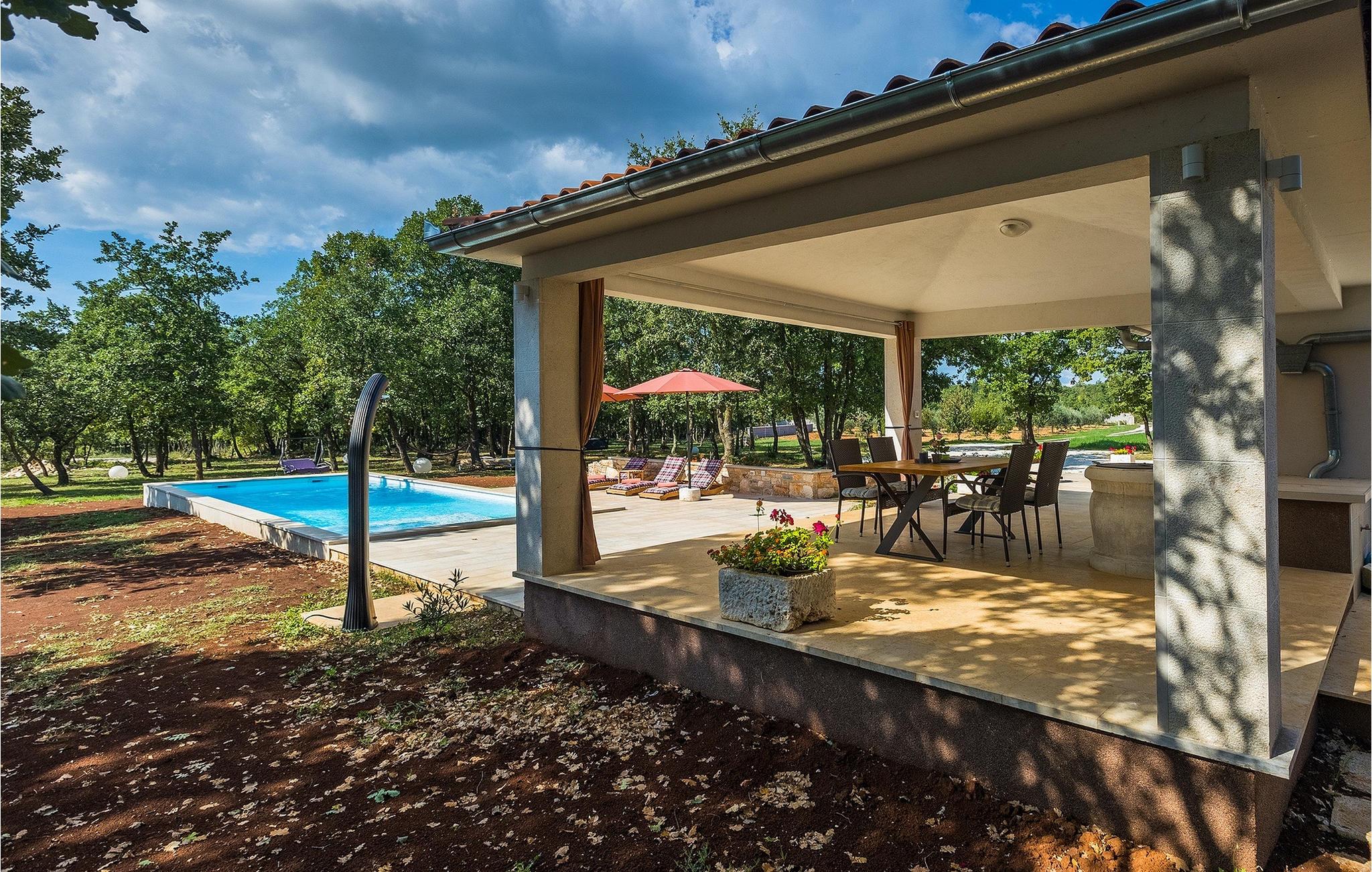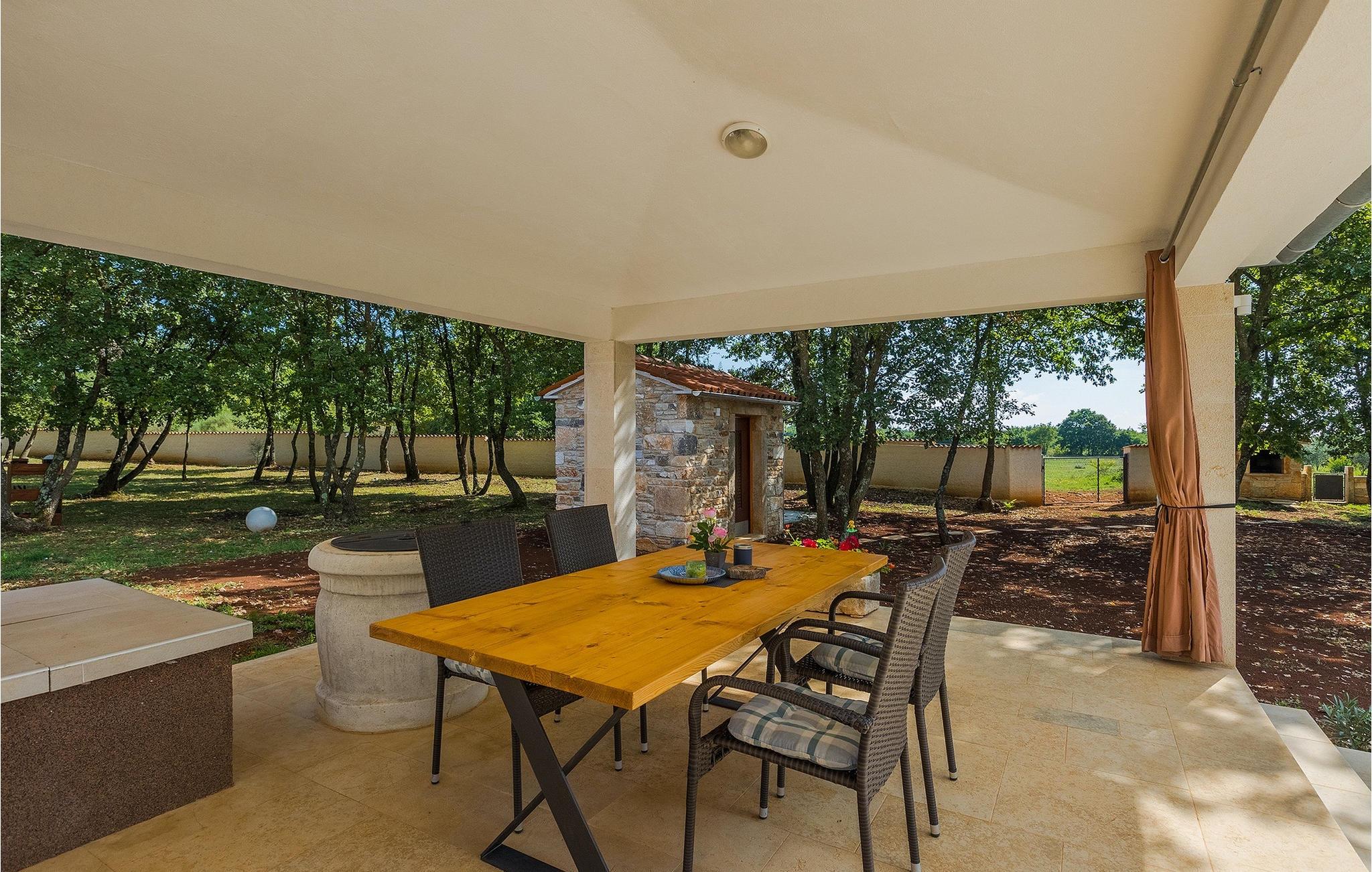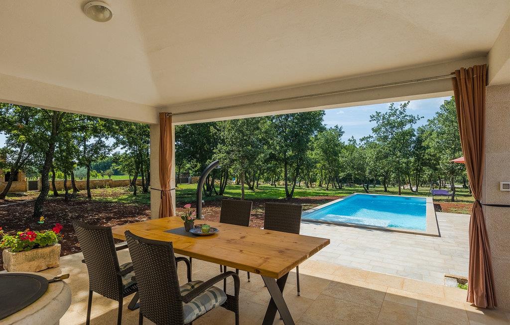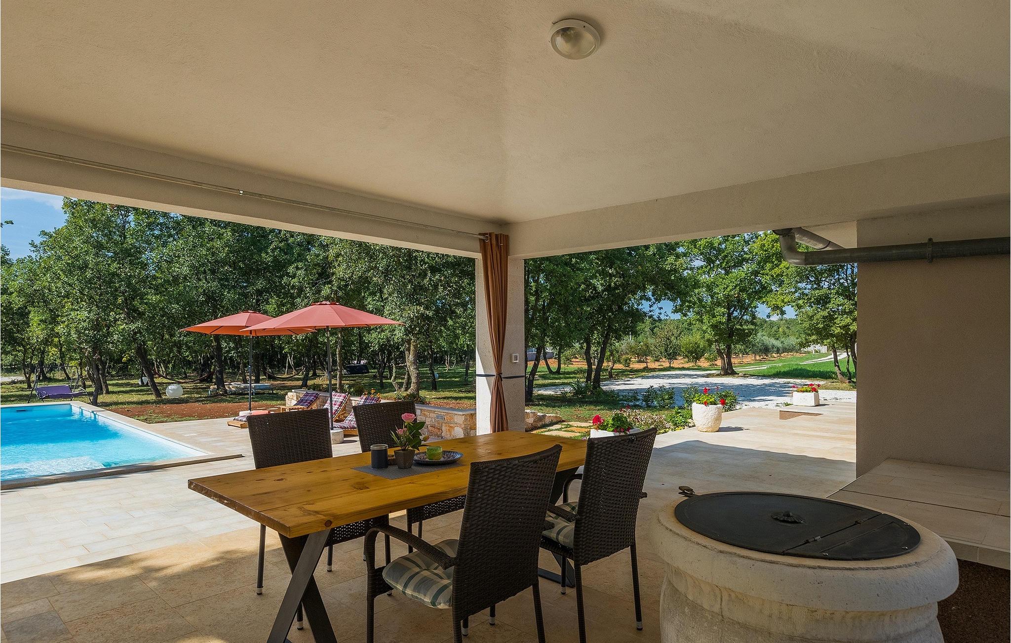 Den smukke store gårdhave er omgivet af træer og masser af grønt og tilbyder fuldstændig privatliv. I haven kan du finde mange aktiviteter såsom basketball, fodbold eller en legeplads, hvor du kan tilbringe tid med de mindste. For dem, der ønsker at udforske det omkringliggende område på cykel, er der 2 cykler til rådighed. Foran villaen er en privat pool, det perfekte sted for en forfriskende svømmetur på varme sommerdage. Kun få skridt fra den store og indbydende pool er en overdækket terrasse med en kulgrill, som er den ideelle udendørs spiseplads til at tilberede måltider og nyde tiden med din familie. Fra terrassen har du direkte adgang til den åbne plane stueetage bestående af et fuldt udstyret køkken, en spiseplads og en komfortabel stue med pejs. Villaen har et charmerende dekoreret soveværelse med dobbeltseng og eget badeværelse. Book Villa Marinetinka og tilbring en afslappende ferie med dine kære!Den smukke Villa Martinetinka ligger ikke langt fra den største istriske by Pula, i den lille landsby Marcana. Villaen tilbyder dig fuldstændig privatliv, omgivet af træer og grønne områder. Dagligvarebutikker, restauranter og caféer ligger tæt på villaen, kun en kort køretur væk. Hvis du ønsker at udforske omgivelserne, er der 2 cykler til rådighed på villaen. Istrien er særligt populær blandt cyklister, da det byder på adskillige cykelstier, som ligger lige foran villaen. De fører gennem adskillige vinmarker og olivenlunde, langs det blå Adriaterhav eller gennem mange historiske byer. Vi anbefaler at besøge byen Pula, som er berømt for sine rester fra den romerske periode, såsom amfiteatret. Ikke langt fra Pula ligger en anden perle ved Adriaterhavet, byen Rovinj. Rovinj var en lille fiskerby, som med tiden er blevet et populært rejsemål for mange turister. Byen er præget af sine farverige huse og smalle brostensbelagte gader, der skaber en uimodståelig charme. Udover de kulturelle seværdigheder, bør du bestemt prøve de traditionelle istriske retter, olivenolie og istrisk malvasia.