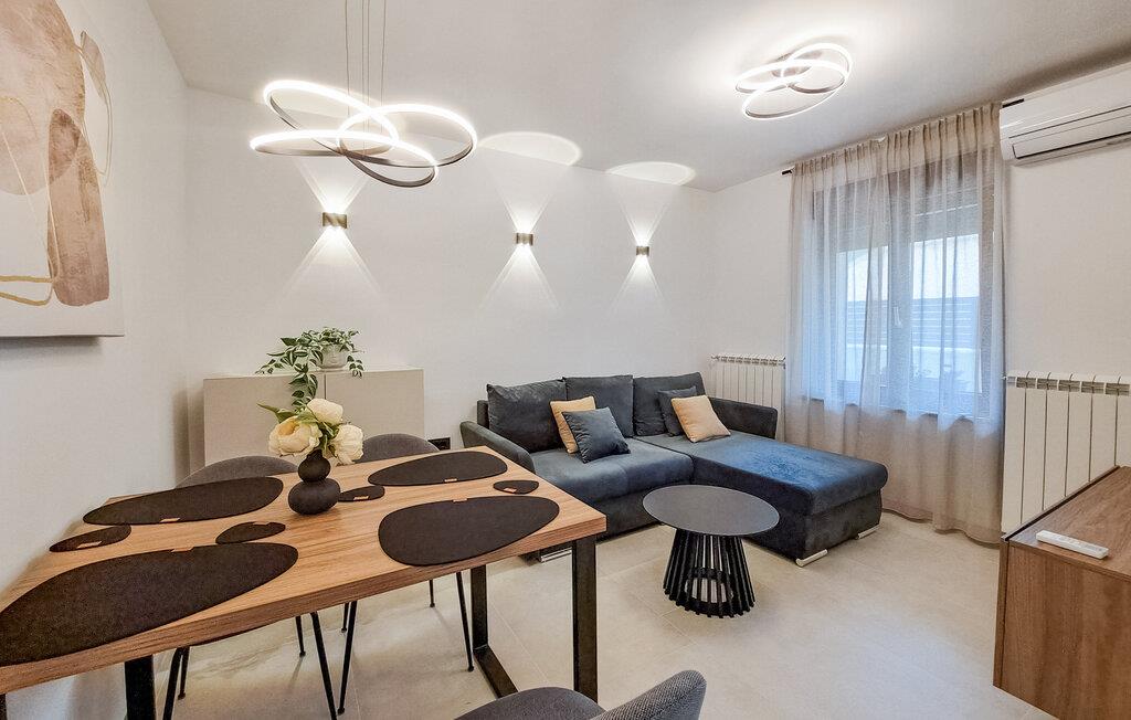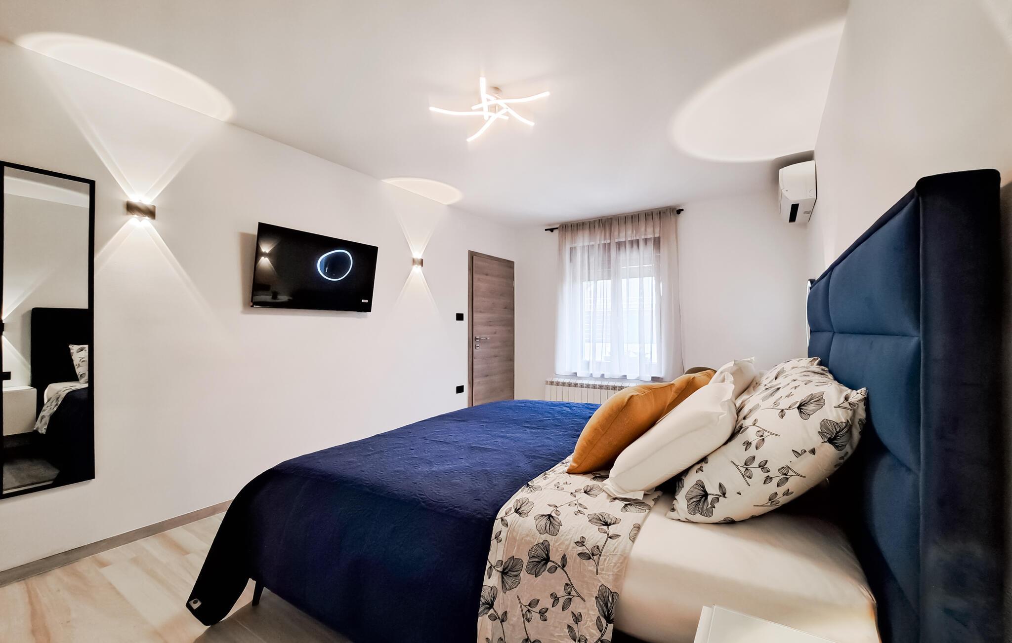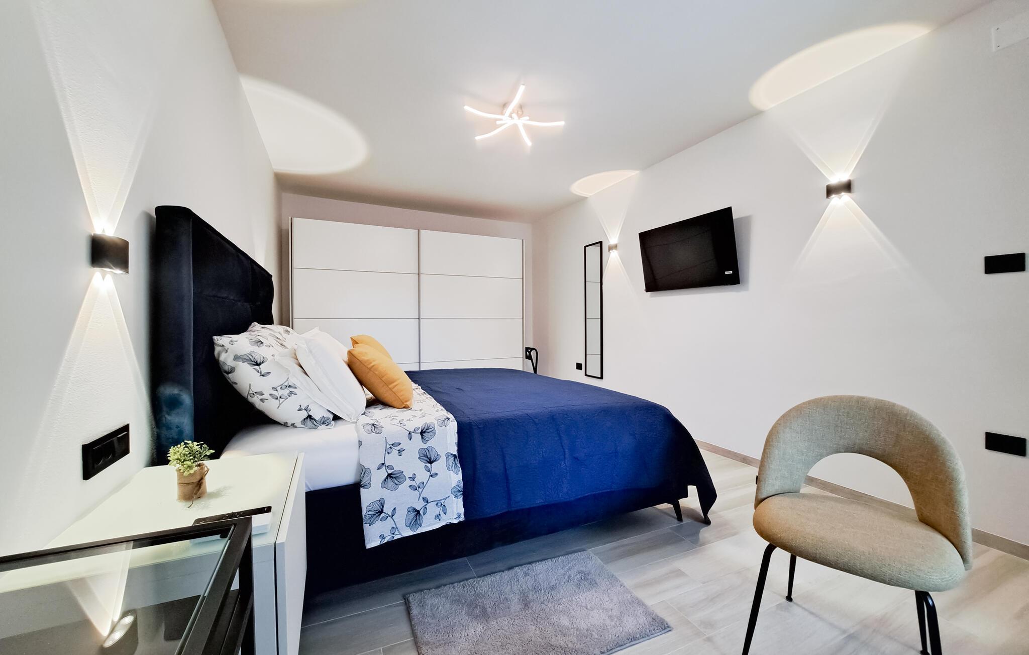 I denne moderne, stilfulde ferielejlighed i Muntic kan I forvente høj kvalitet og indretningsløsninger, der gør det nemt at slappe af. Interiøret er elegant, med rene linjer og nøje udvalgte detaljer, der skaber en harmonisk atmosfære.