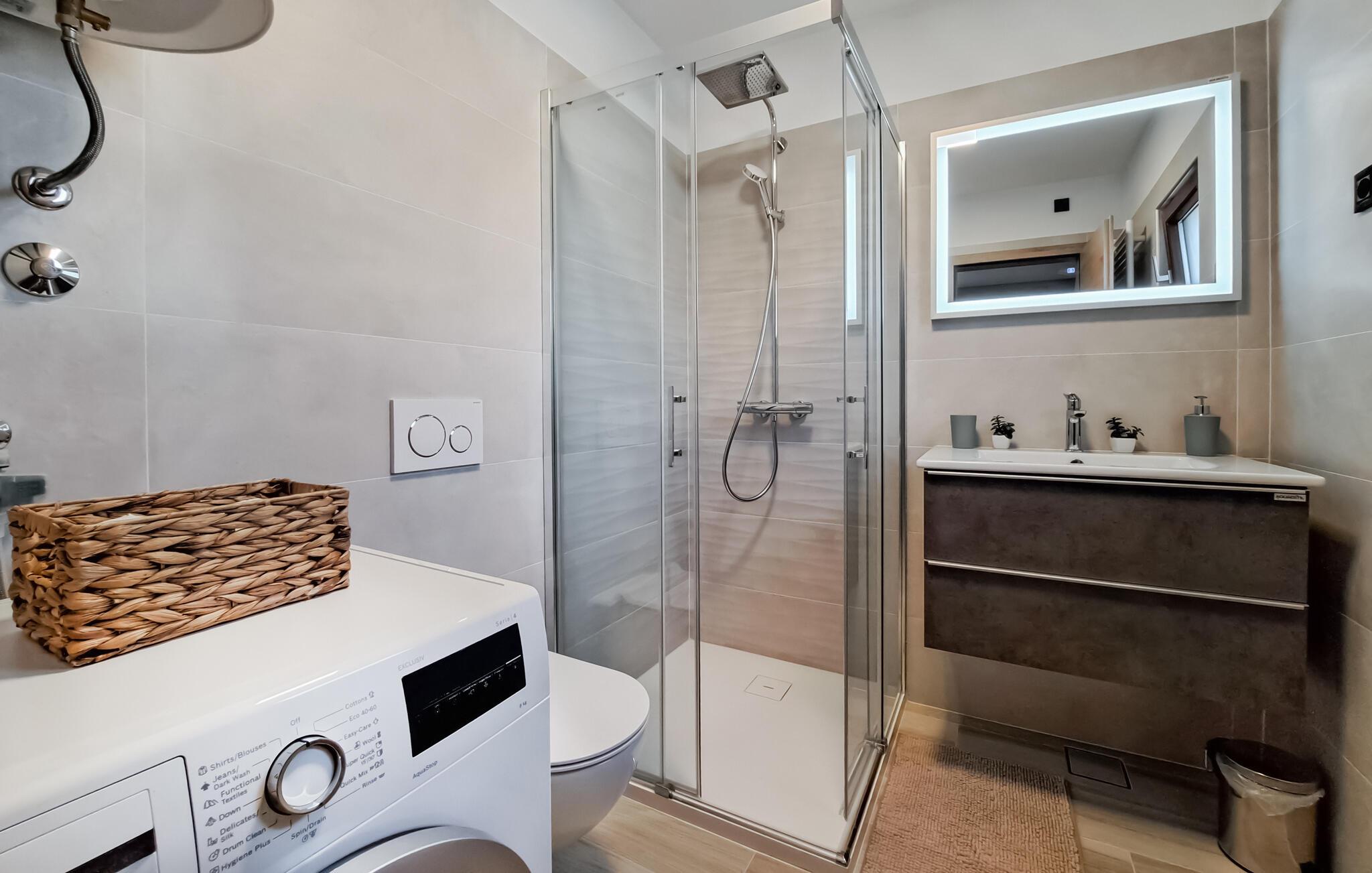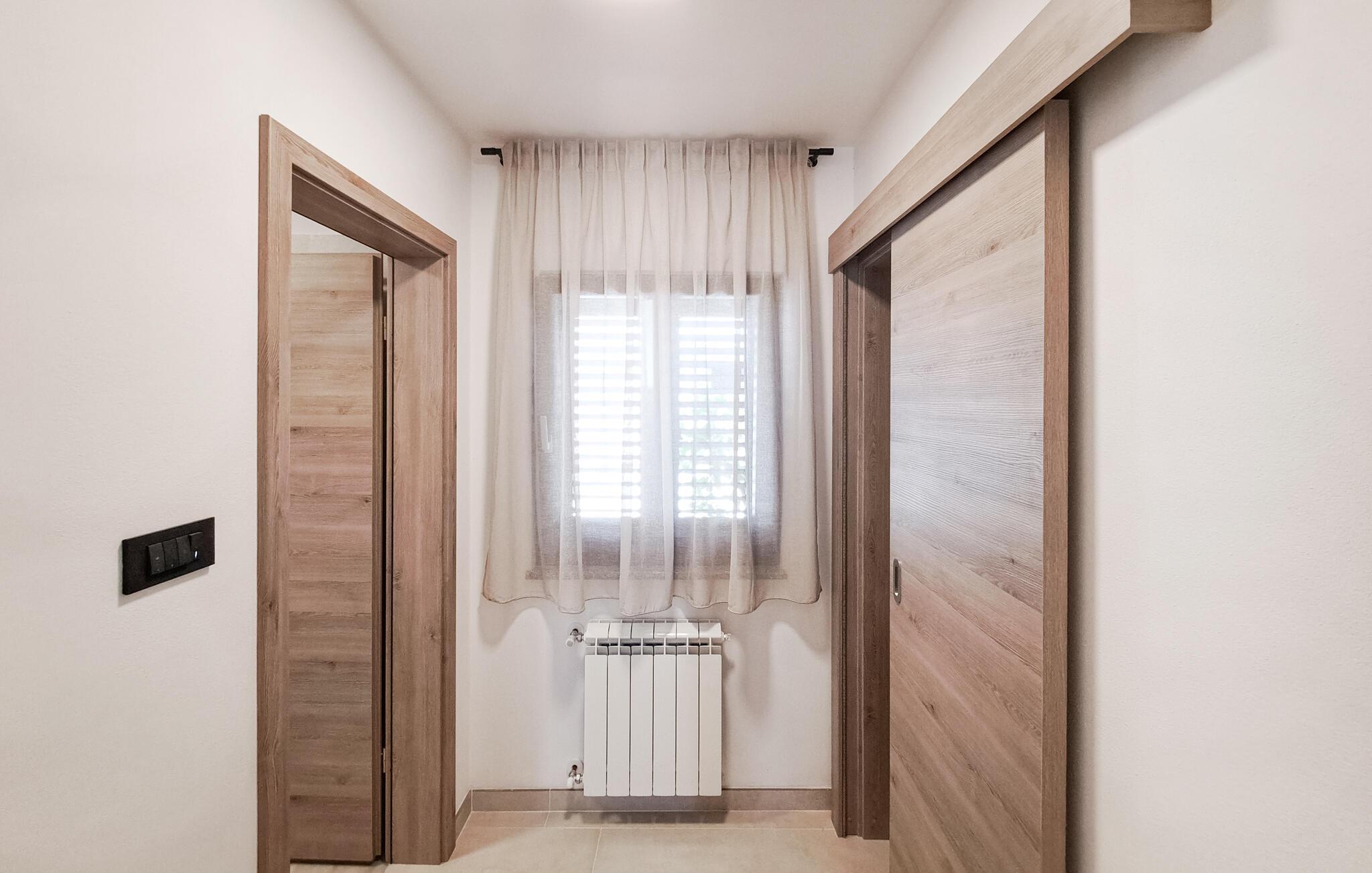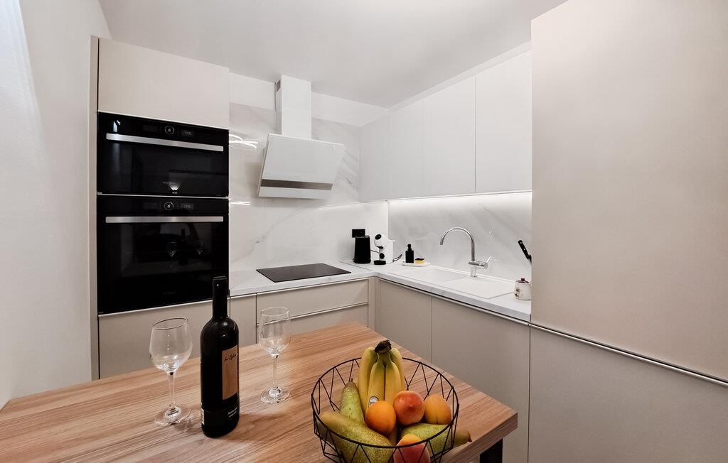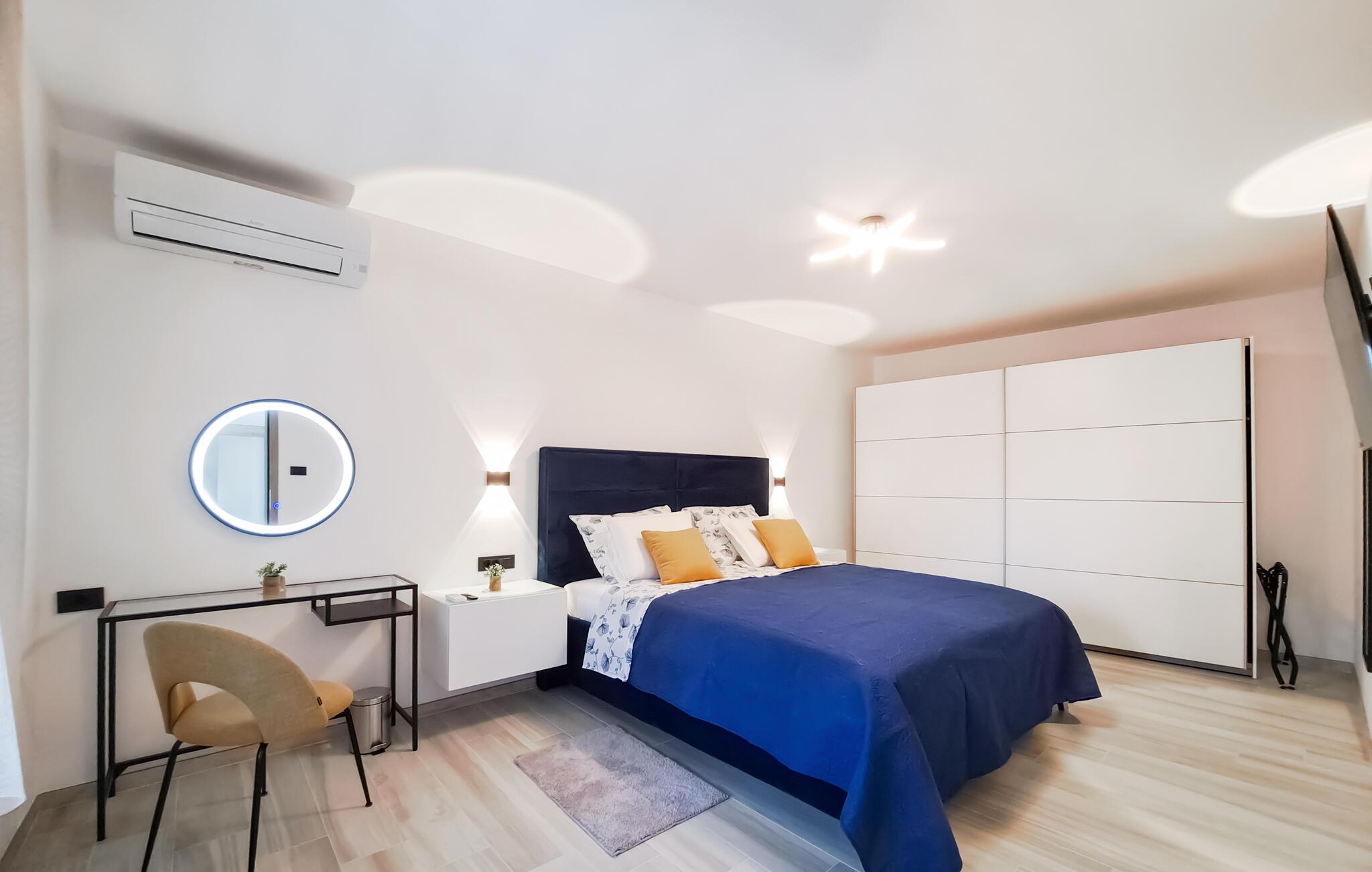I denne moderne, stilfulde ferielejlighed i Muntic kan I forvente høj kvalitet og indretningsløsninger, der gør det nemt at slappe af. Interiøret er elegant, med rene linjer og nøje udvalgte detaljer, der skaber en harmonisk atmosfære.