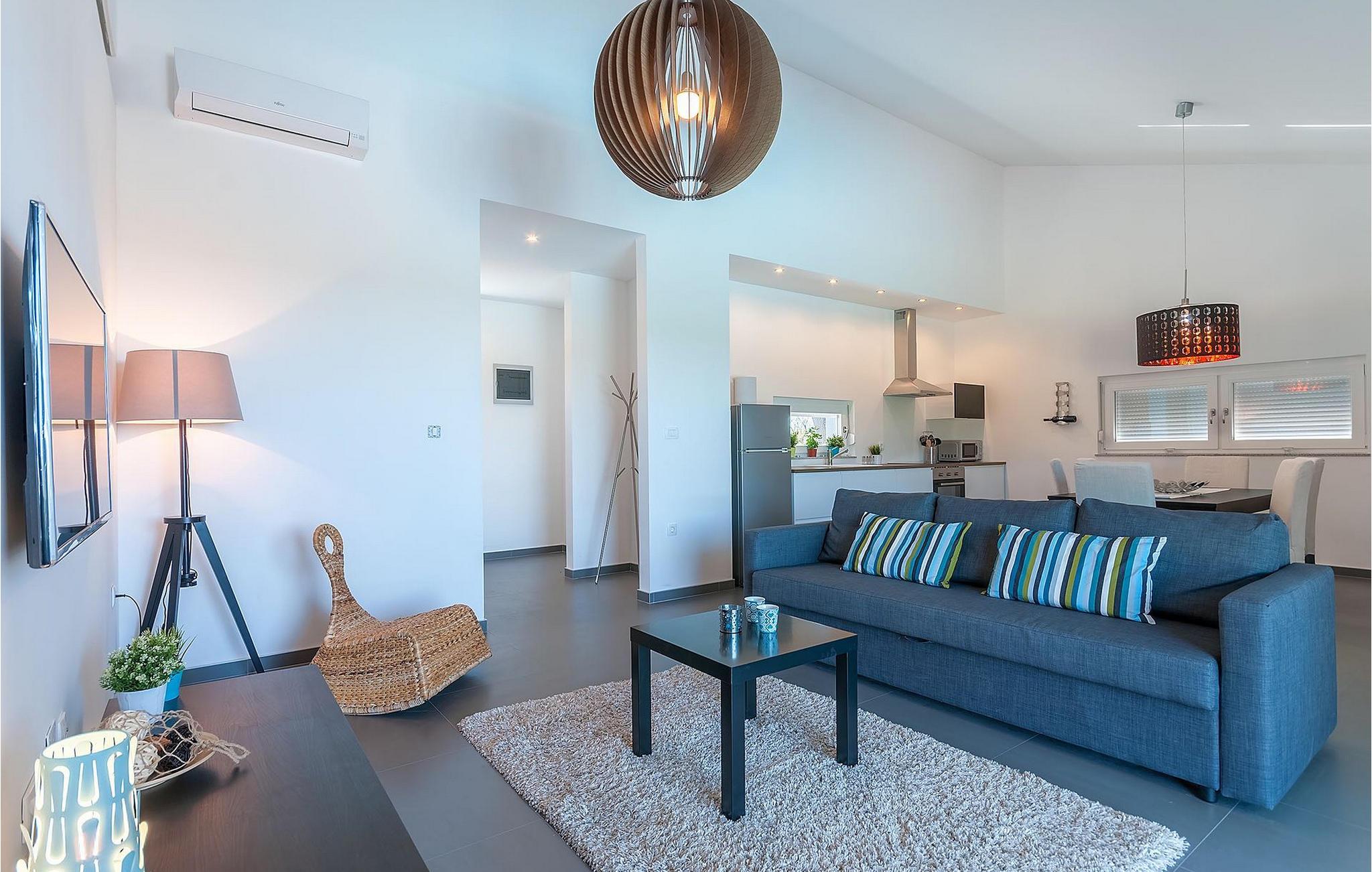 Det moderne og elegante interiørdesign af denne villa vil helt sikkert få dig til at blive forelsket i den. Du kan føle dig godt tilpas på sofaen i den vidunderlige opholdsstue med TV og udsigt over poolen. Det er direkte forbundet med et fuldt udstyret køkken med spiseplads, hvor du kan vise dine madlavningsevner og tilberede velsmagende måltider til din familie. Villaen har to soveværelser med hver en dobbeltseng og et ensuite badeværelse med bruser. Et af soveværelserne har et lille galleri, der kan nås via smalle trapper, hvor man kan læne sig tilbage i en lænestol og læse en god bog.