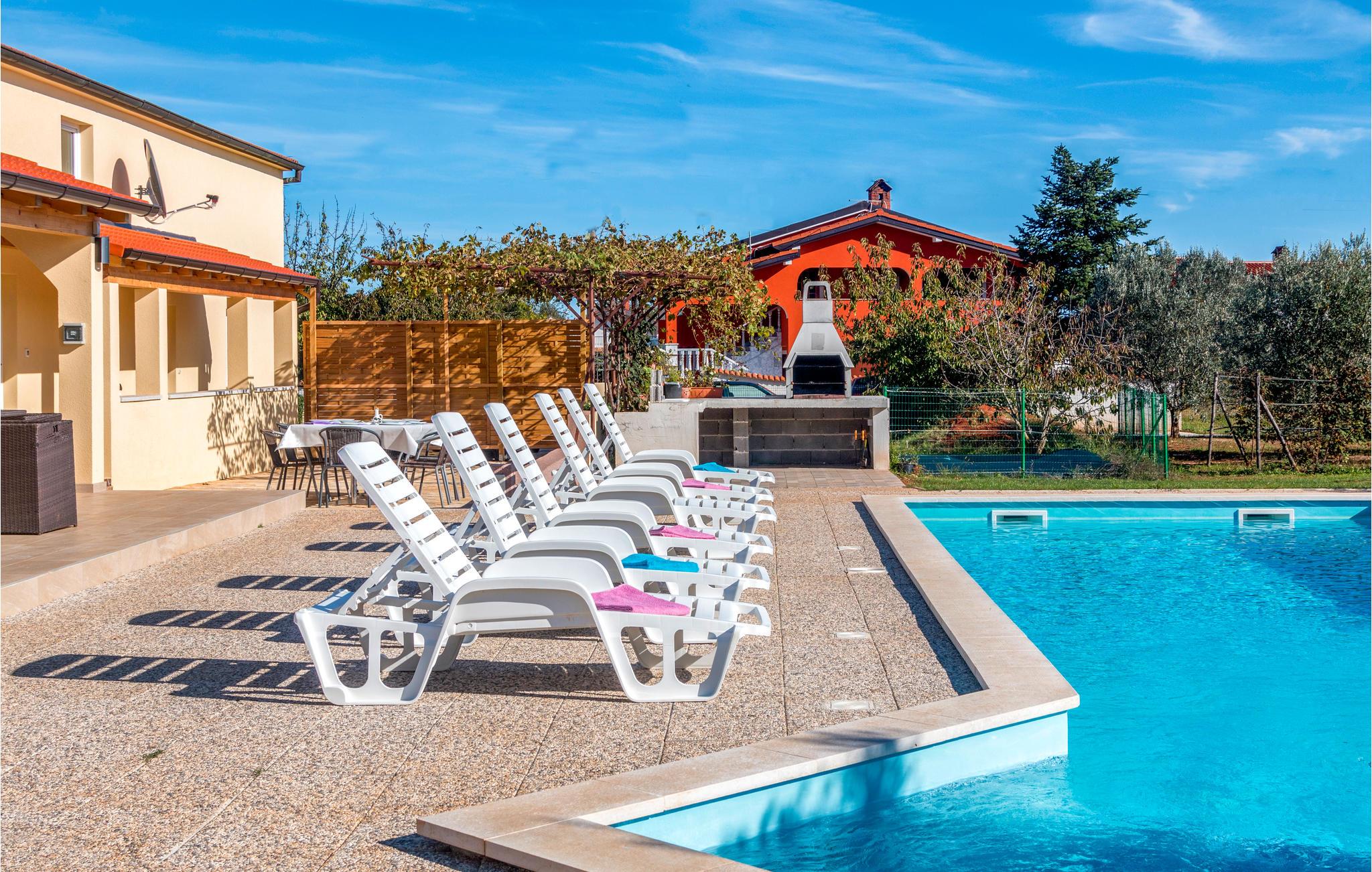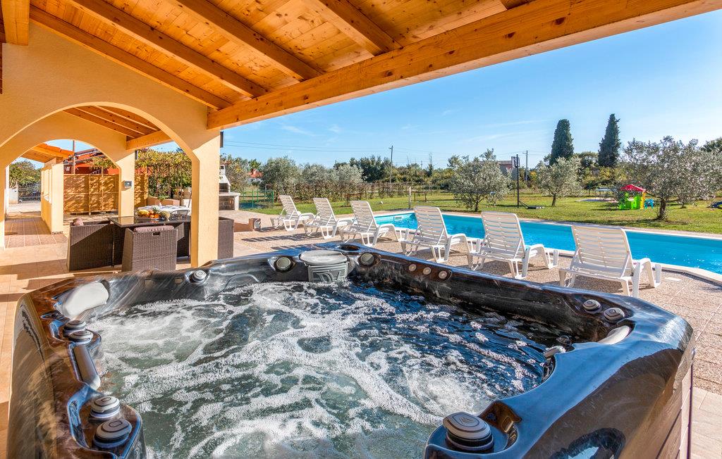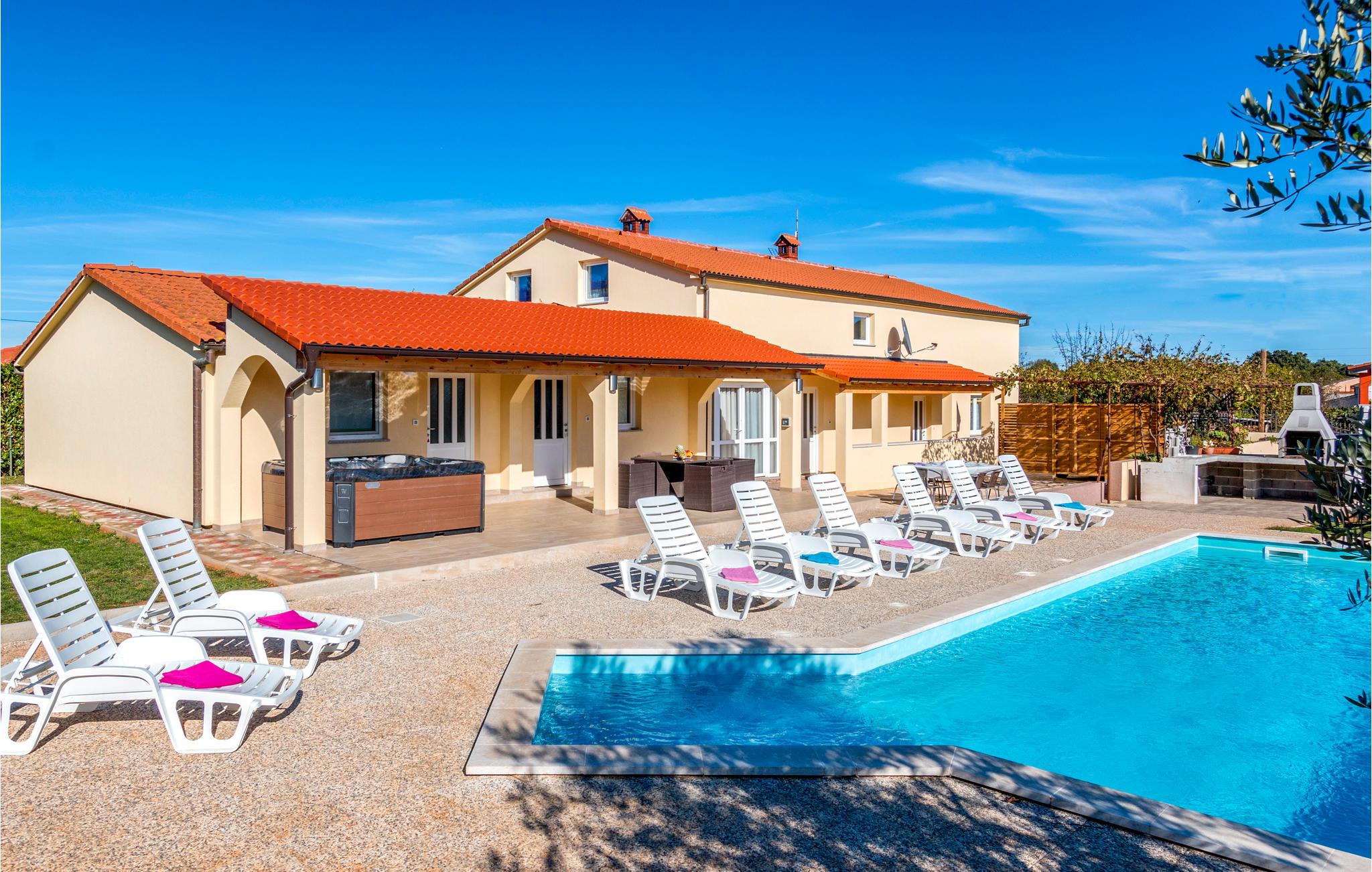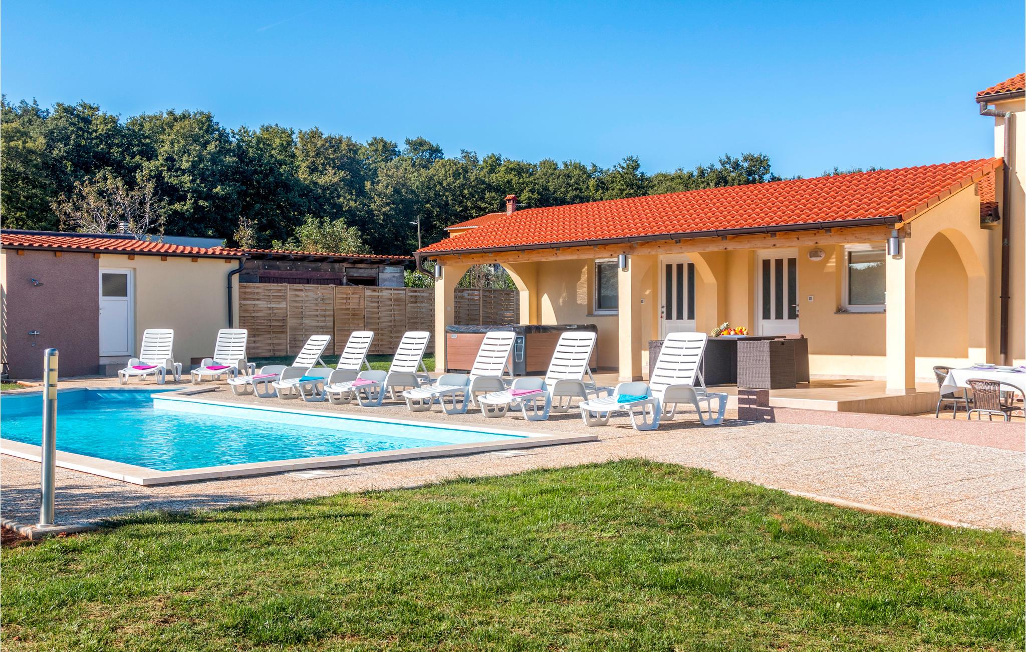 I den lille landsby Radeki Glavica, i nærheden af Pula ligger dette indbydende feriehus med stor Pool, whirlpool i det fri, Sauna og talrige aktivitetsmuligheder. På grund af størrelsen og det enestående udstyr er dette komfortable hus perfekt til store familier eller hvis vennegrupper rejser sammen. Grunden hvor der er pool, plæne, sportsredskaber, grill og terrasse er indhegnet, så børnene kan lege uforstyret. Selvom beliggenheden er dejlig rolig kan adrenalinhungrende feriegæster tage til de nærtliggende Quad Club, rideskolen eller I kan bade ved strandene Duga Uvala, Medulin, Premantura eller Pula med de mange historiske levn fra områdets romerske fortid.