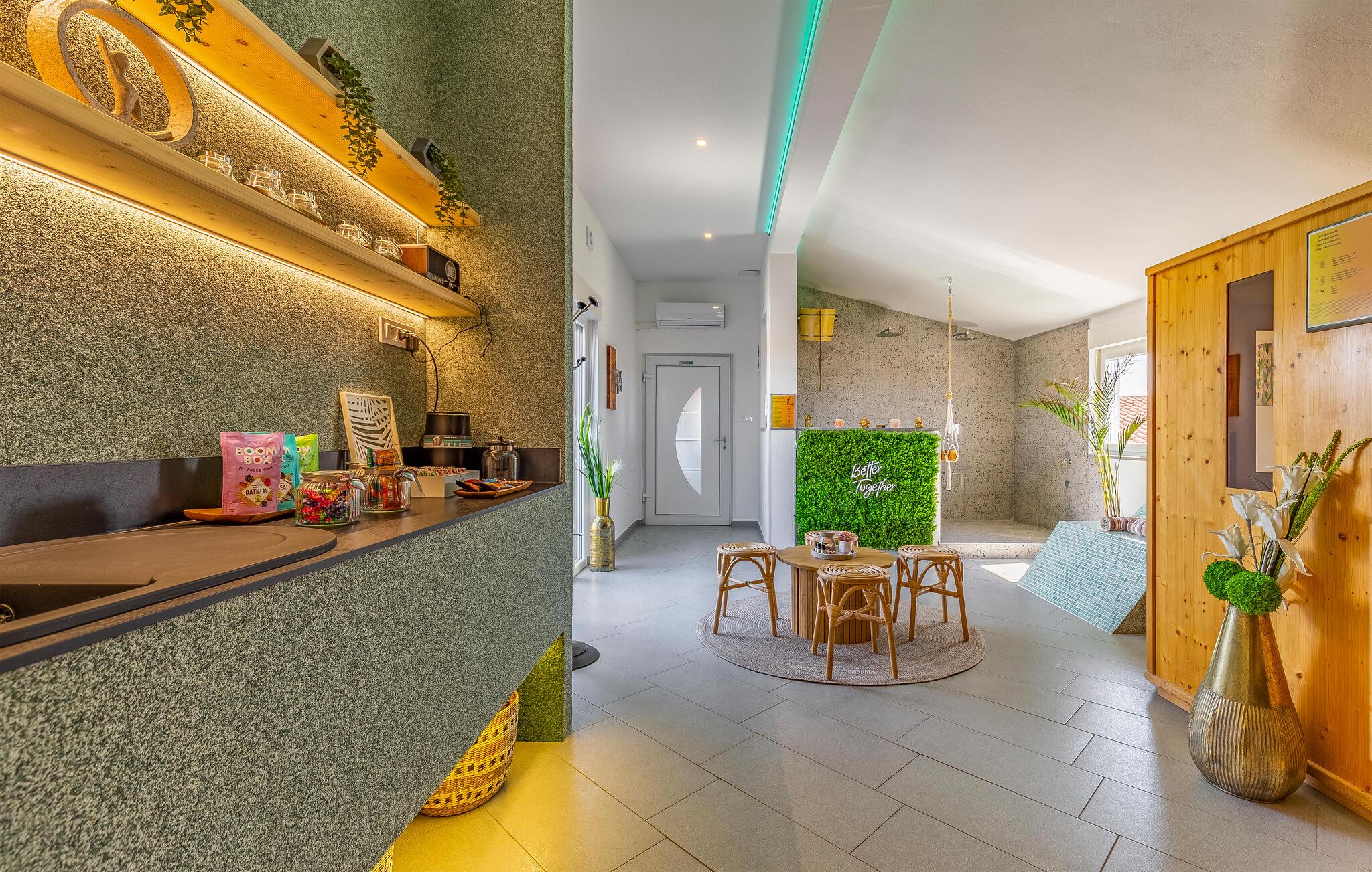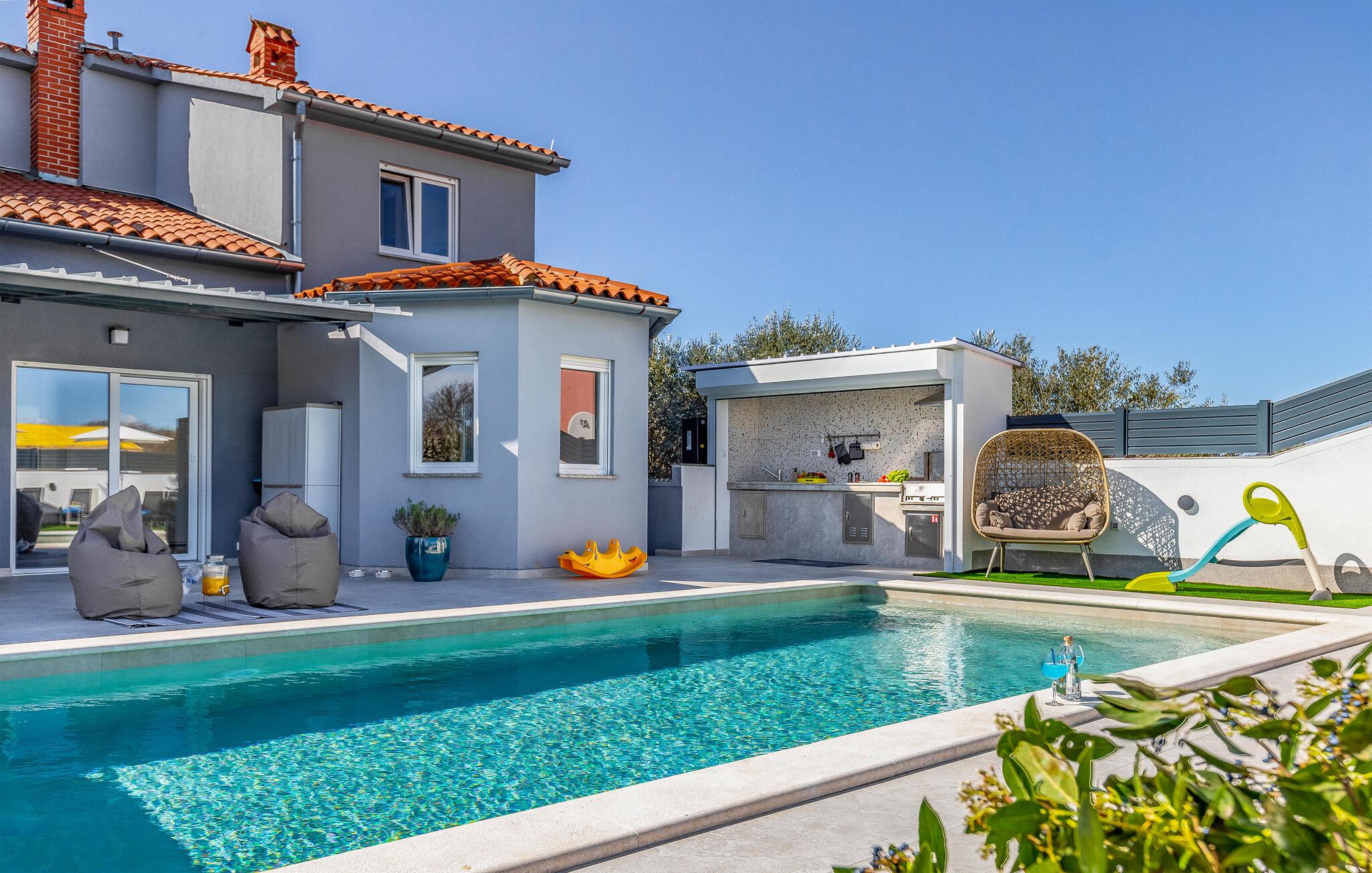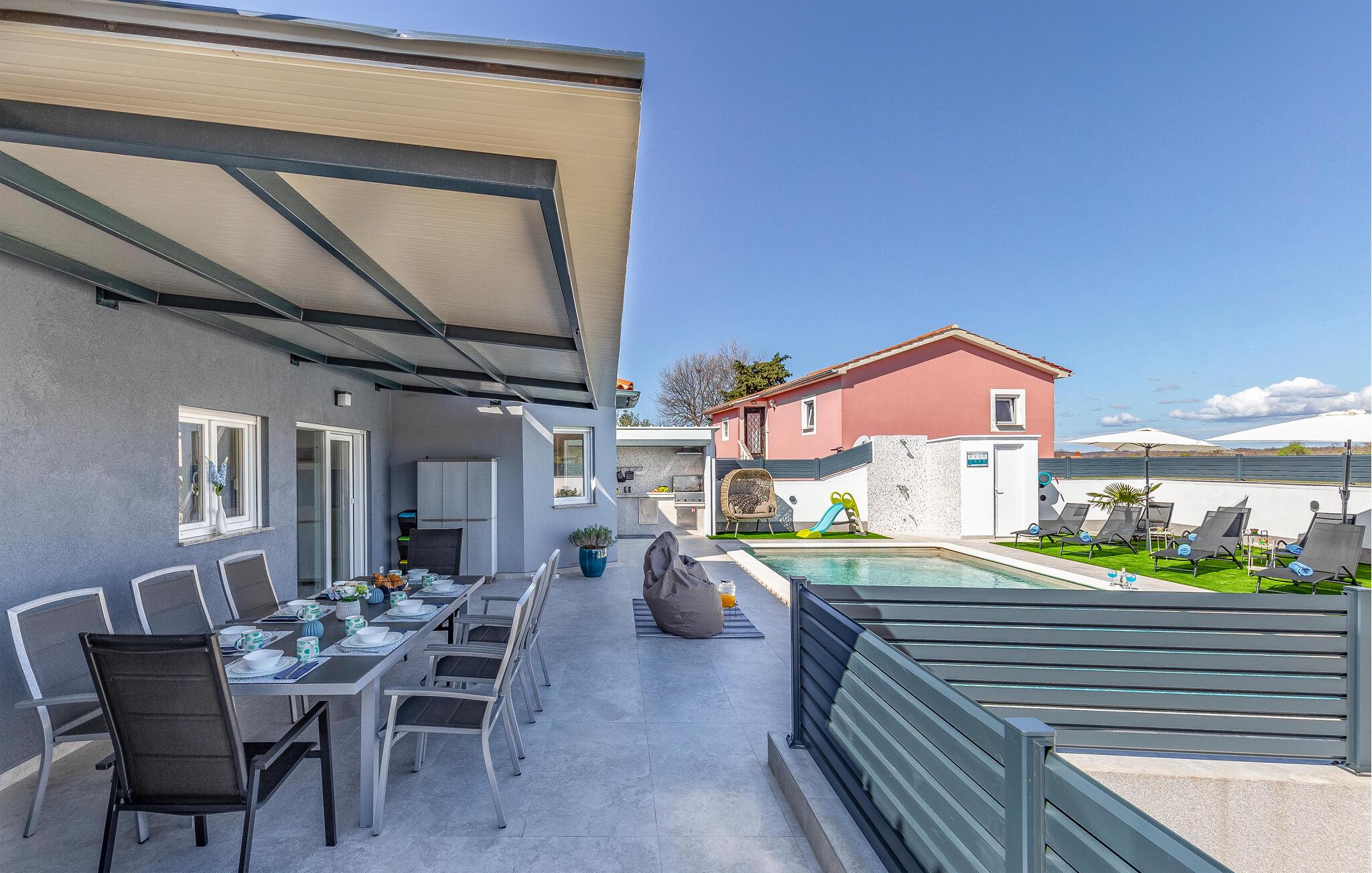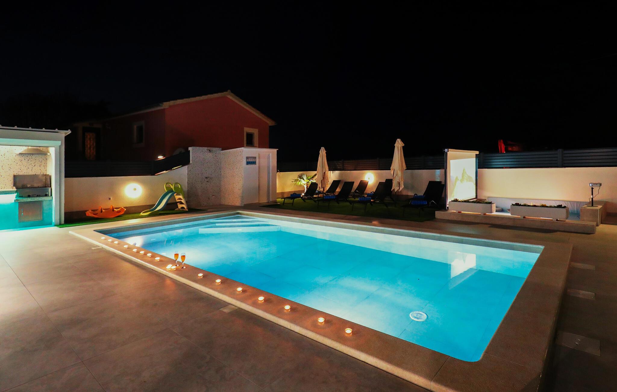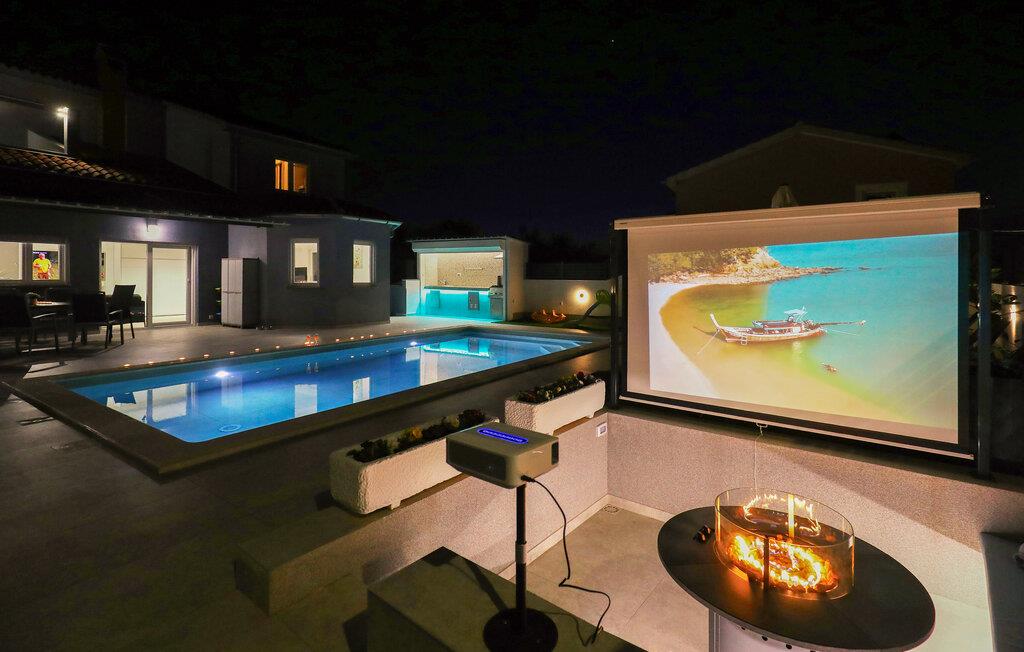 Det luksuriøse udendørsområde lader heller intet tilbage at ønske. snup en frisk dukkert i poolen, nyd de varme sommernætter ved grillen eller glæd jer til den udendørs biograf. Nyd nogle romantiske stunder i spabadet og hyggelige måltider i det fri, mens yngre gæster nyder de mange legemuligheder.