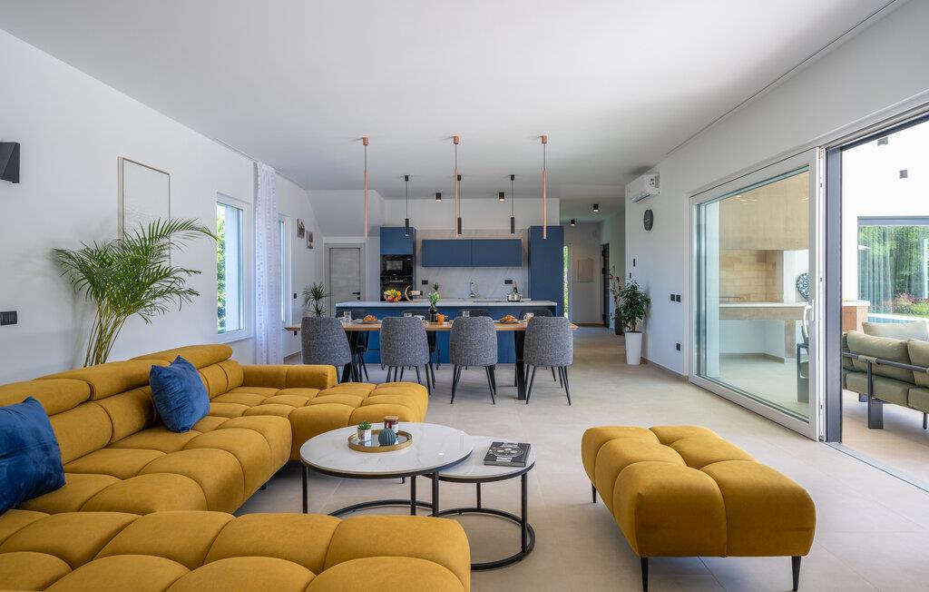 Denne moderne og luksuriøse ferievilla giver jer en rummelig opholdsstue med en stor, komfortabel sofa og et fuldt udstyret køkken til at tilberede dagens måltider sammen. Nyd morgenmaden sammen i fred og ro, enten ved det elegante spisebord eller brug det stilfulde udendørsområde til hyggelige måltider under åben himmel.