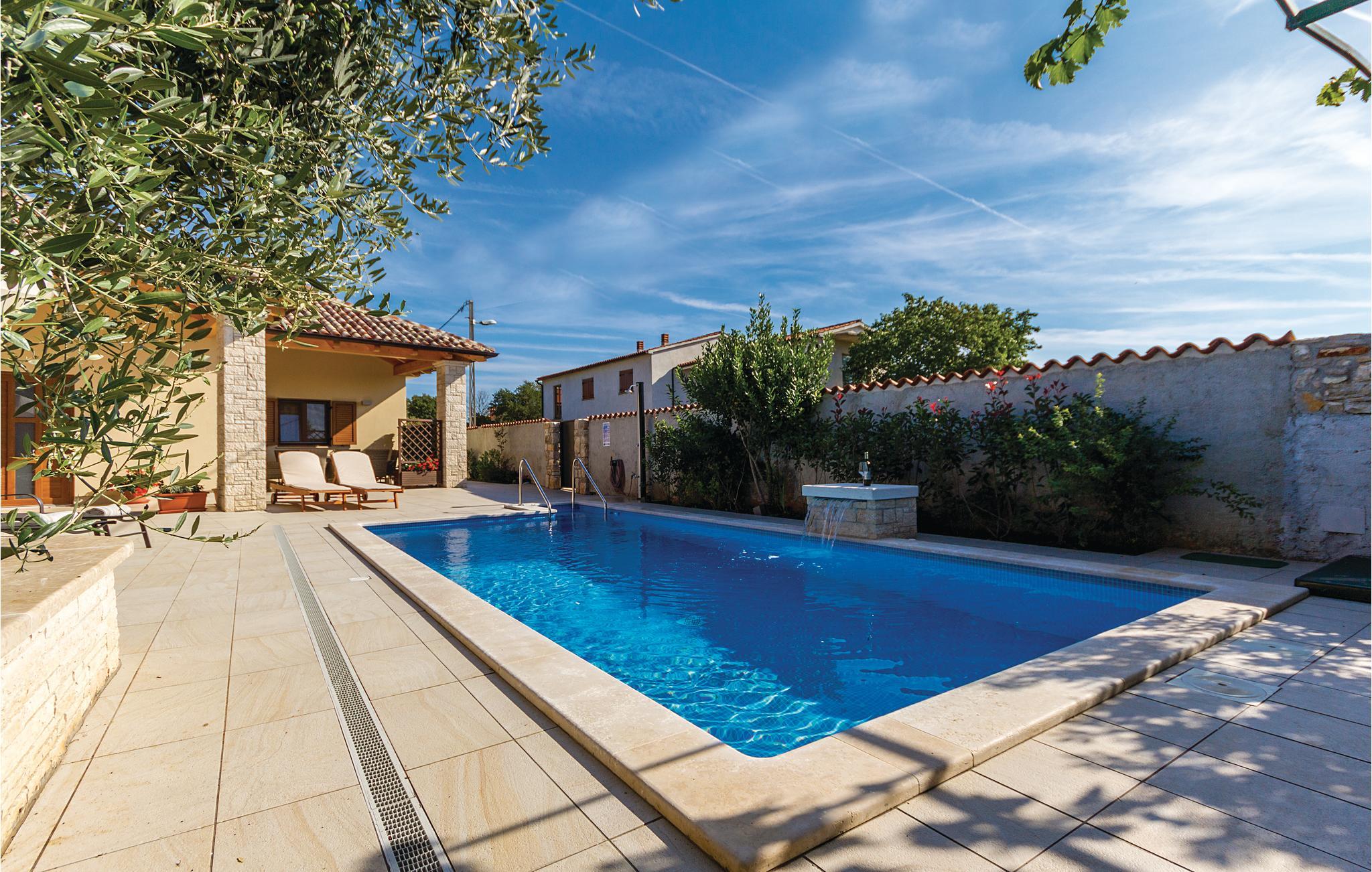 Omgivet af en velplejet grund venter dette vidunderlige feriehus med pool. Det består af en stue med køkken, to soveværelser, to badeværelser og en åben hems med dobbeltseng. Der er to klimaanlæg i stueetagen, et mere på hemsen. I kan nyde jeres morgenkaffe på den overdækkede terrasse foran huset, og på varme sommerdage kan I forfriske jer i udendørspoolen. I den indhegnede have med grill har I yderligere en overdækket terrasse med grill til rådighed. Byens centrum med supermarked og en fremragende restaurant ligger i nærheden.
