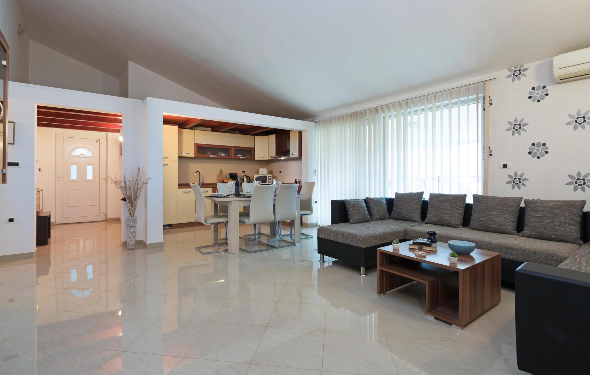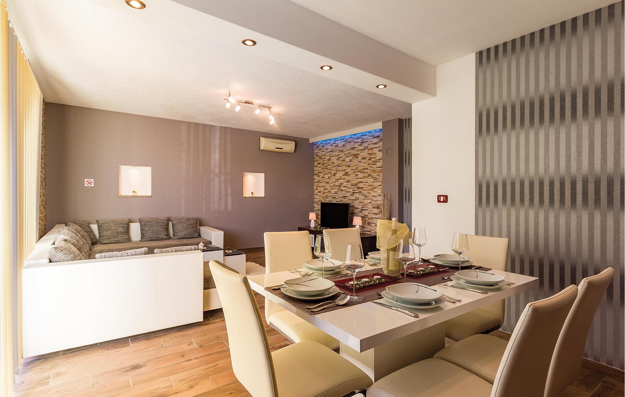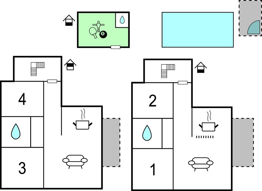 Ferieboligen består af to boligenheder, der strækker sig over to etager, som er forbundet med hinanden via udvendige trapper. På hver etage er der en opholdsstue, køkken og spiseplads med aircondition, så ejendommen er behagelig at være i selv på de varmeste dage. Ejendommen og parkeringspladserne er indhegnet. Medbring også dit kæledyr, så du virkelig kan nyde ferien sammen med hele familien.