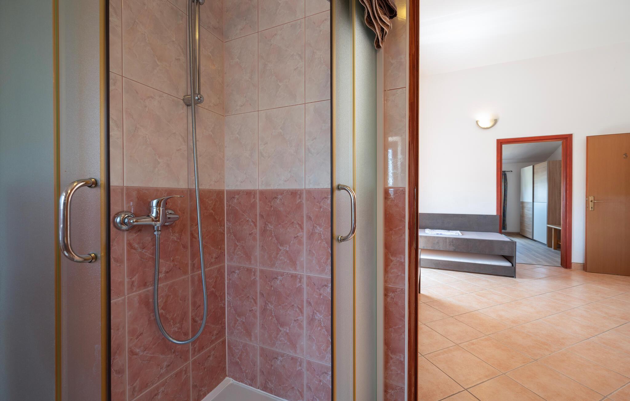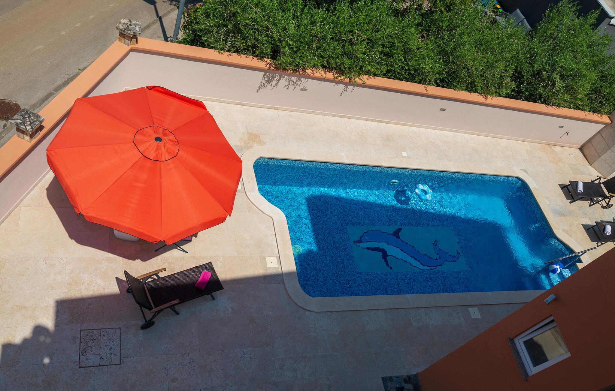 Denne lejlighed giver jer en komfortabel base, som er funktionelt og smagfuldt indrettet. Her har I alt, hvad I skal bruge til nogle fantastiske dage i Kroatien. I har også adgang til en overdækket altan, hvor I kan spise morgenmad og sidde i solen, mens I nyder udsigten til havet og Brijuni-øerne. Der er en ekstra terrasse, som er åben og deles med gæsterne i lejlighed CIP631, -32, -33 og 34. Her finder I også en udendørspool, en grill samt gynger og en vippe til børnene.