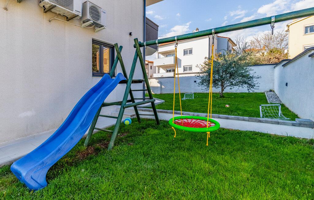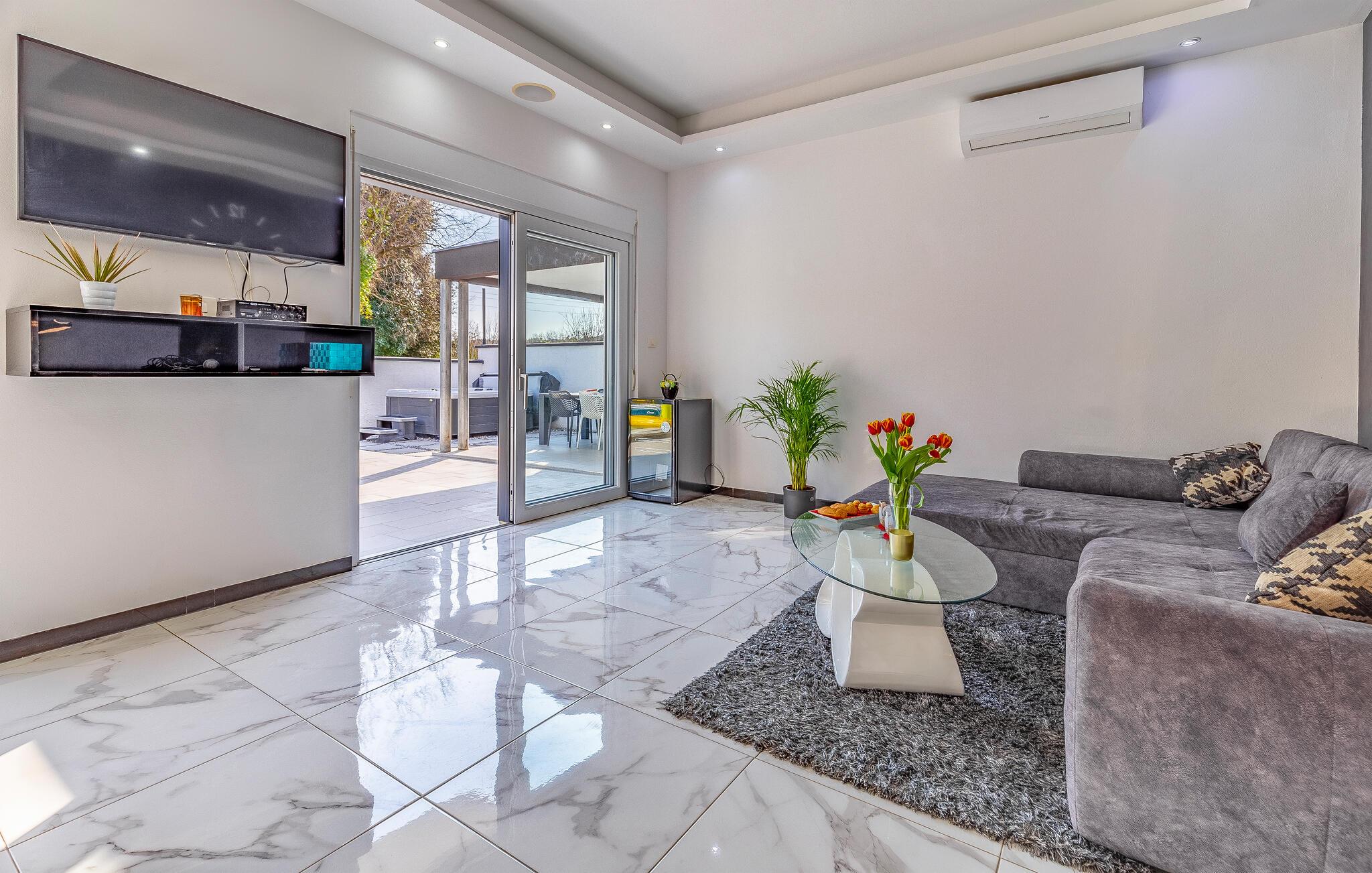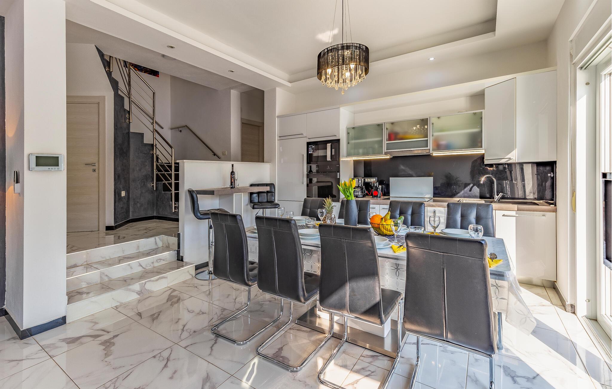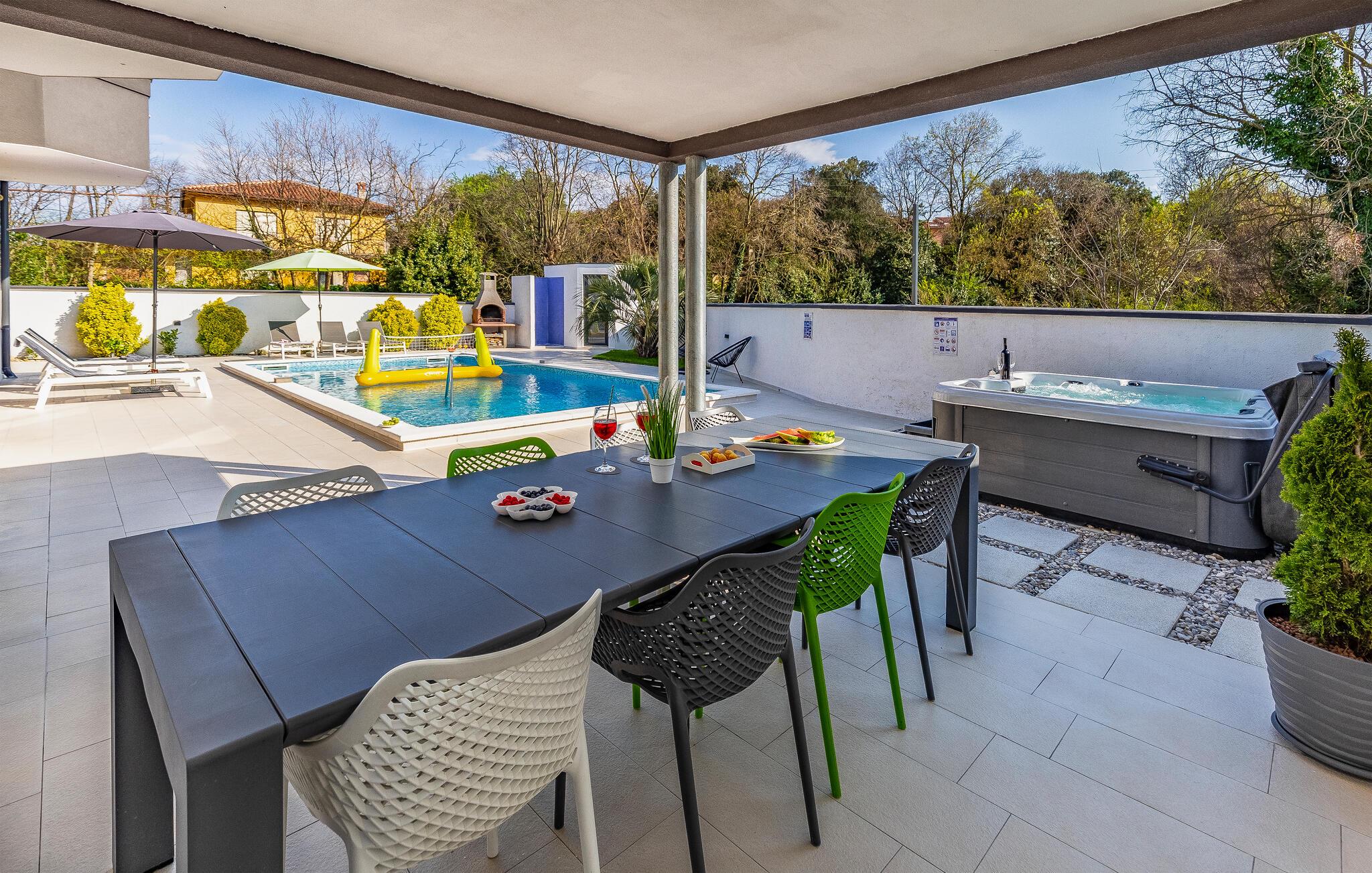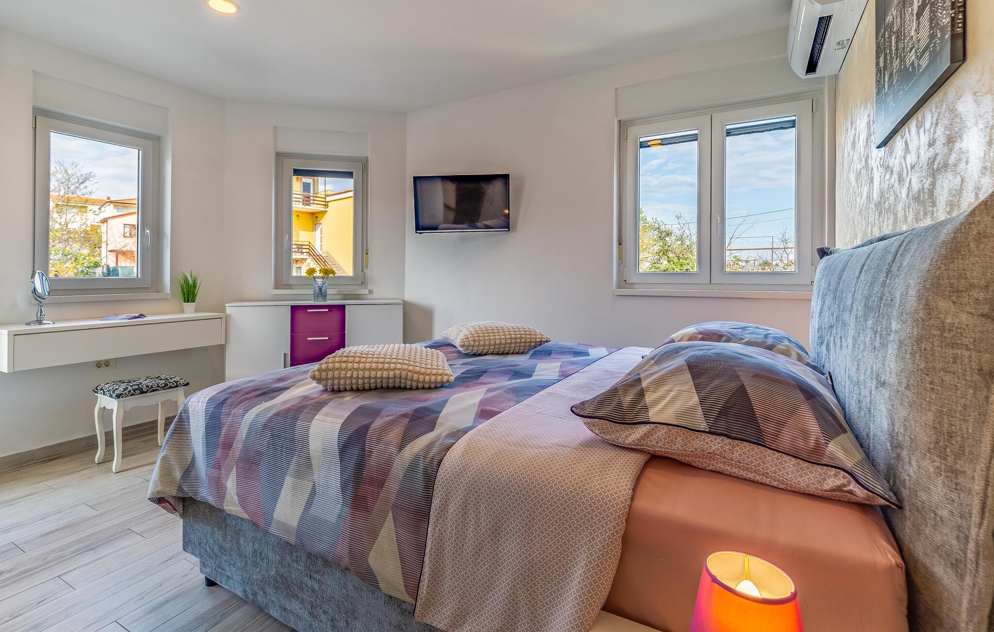 I den lille by Štinjan, ikke langt fra Pula, ligger dette dejlige hus med privat tilhørende pool. De rolige omgivelser er perfekte til en afslappet ferie. Husets er fordelt på to etager der er bekvemt indrettet med stue i åben forbindelse med køkken og spiseafdeling, et gæstetoilet og et soveværelse med badeværelse en suite i stueplan. En sauna i huset skaber de perfekte rammer for velvære og afslapning. Fra stuen er der en dejlig udsigt over både poolen og haven. På første sal er der tre soveværelser, hver med balkon, det ene soveværelse har badeværelse en suite og de to andre deles om et badeværelse nummer to. I haven står grillen parat til nem og lækker mad og mens maden steger færdig, kan I tage en dejlig svømmetur i poolen.