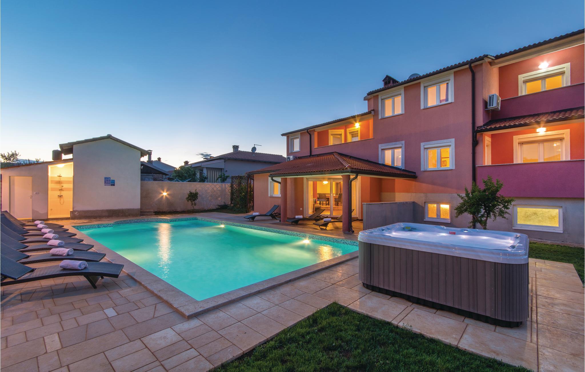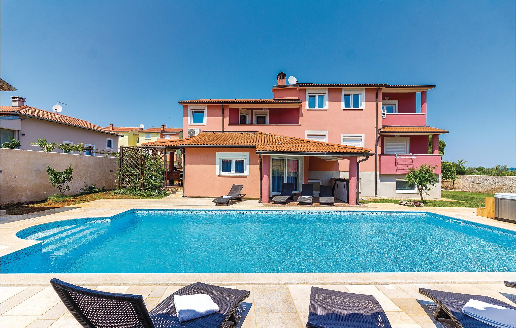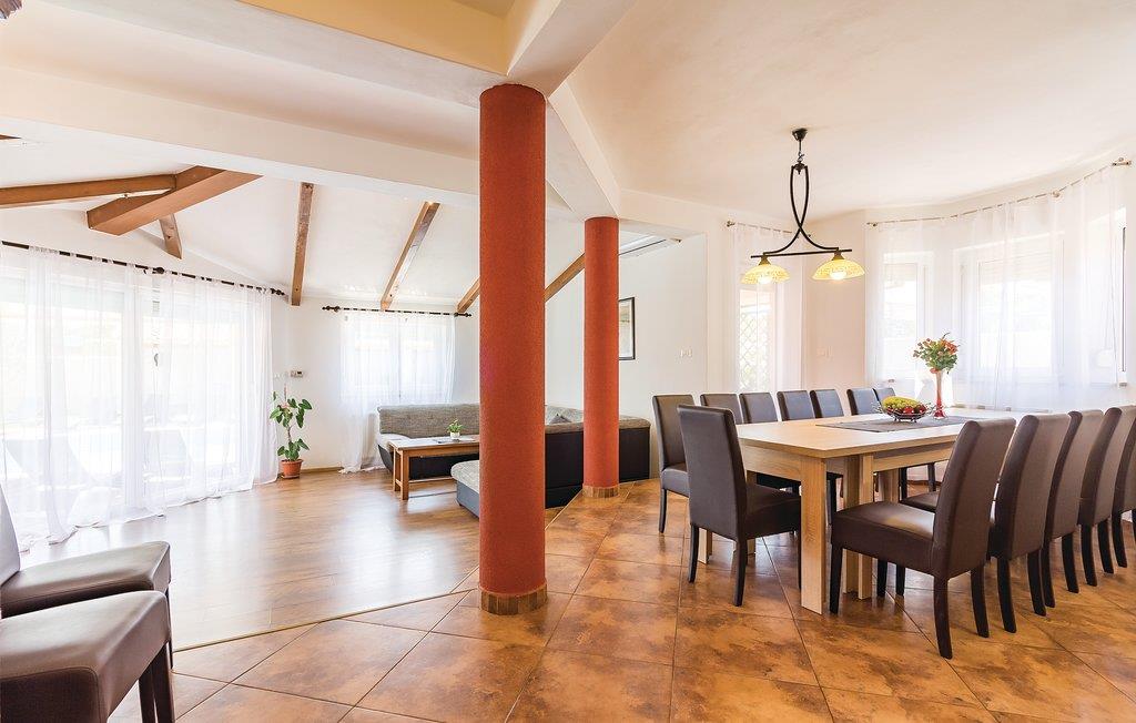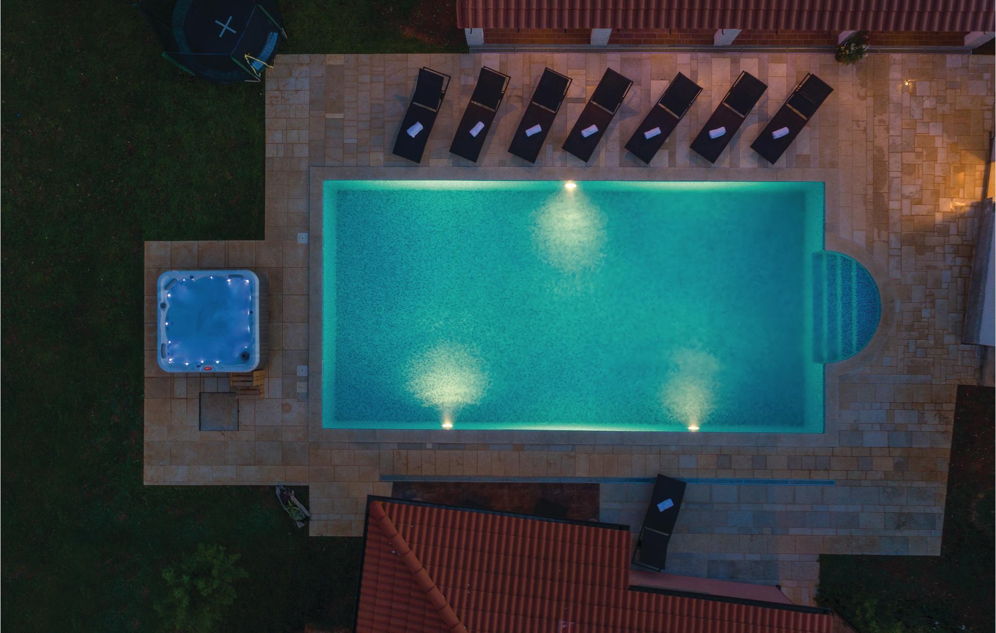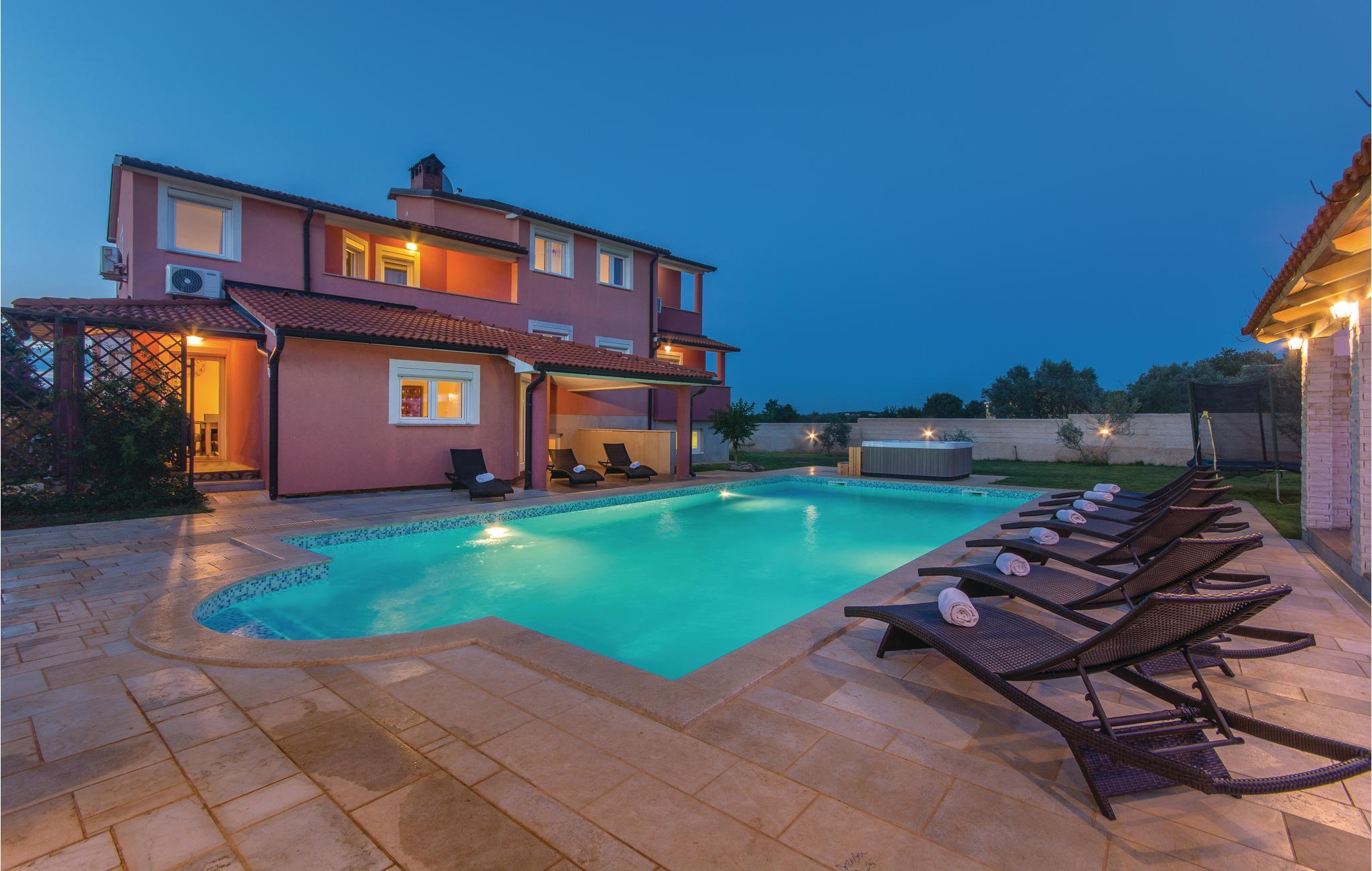 værelser er fordelt over to etager og består af i alt syv soveværelser og fire badeværelser. På ejendommen er der en stor swimmingpool og en whirlpool. Tag en tur langs havnefronten i nabobyen Fažana, som byder på mange barer og fremragende restauranter. Fra Fažana kan I også sejle til nationalparken på Brijuni-øerne. Hust også at besøge det romerske amfiteater og naturparken Kamenjak i feriebyen Premantura.