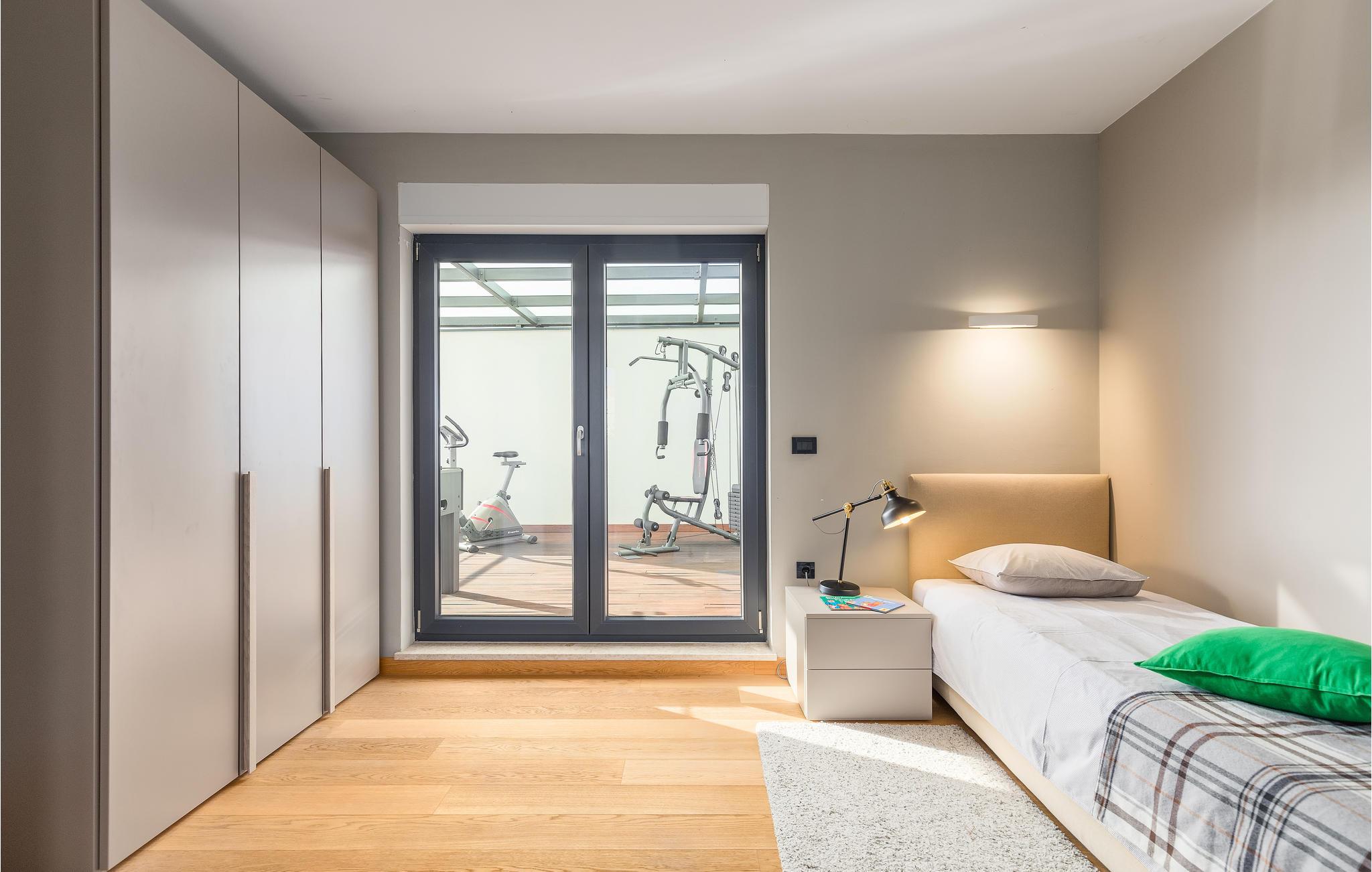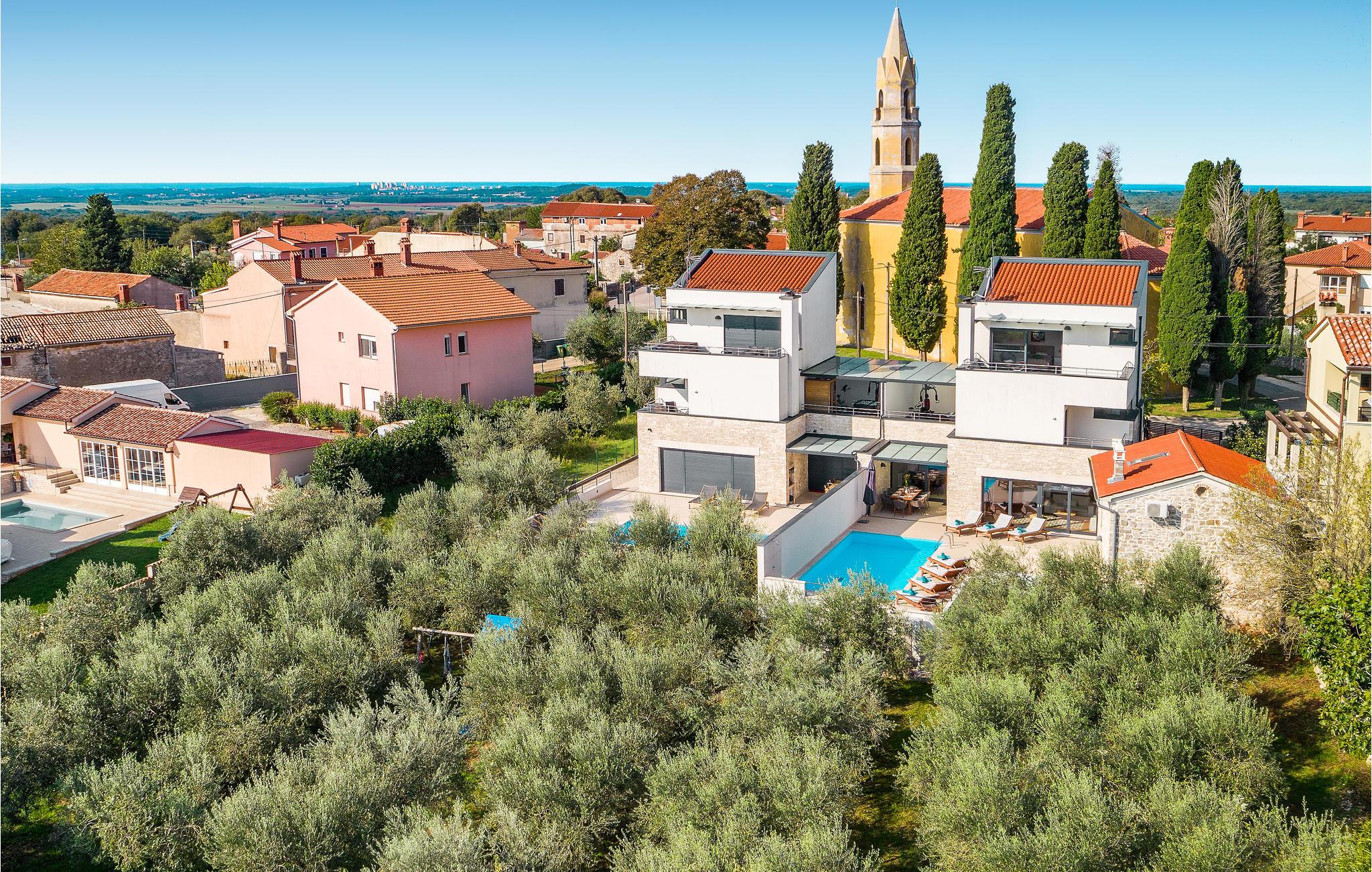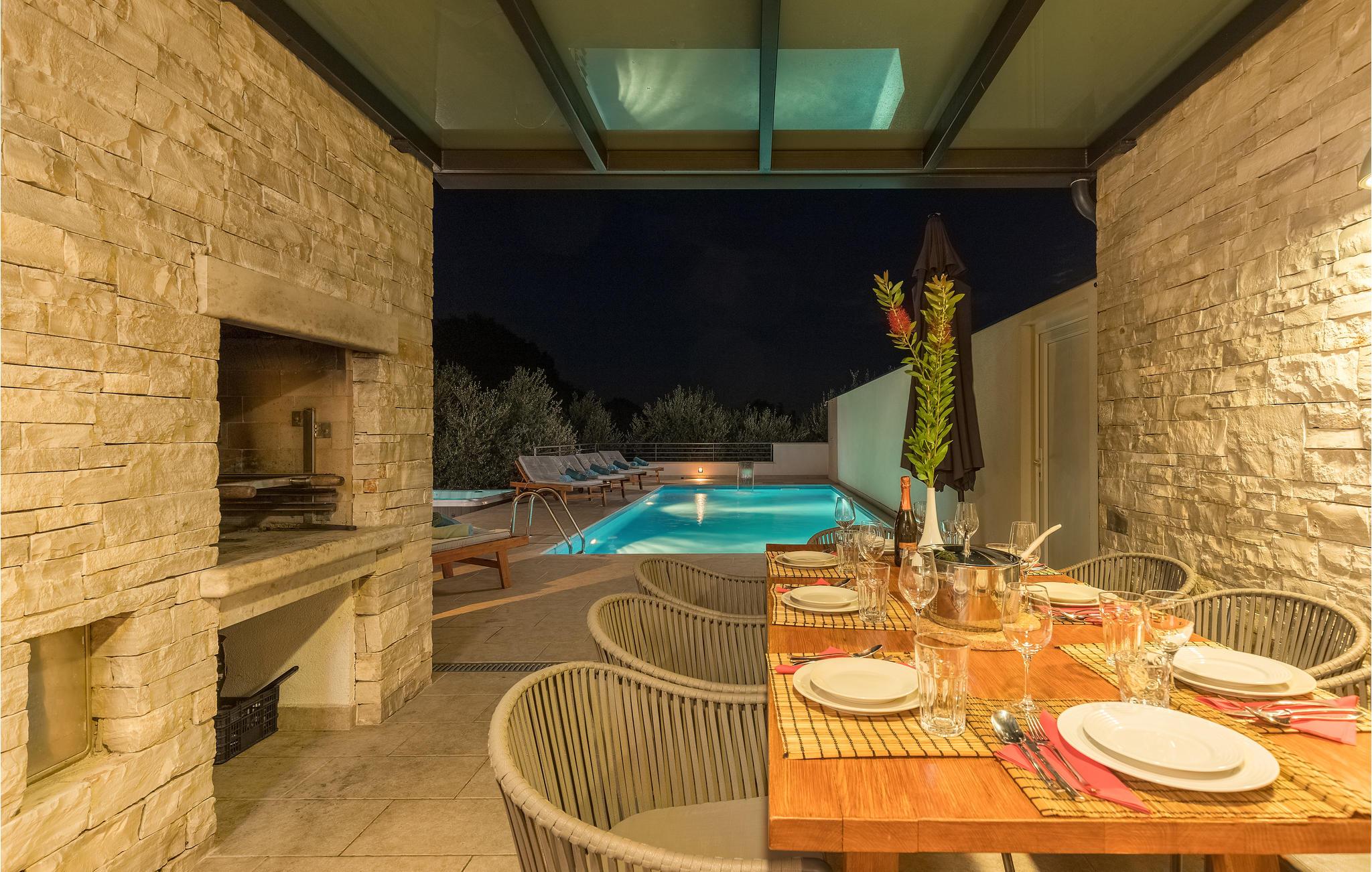 Det smukt møblerede interiør i hovedhuset strækker sig over tre etager, og den øverste terrasse tilbyder en vidunderlig panoramaudsigt over havet og naturen. En mindre bygning på ca. 40 m2 er bygget af sten og ligger ved siden af ??poolen og har plads til to personer. Huset består af et køkken med spiseplads, et badeværelse og en hems med en dobbeltseng. Din ferie suppleres med fitnessudstyr, sauna og boblebad til fem personer. Foruden den opvarmede pool finder du forskellige faciliteter til børn og en smuk olivenlund på den indhegnede ejendom.