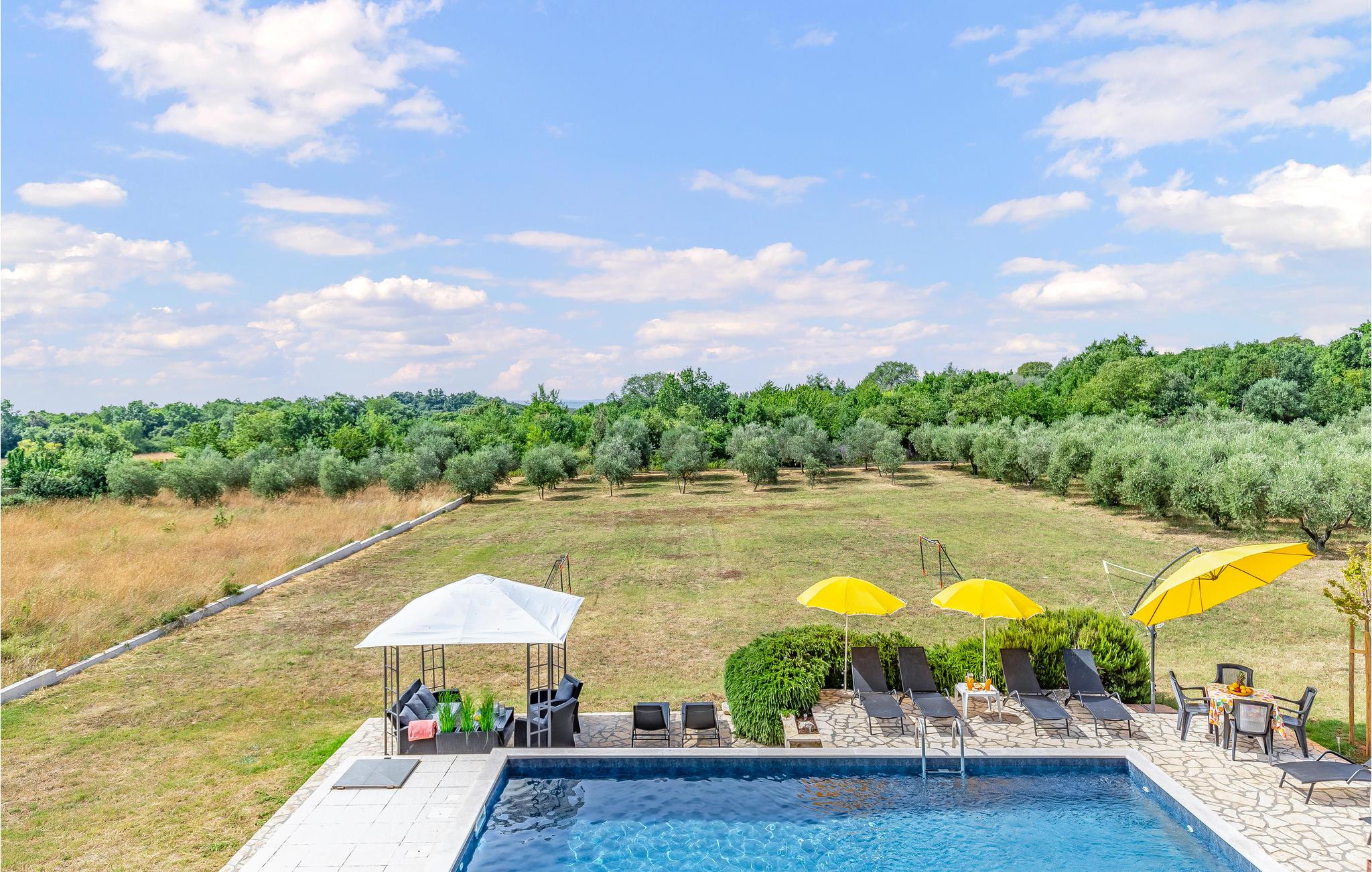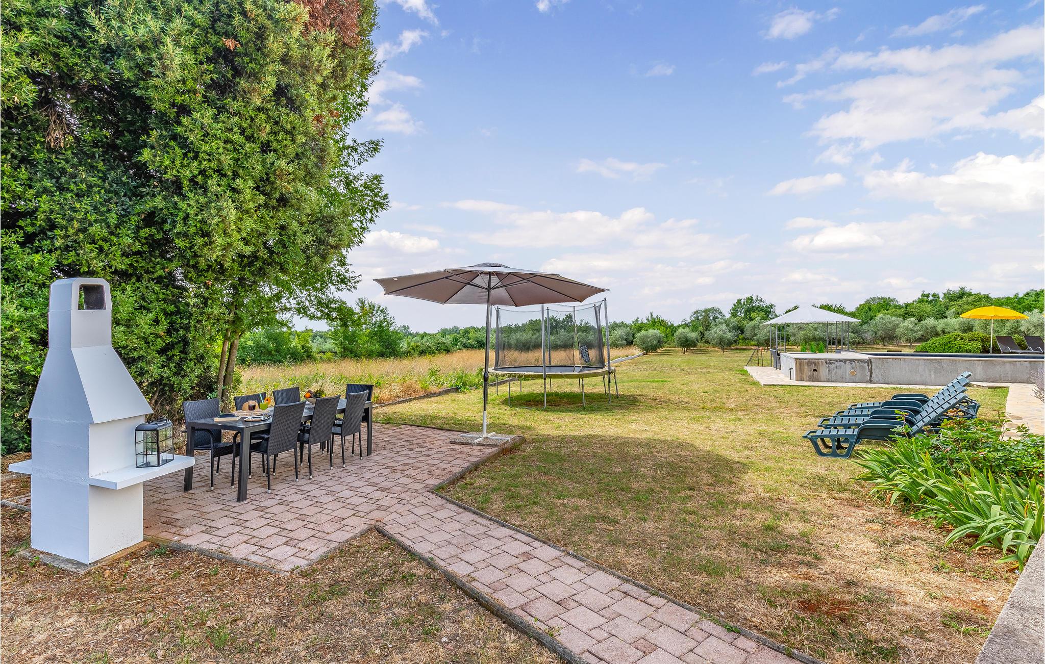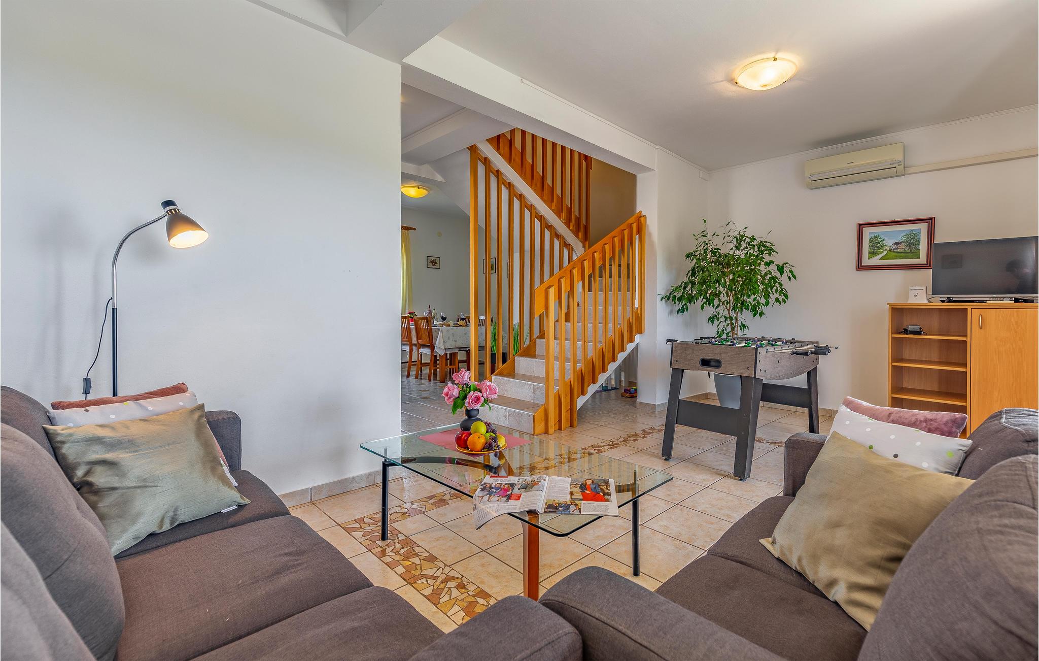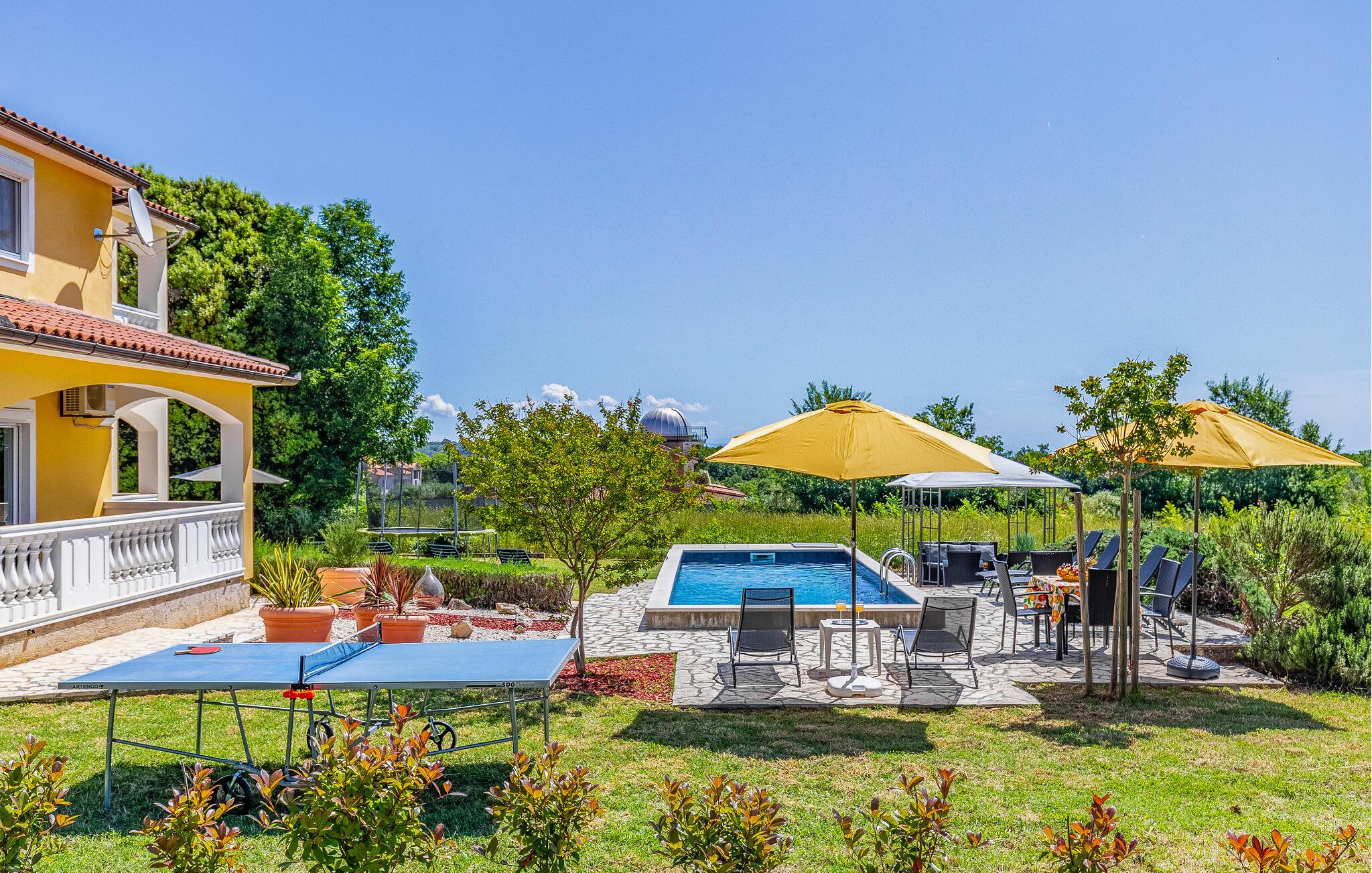Dette dejlige feriehus består af tre boliger, som er forbundet af en udetrappe. Alle boligenenhederne er med klimaanlæg og fuldt udstyrede køkkener. Huset er velegnet til 3 familier eller en gruppe venner som ønsker at holde ferie sammen, men stadig nyde deres privatliv i deres værelser. Der er flere terrasser tilrådighed til gæsterne. På grunden er der swimmingpool, i hvis kant er mange behagelige solsenge og flere store parasoller. På grunden er også en legeplads til familiens børn. Den store terrasse med grill inviterer til mange hyggestunder både dage og aften. Ikke langt fra Valtura liggger udgravningerne af Nesakcium, som er den ældste by i Istrien. Nesakcium stammer tilbage fra romertiden. Få minutter fra huset i bil ligger der skønne sten og grusstrande med krystalklart vand. Pak picnickurven og tilbring den dejlige lange sommedag ved og i vandet.