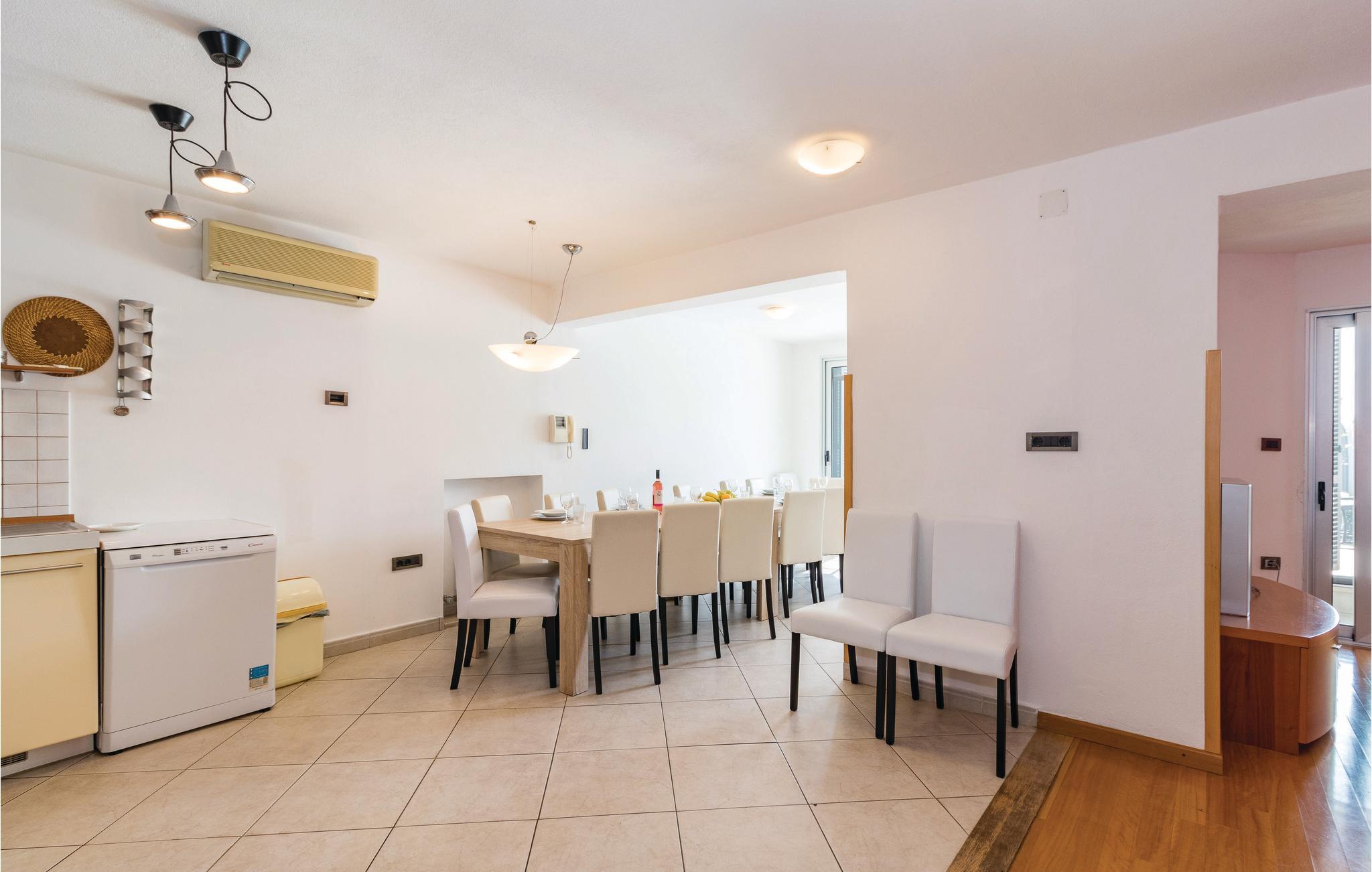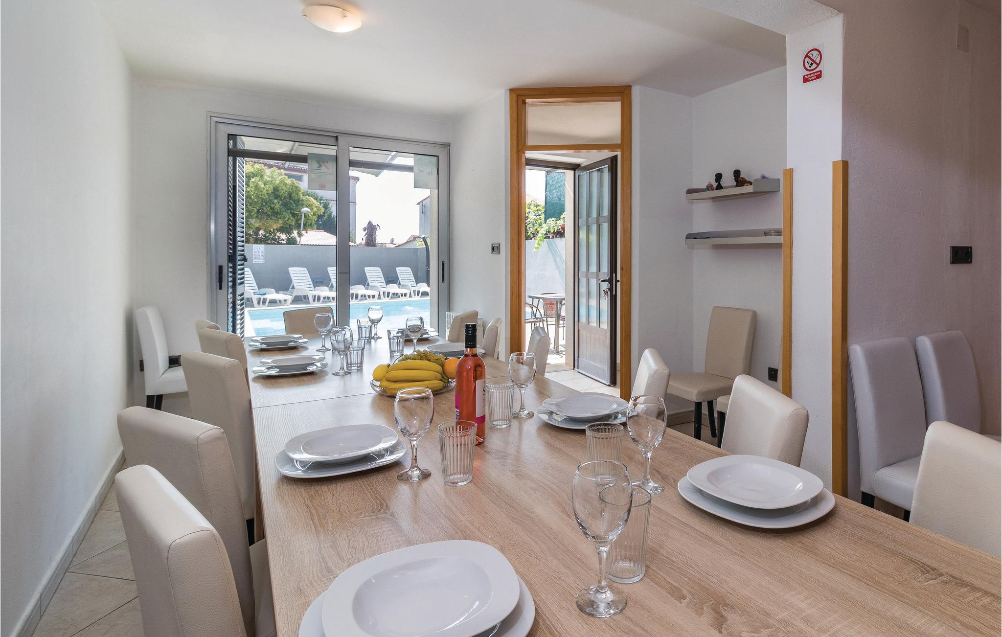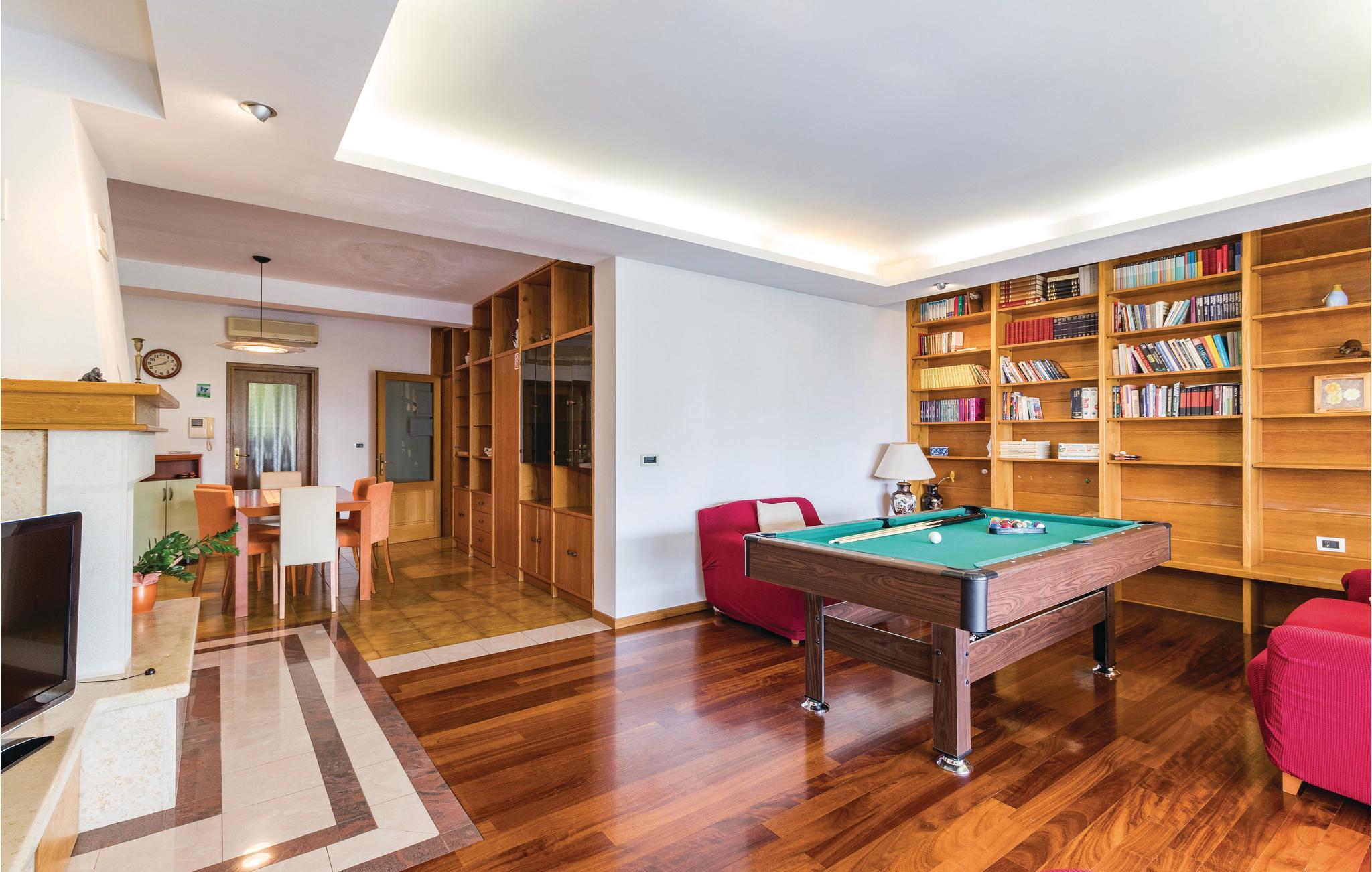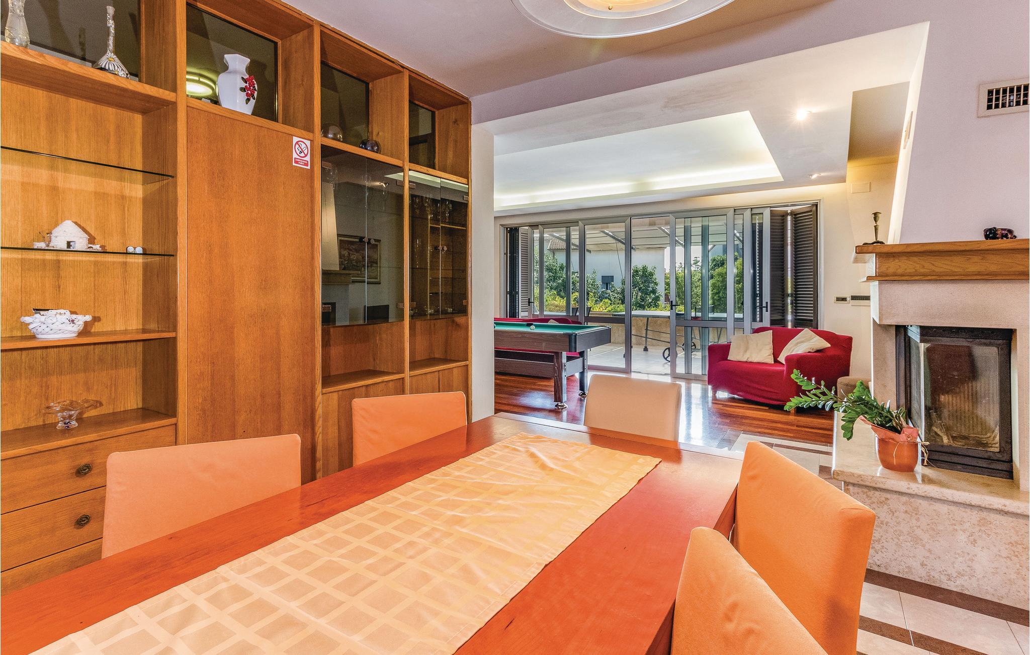 Dette rækkehus ligger i en forstad til Pula, blot et få minutters spadseretur fra de skønne bystrande. Huset er ideelt til et større selskab. I stueplan ligger fitnessrummet, saunaen og en fælles spisestue kombineret med køkken. Foran køkkenet ligger terrassen, hvor grillen står. På første sal ligger den rummelige stue, endnu et fuldt udstyret køkken, en terrasse og to soveværelser. På anden sal er der fire soveværelser, mens der ligger tre soveværelser på tagetagen. Det ene af disse har udgang til en skøn terrasse med havudsigt. I kan tage en dejlig svømmetur i poolen, som er udstyret med massagebad. I byens centrum er der mange seværdigheder fra antikken og sjov underholdning, især i løbet af højsommeren. Til huset hører også en garage.