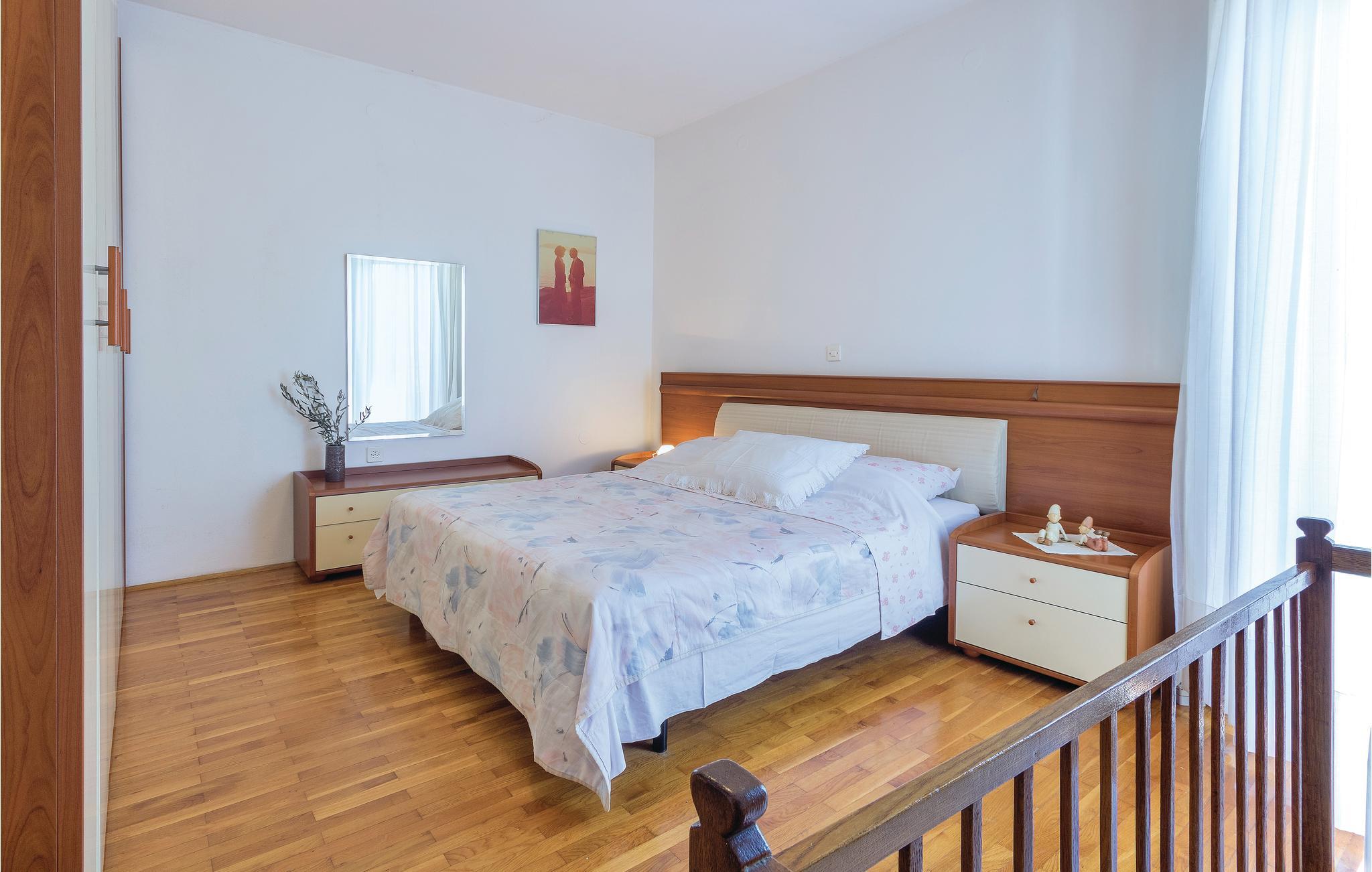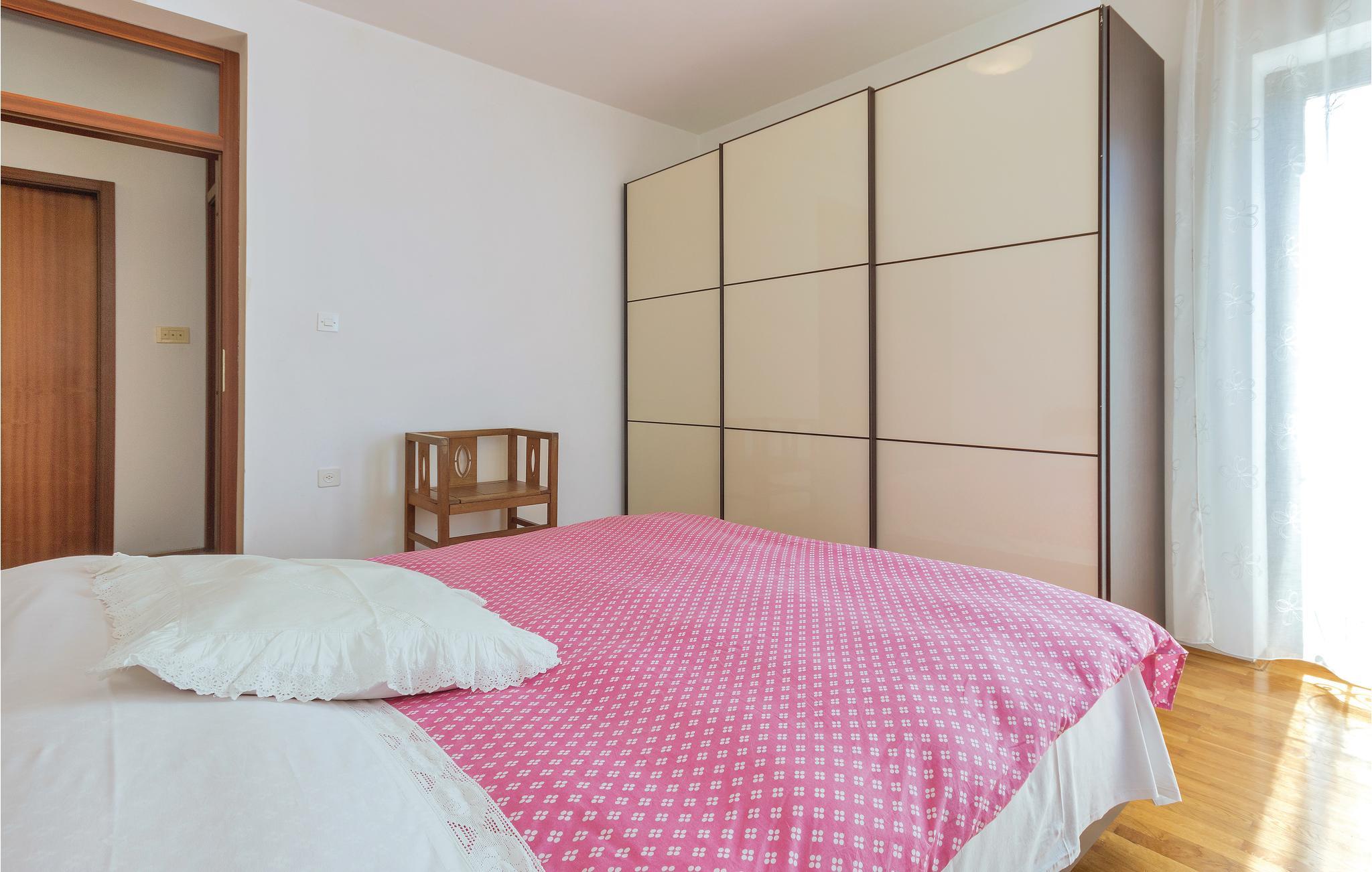 Denne rummelige ferielejlighed har en stor terrasse, ligger i en ejendom i et roligt område i udkanten af byen, et godt valg til en sommerferie ved havet. På første sal ligger stuen med spiseafdeling og køkken, et badeværelse og et køkken. På en mellemetage ligger de tre andre soveværelse og lejlighedens badeværelse no. to. I kan især glæde jer til lejlighedens overdækkede terrasse hvorfra I kan nyde udsigten over haven. Slap af i havens skygge ved den fælles grill – og når I har spist, er det oplagt at gå en tur gennem Pulas gamle bydel, hvor der altid er noget at se og opleve gennem sommeren, eller langs Fažanas skønne strandpromenade.